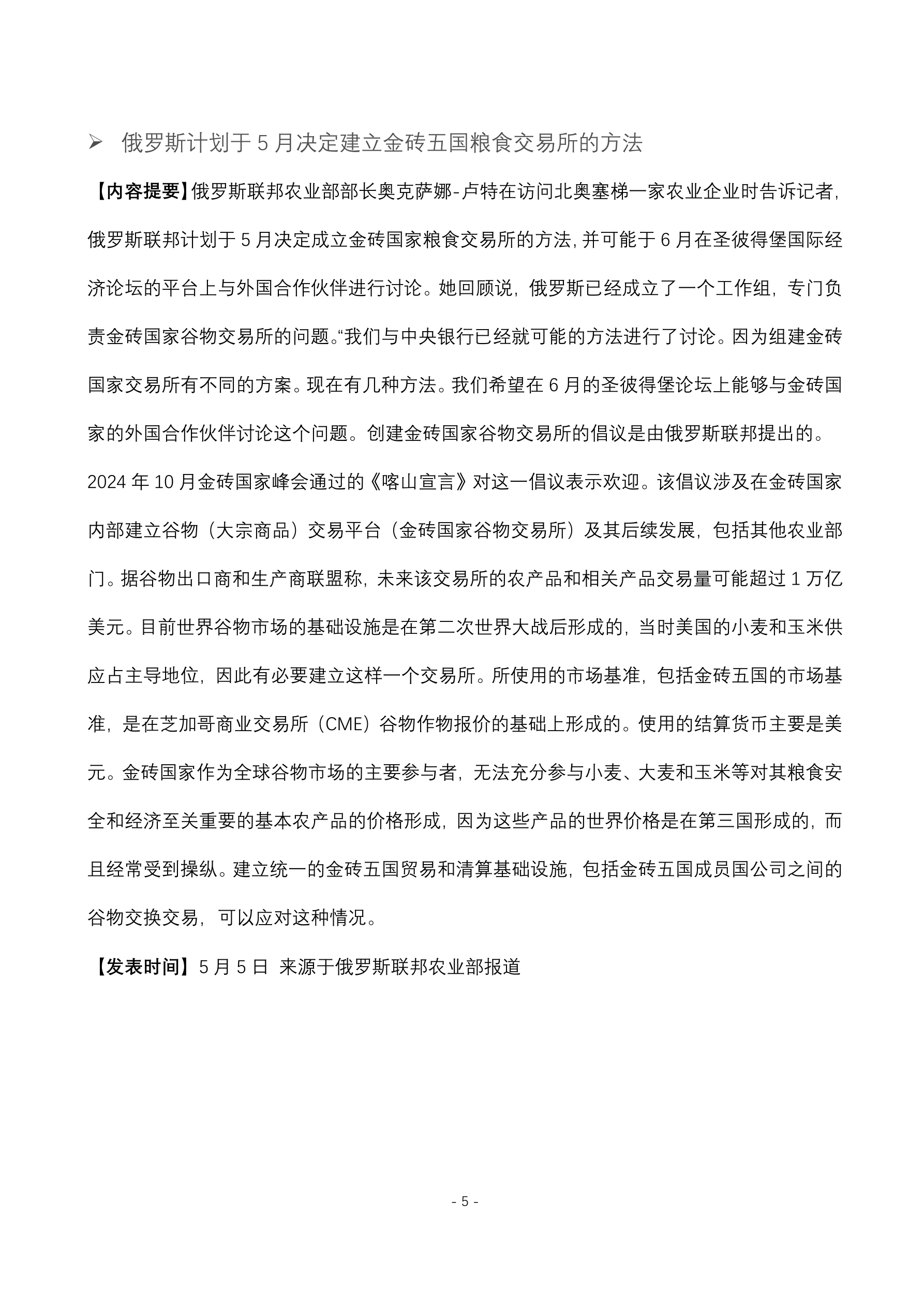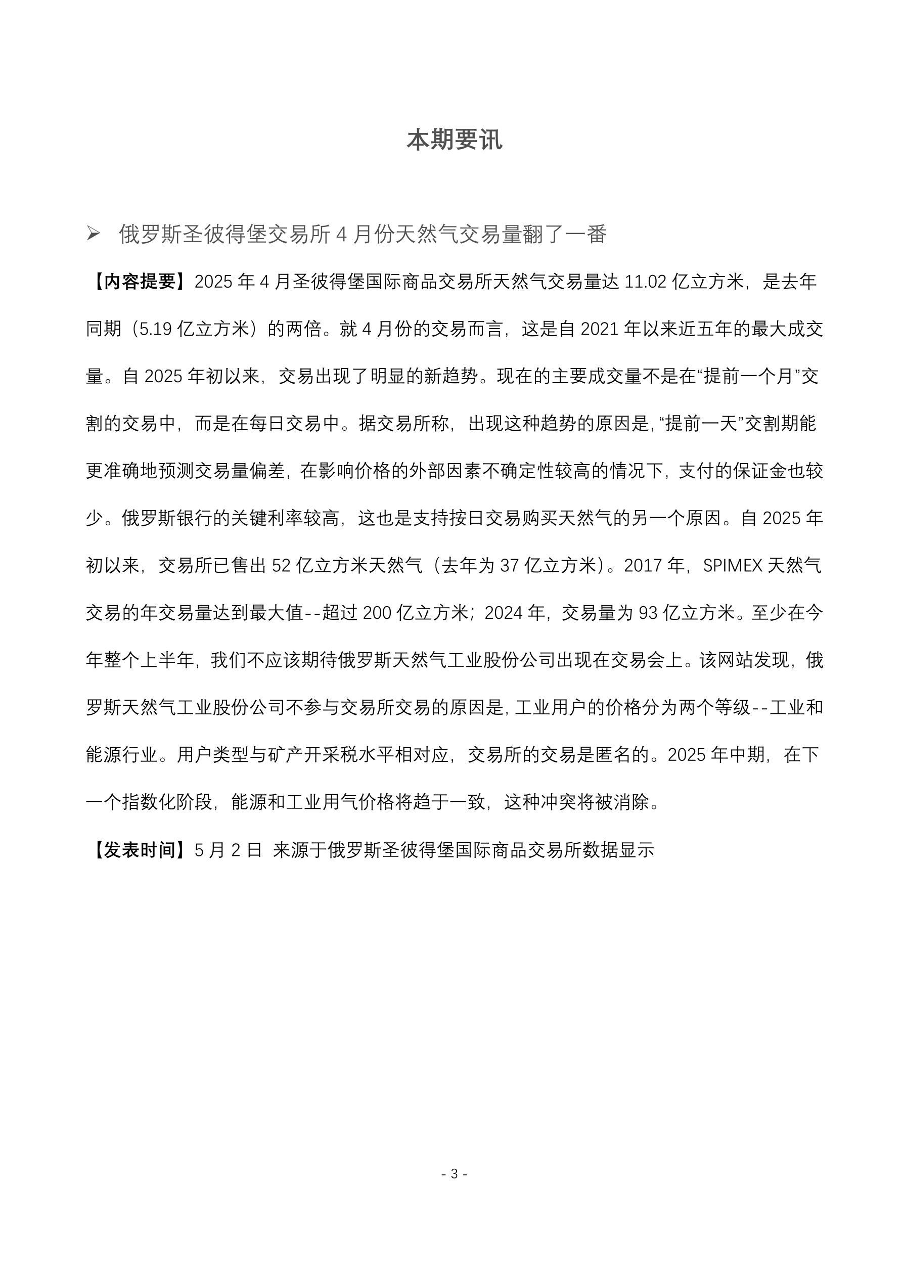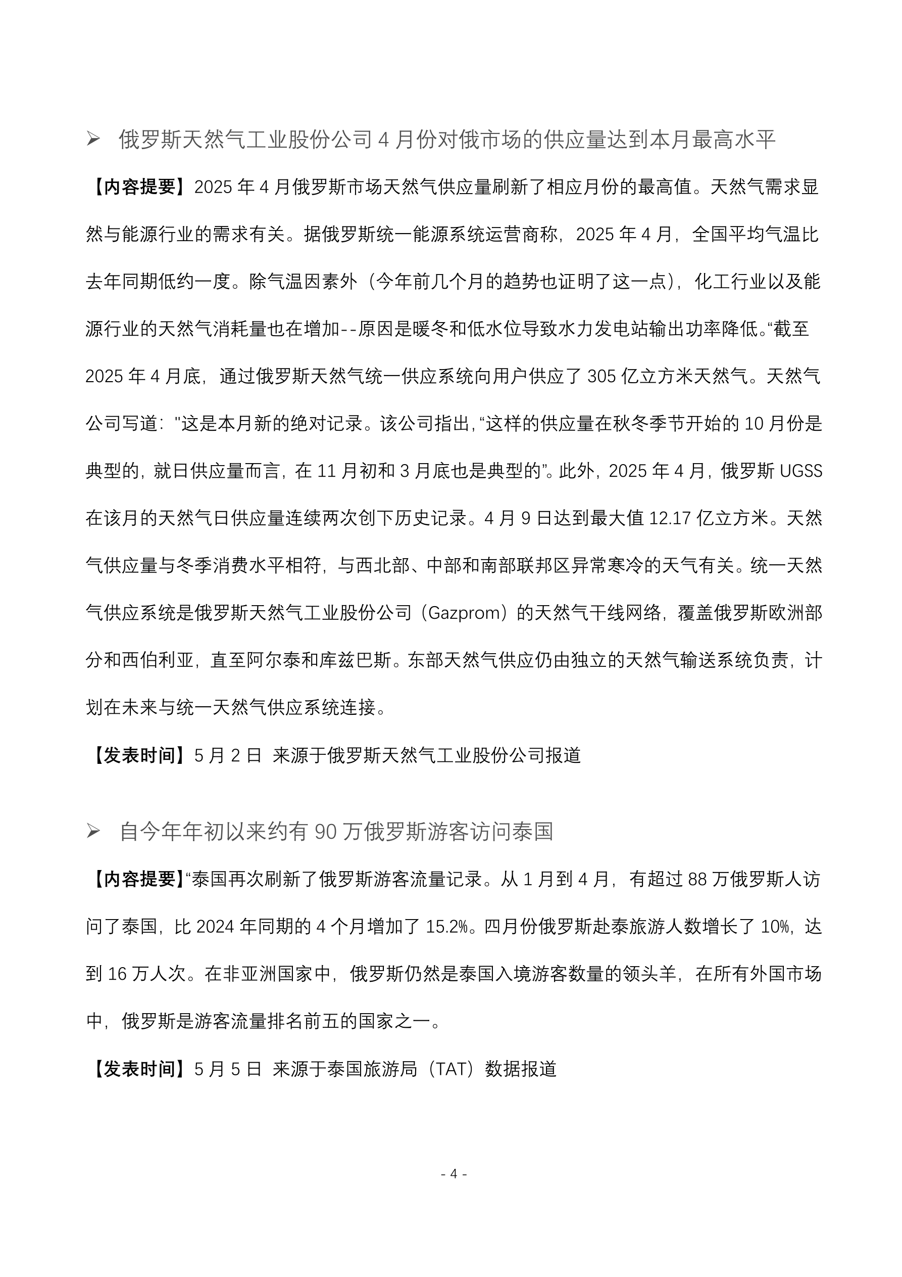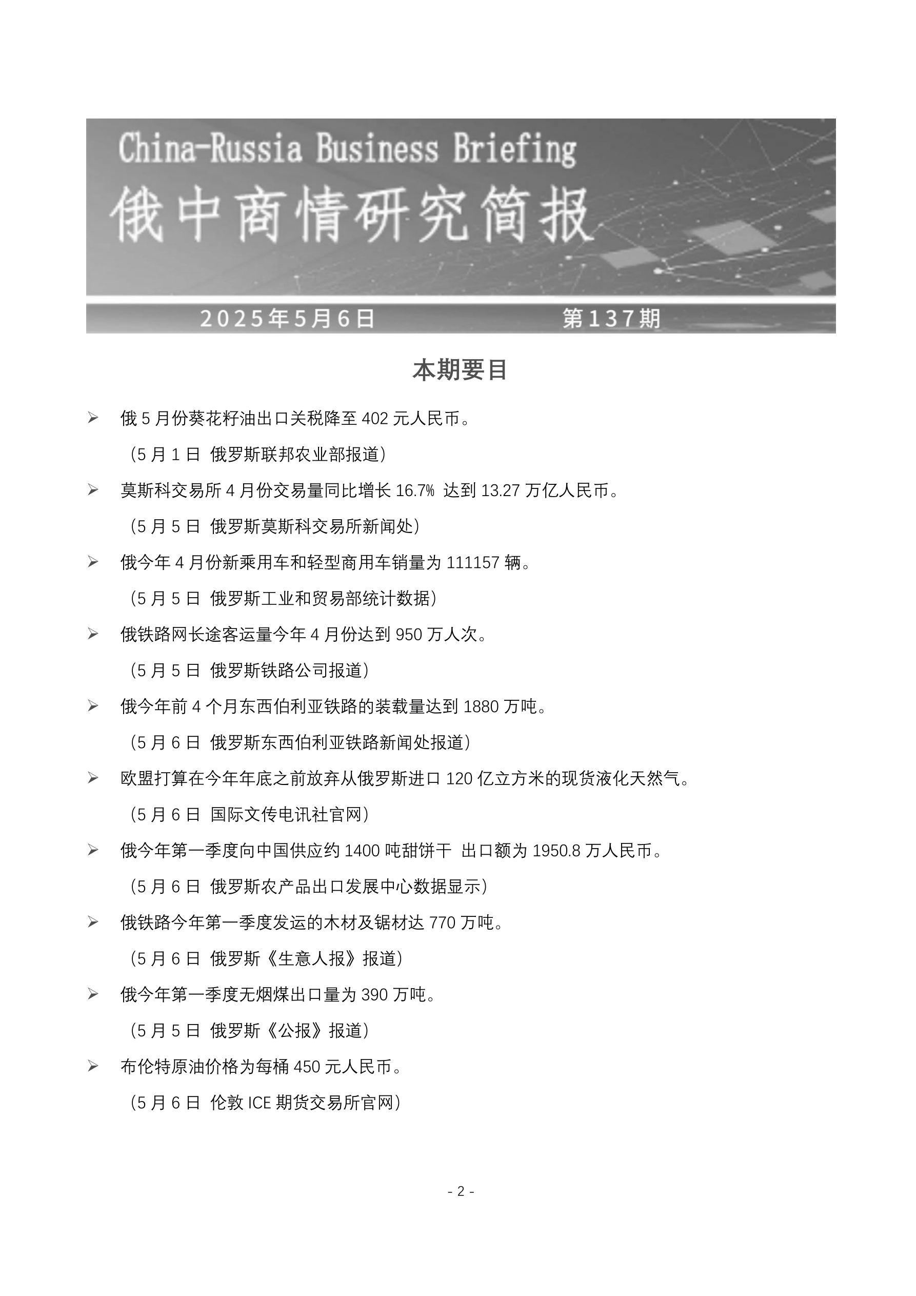 俄 5 月份葵花籽油出口关税降至 402 元人民币。 (5 月 1 日 俄罗斯联邦农业部报道) 莫斯科交易所 4 月份交易量同比增长 16.7% 达到 13.27 万亿人民币。 (5 月 5 日 俄罗斯莫斯科交易所新闻处) 俄今年 4 月份新乘用车和轻型商用车销量为 111157 辆。 (5 月 5 日 俄罗斯工业和贸易部统计数据) 俄铁路网长途客运量今年 4 月份达到 950 万人次。 (5 月 5 日 俄罗斯铁路公司报道) 俄今年前 4 个月东西伯利亚铁路的装载量达到 1880 万吨。 (5 月 6 日 俄罗斯东西伯利亚铁路新闻处报道) 欧盟打算在今年年底之前放弃从俄罗斯进口 120 亿立方米的现货液化天然气。 (5 月 6 日 国际文传电讯社官网) 俄今年第一季度向中国供应约 1400 吨甜饼干 出口额为 1950.8 万人民币。 (5 月 6 日 俄罗斯农产品出口发展中心数据显示) 俄铁路今年第一季度发运的木材及锯材达 770 万吨。 (5 月 6 日 俄罗斯《生意人报》报道) 俄今年第一季度无烟煤出口量为 390...