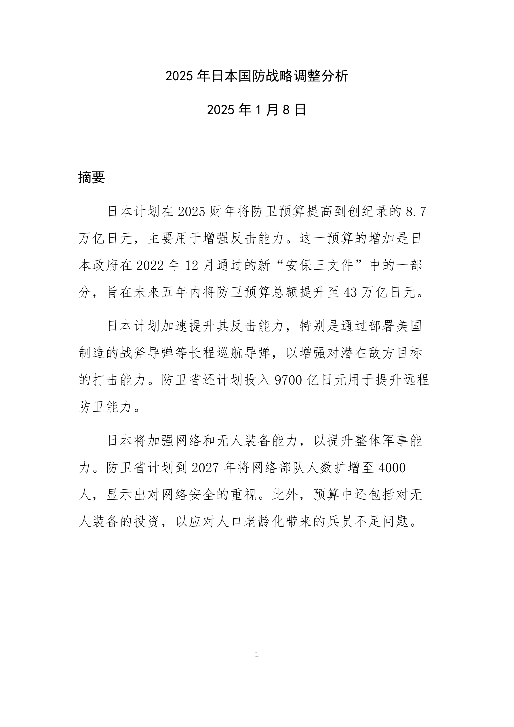 摘要 日本计划在 2025 财年将防卫预算提高到创纪录的 8.7 万亿日元,主要用于增强反击能力。这一预算的增加是日 本政府在 2022 年 12 月通过的新“安保三文件”中的一部 分,旨在未来五年内将防卫预算总额提升至 43 万亿日元。 日本计划加速提升其反击能力,特别是通过部署美国 制造的战斧导弹等长程巡航导弹,以增强对潜在敌方目标 的打击能力。防卫省还计划投入 9700 亿日元用于提升远程 防卫能力。 日本将加强网络和无人装备能力,以提升整体军事能 力。防卫省计划到 2027 年将网络部队人数扩增至 4000 人,显示出对网络安全的重视。此外,预算中还包括对无 人装备的投资,以应对人口老龄化带来的兵员不足问题。