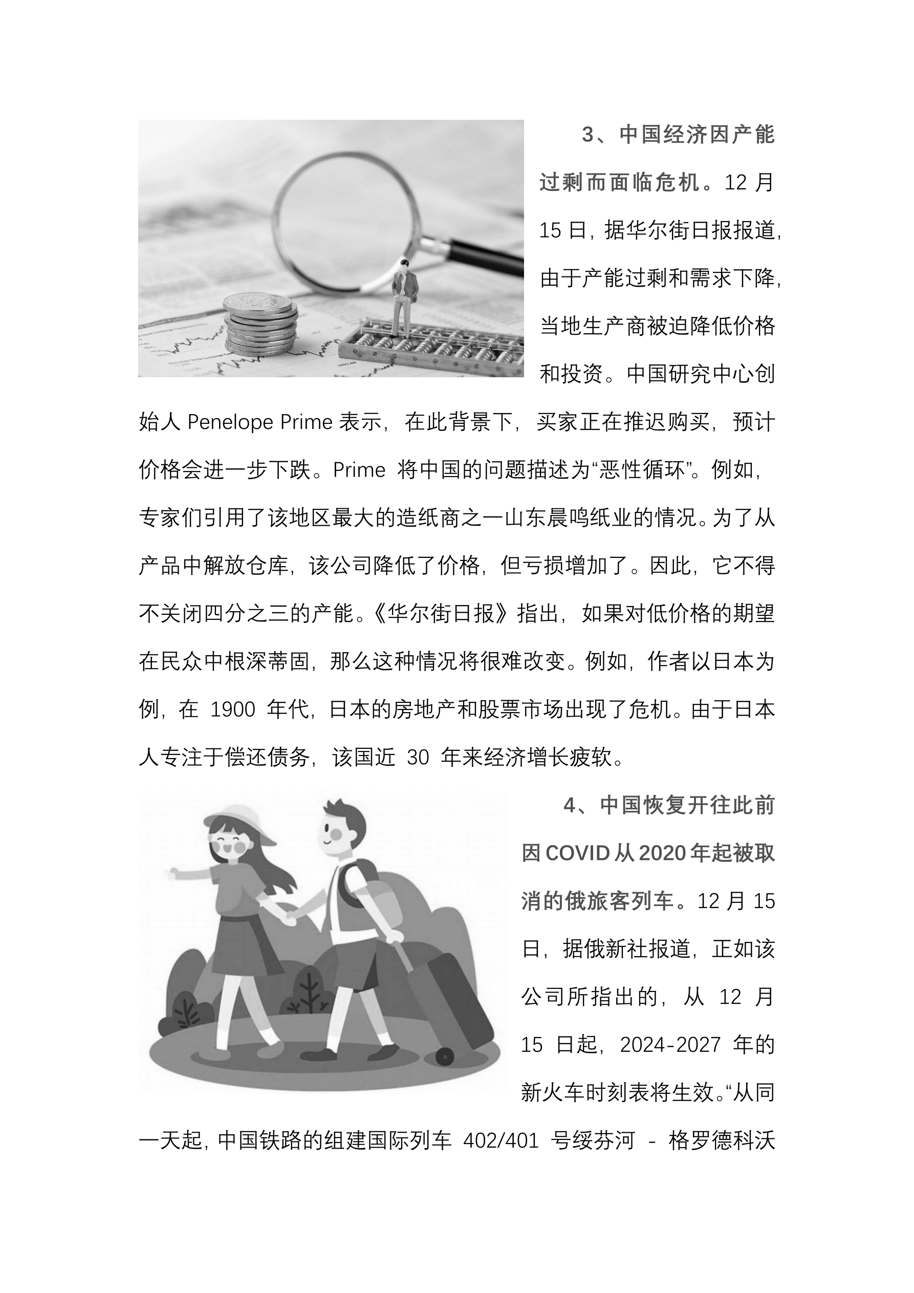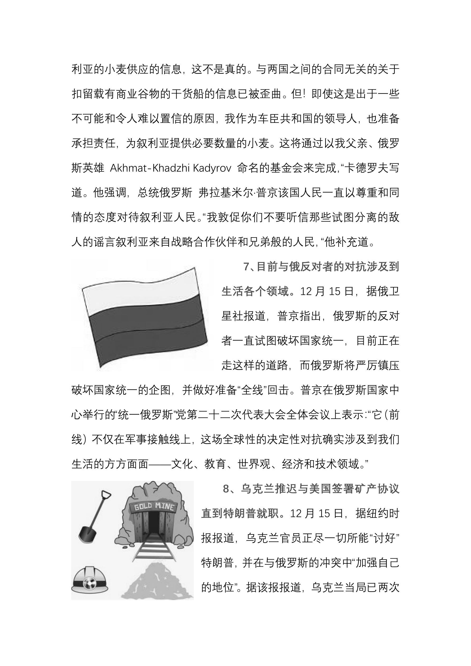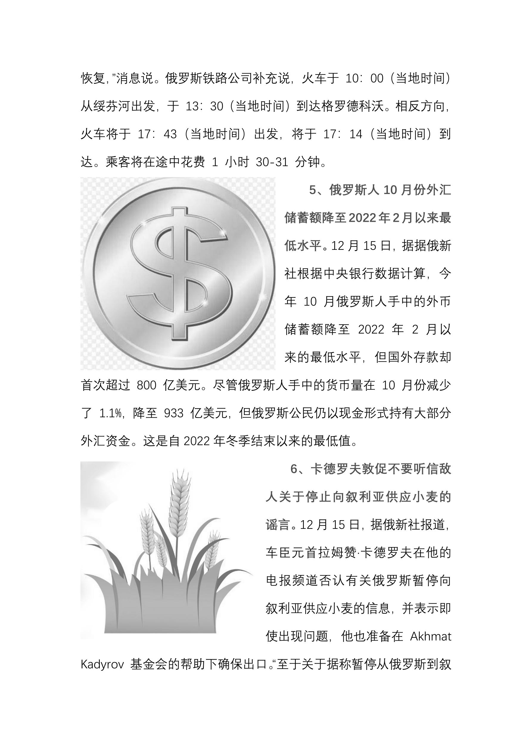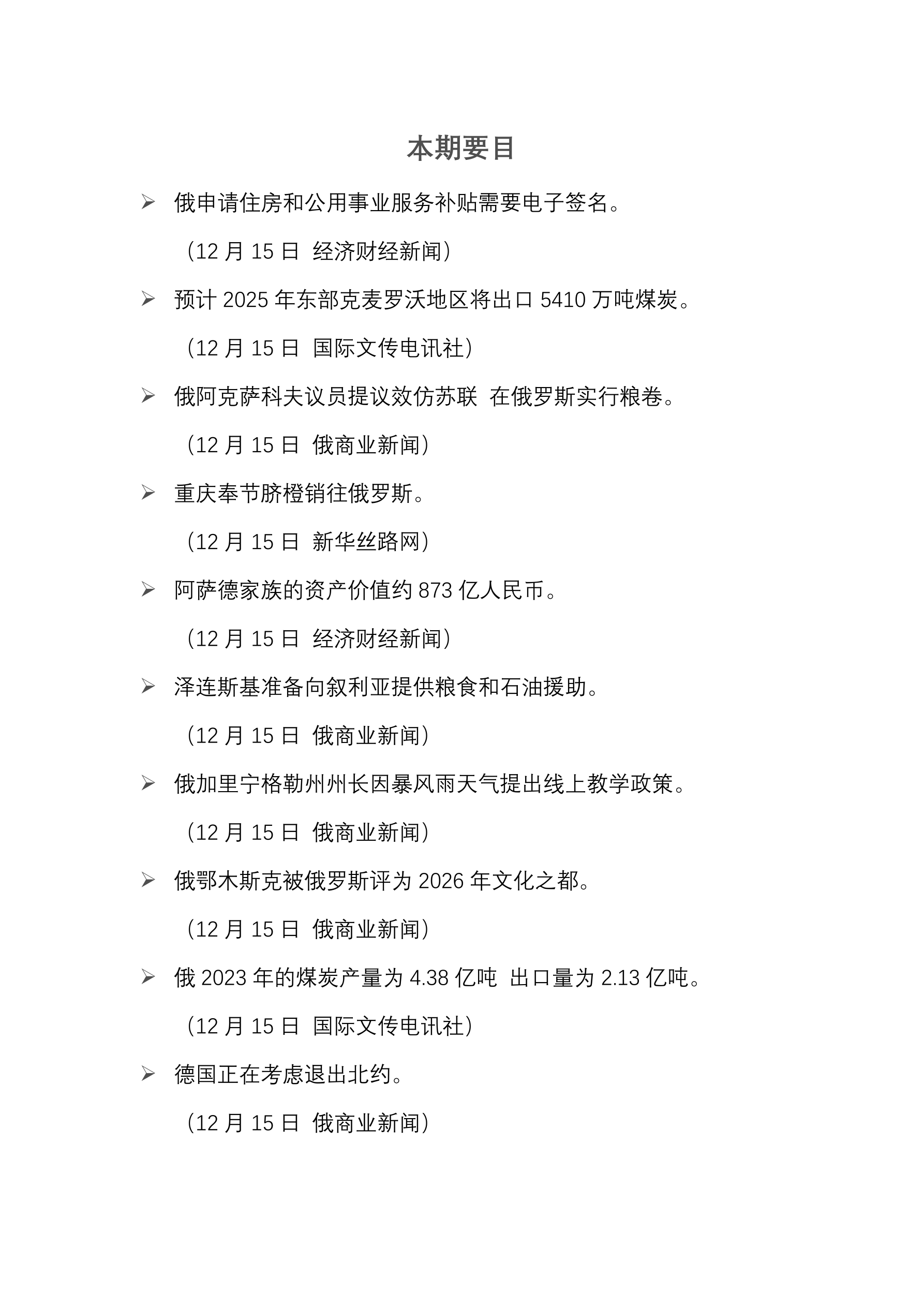 俄申请住房和公用事业服务补贴需要电子签名。 (12 月 15 日 经济财经新闻) 预计 2025 年东部克麦罗沃地区将出口 5410 万吨煤炭。 (12 月 15 日 国际文传电讯社) 俄阿克萨科夫议员提议效仿苏联 在俄罗斯实行粮卷。 (12 月 15 日 俄商业新闻) 重庆奉节脐橙销往俄罗斯。 (12 月 15 日 新华丝路网) 阿萨德家族的资产价值约 873 亿人民币。 (12 月 15 日 经济财经新闻) 泽连斯基准备向叙利亚提供粮食和石油援助。 (12 月 15 日 俄商业新闻) 俄加里宁格勒州州长因暴风雨天气提出线上教学政策。 (12 月 15 日 俄商业新闻) 俄鄂木斯克被俄罗斯评为 2026 年文化之都。 (12 月 15 日 俄商业新闻) 俄 2023 年的煤炭产量为 4.38 亿吨 出口量为 2.13 亿吨。 (12 月 15 日 国际文传电讯社) 德国正在考虑退出北约。 (12 月 15 日 俄商业新闻)