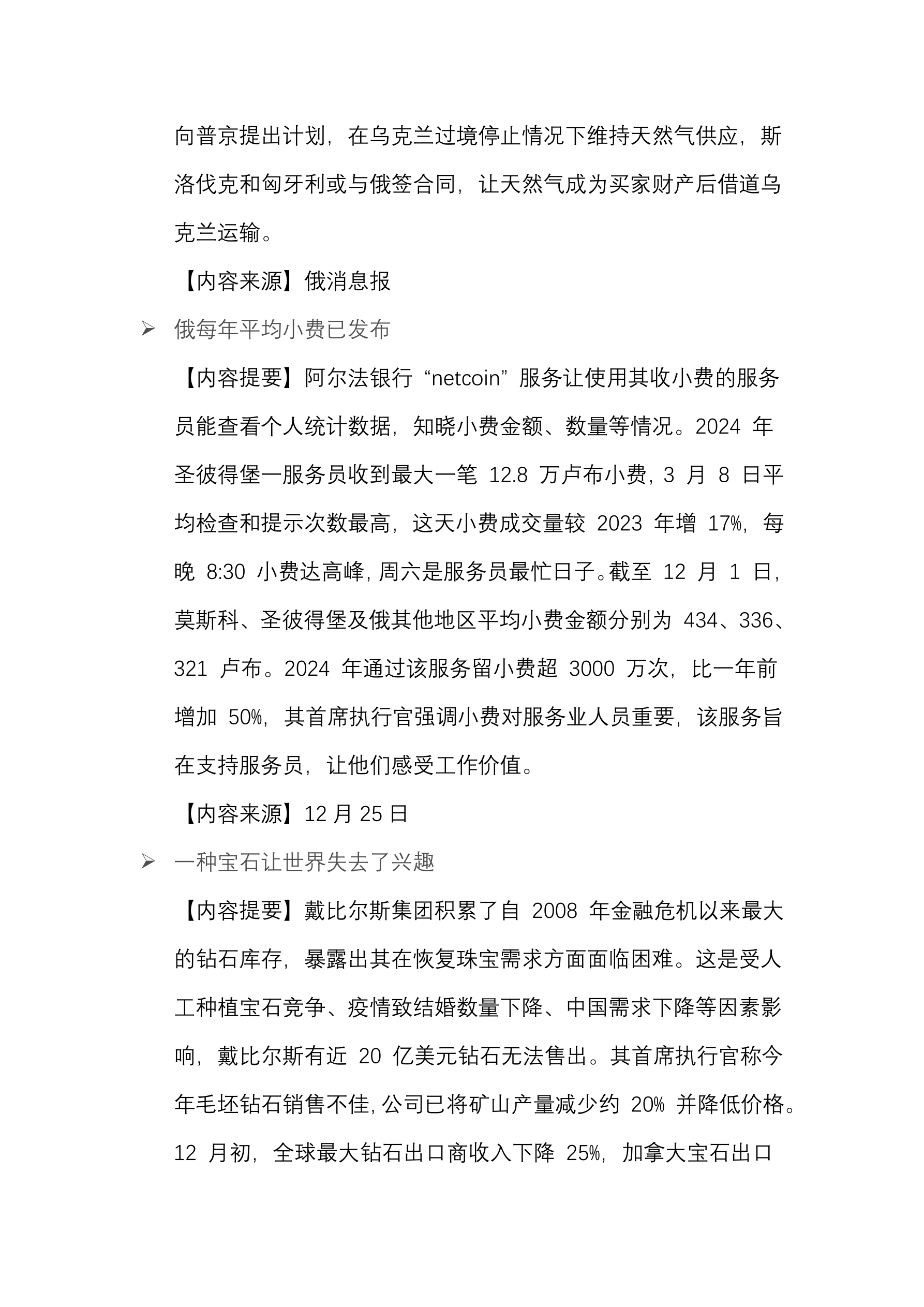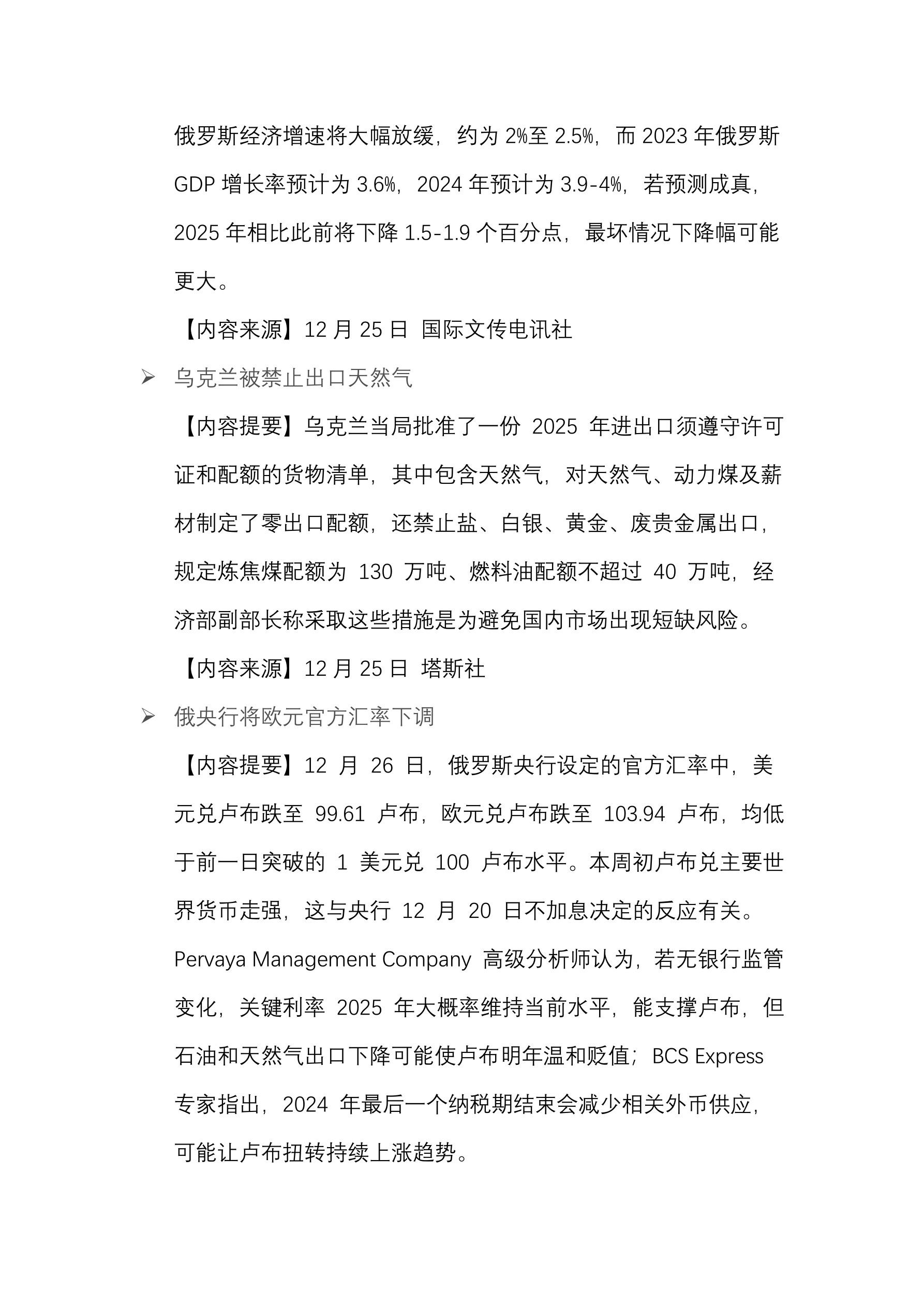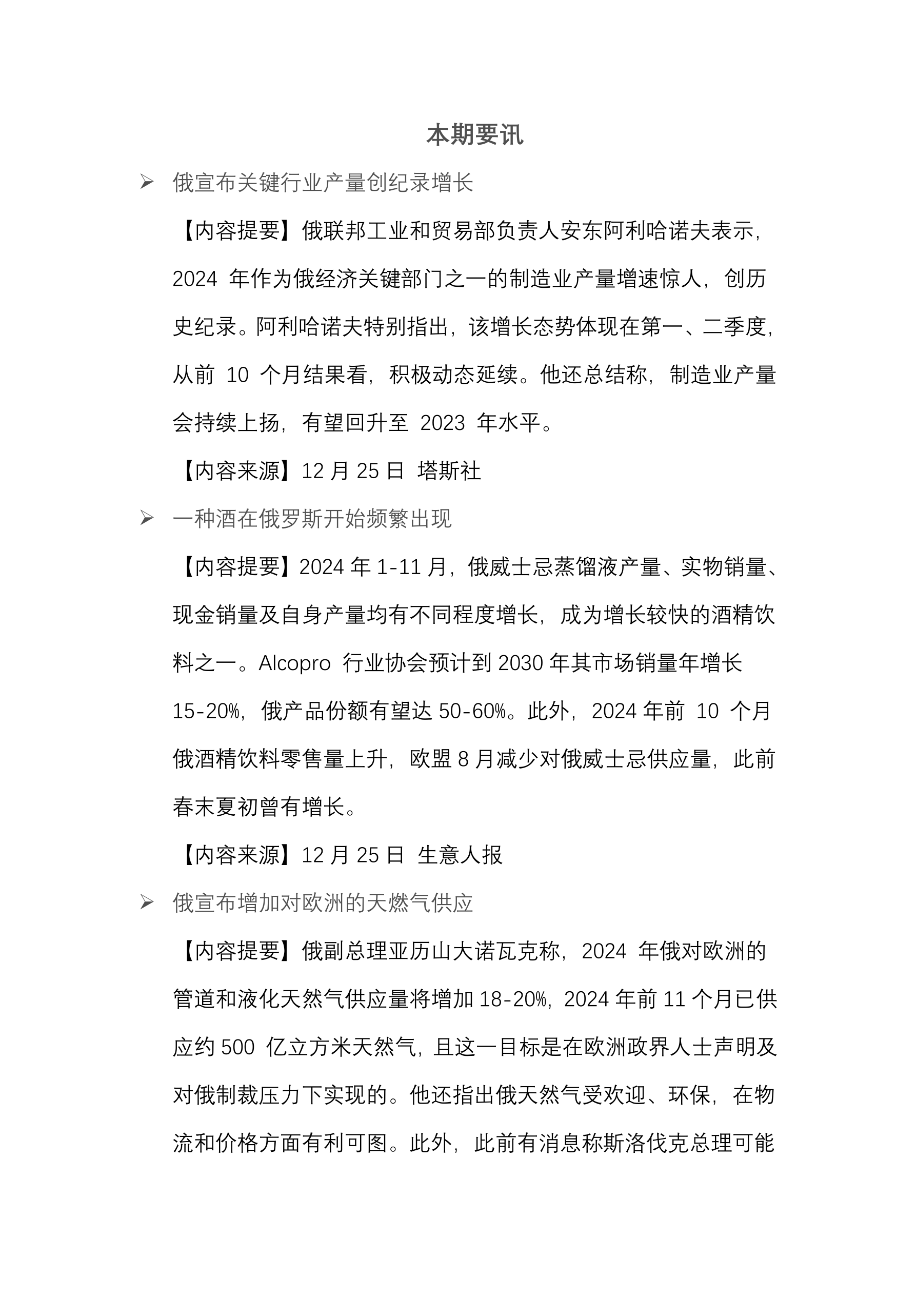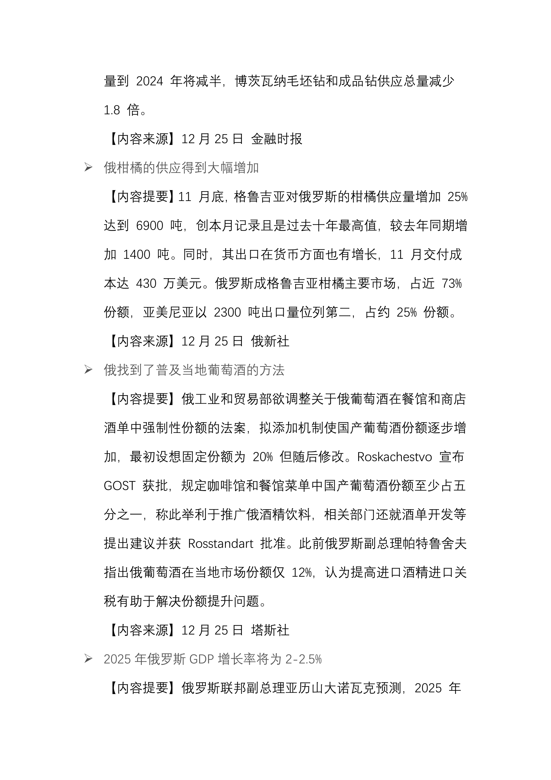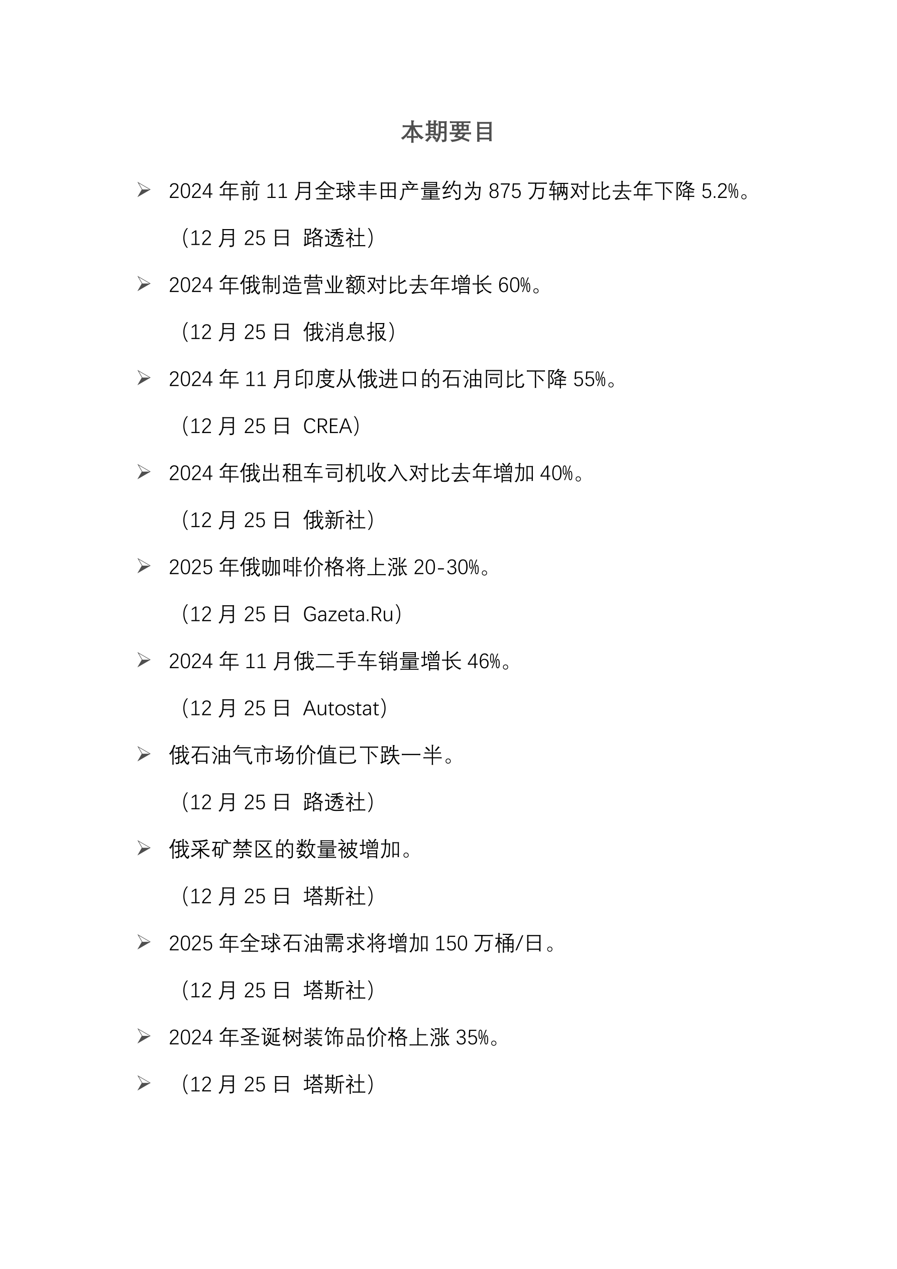 2024 年前 11 月全球丰田产量约为 875 万辆对比去年下降 5.2%。 (12 月 25 日 路透社) 2024 年俄制造营业额对比去年增长 60%。 (12 月 25 日 俄消息报) 2024 年 11 月印度从俄进口的石油同比下降 55%。 (12 月 25 日 CREA) 2024 年俄出租车司机收入对比去年增加 40%。 (12 月 25 日 俄新社) 2025 年俄咖啡价格将上涨 20-30%。 (12 月 25 日 Gazeta.Ru) 2024 年 11 月俄二手车销量增长 46%。 (12 月 25 日 Autostat) 俄石油气市场价值已下跌一半。 (12 月 25 日 路透社) 俄采矿禁区的数量被增加。 (12 月 25 日 塔斯社) 2025 年全球石油需求将增加 150 万桶/日。 (12 月 25 日 塔斯社) 2024 年圣诞树装饰品价格上涨 35%。 (12 月 25 日 塔斯社)