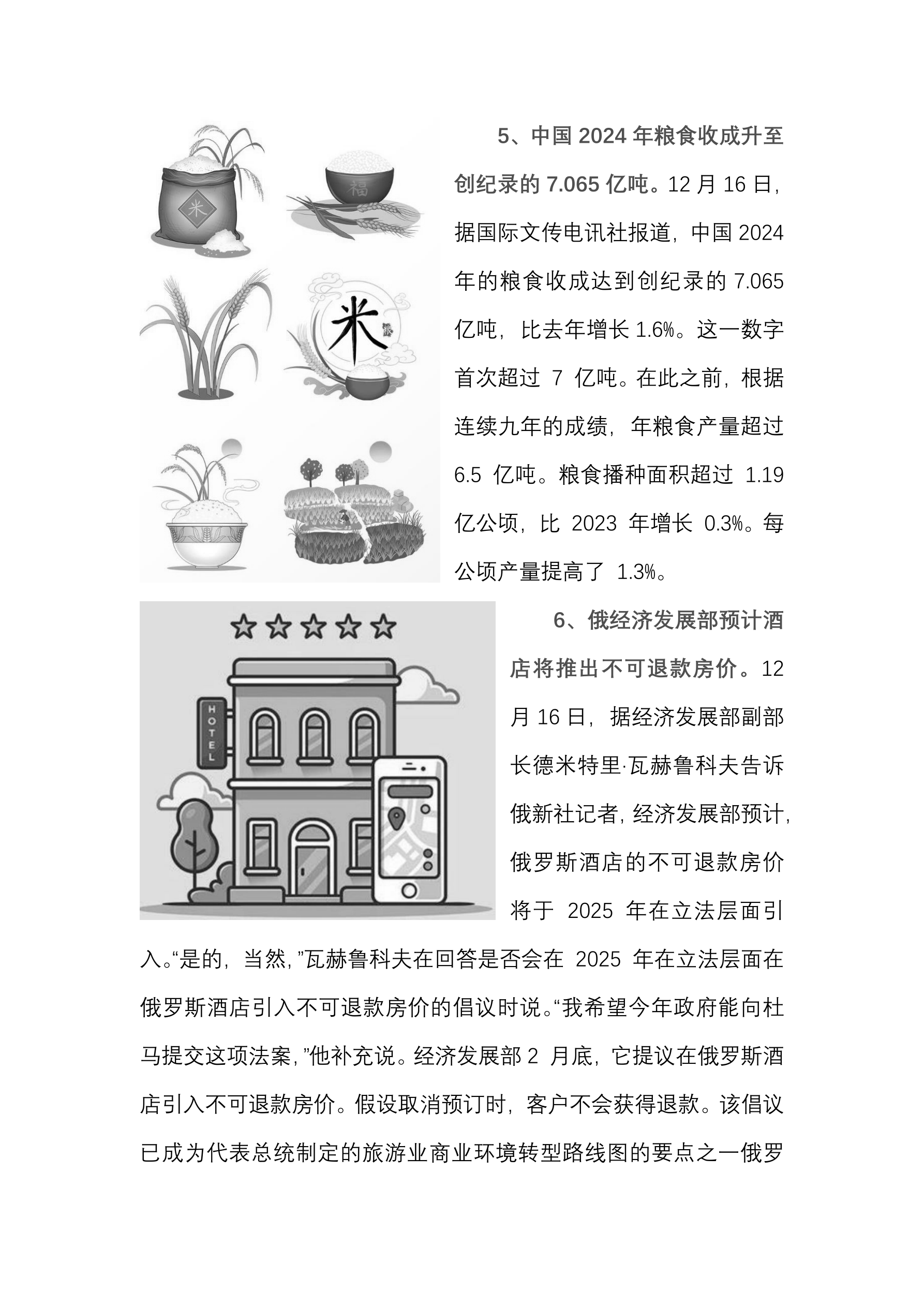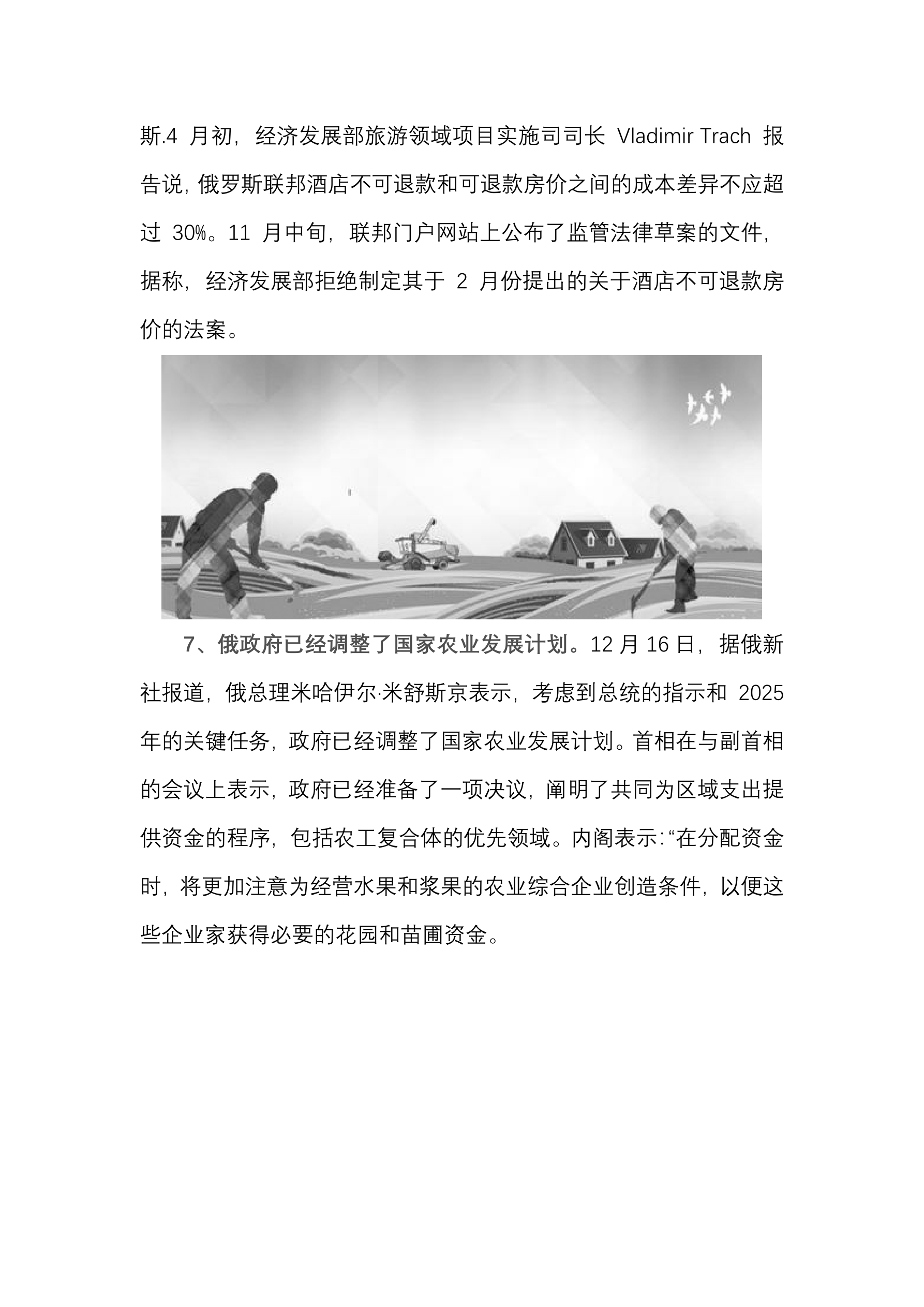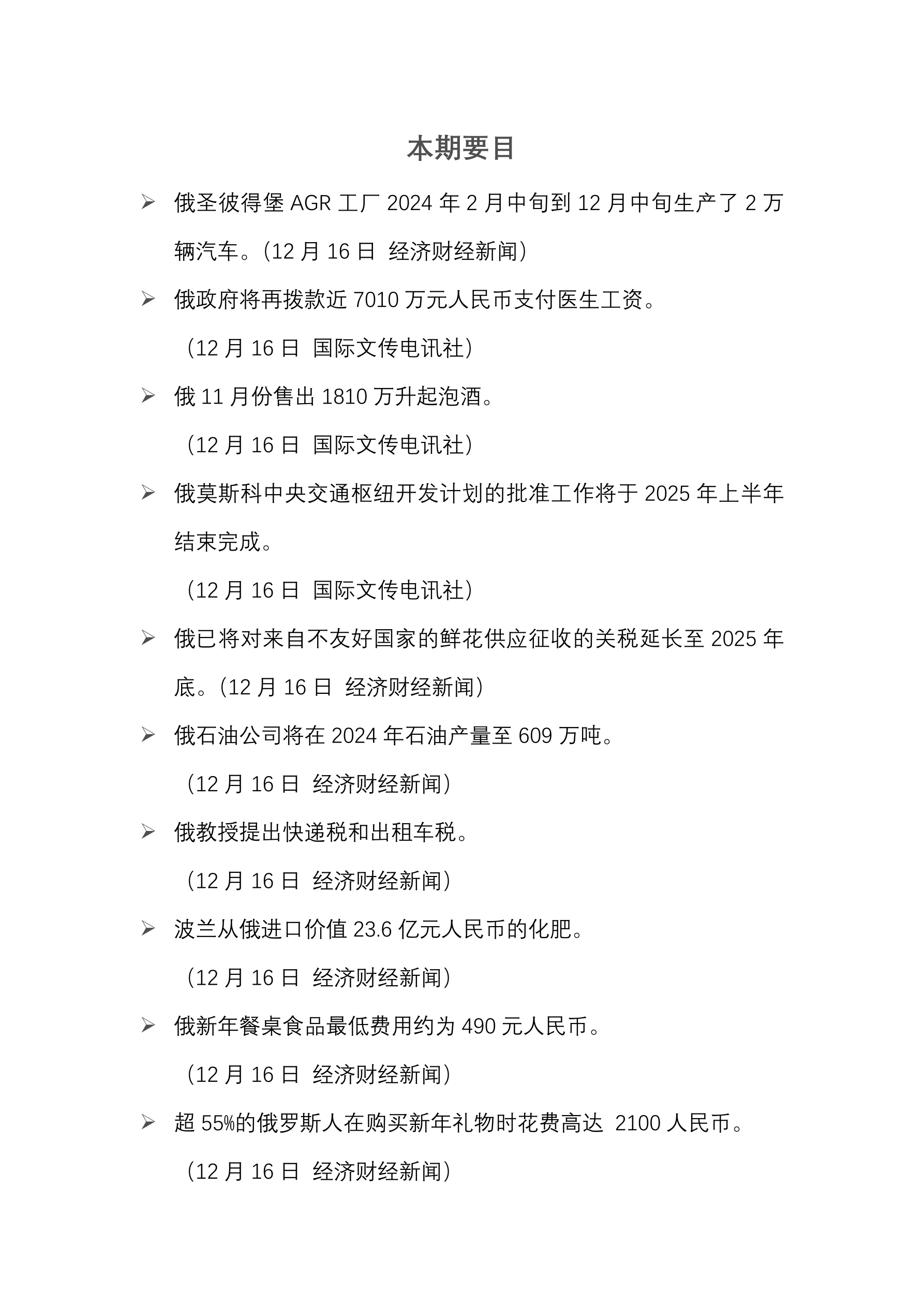 俄圣彼得堡 AGR 工厂 2024 年 2 月中旬到 12 月中旬生产了 2 万 辆汽车。 (12 月 16 日 经济财经新闻) 俄政府将再拨款近 7010 万元人民币支付医生工资。 (12 月 16 日 国际文传电讯社) 俄 11 月份售出 1810 万升起泡酒。 (12 月 16 日 国际文传电讯社) 俄莫斯科中央交通枢纽开发计划的批准工作将于 2025 年上半年 结束完成。 (12 月 16 日 国际文传电讯社) 俄已将对来自不友好国家的鲜花供应征收的关税延长至 2025 年 底。 (12 月 16 日 经济财经新闻) 俄石油公司将在 2024 年石油产量至 609 万吨。 (12 月 16 日 经济财经新闻) 俄教授提出快递税和出租车税。 (12 月 16 日 经济财经新闻) 波兰从俄进口价值 23.6 亿元人民币的化肥。 (12 月 16 日 经济财经新闻) 俄新年餐桌食品最低费用约为 490 元人民币。 (12 月 16 日 经济财经新闻) 超 55%的俄罗斯人在购买新年礼物时花费高达 2100 人民币。 (12 月 16...