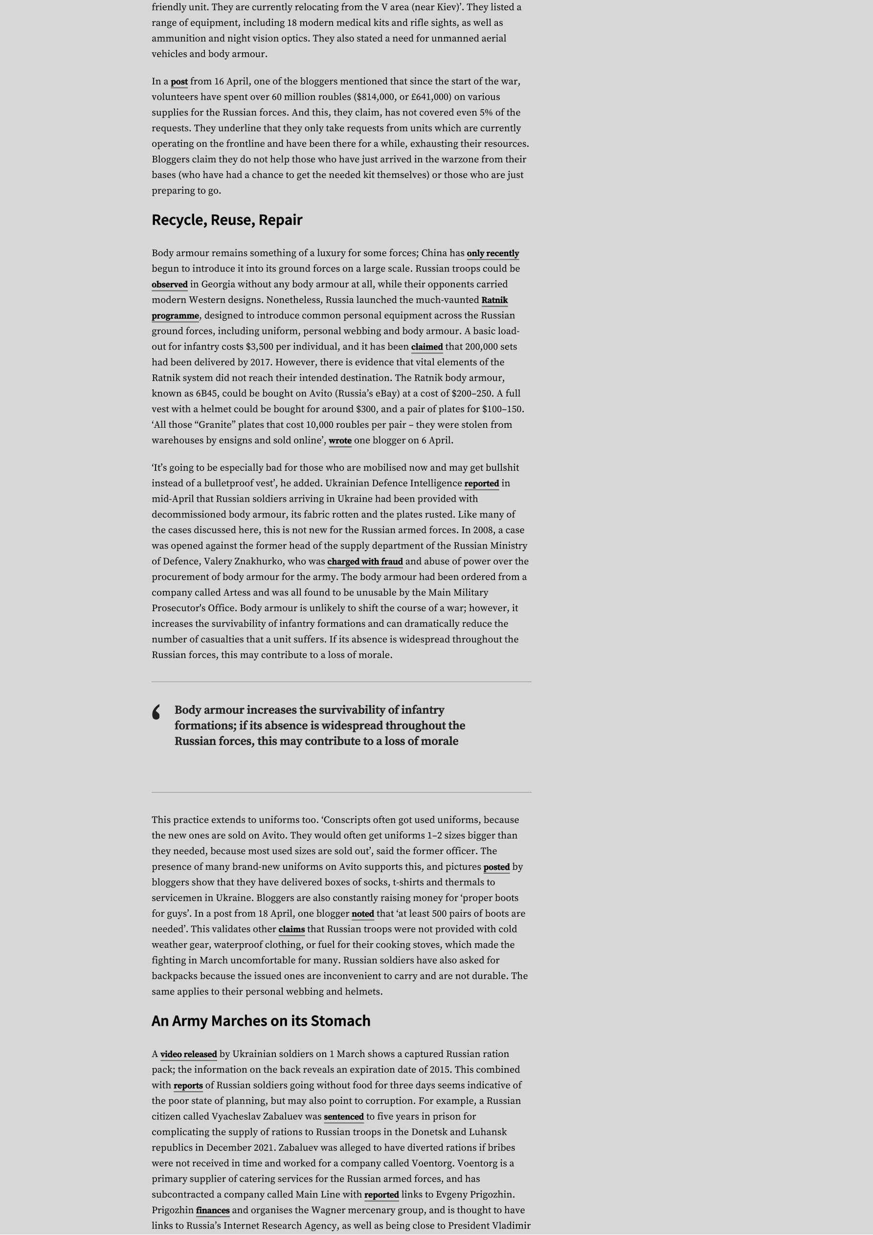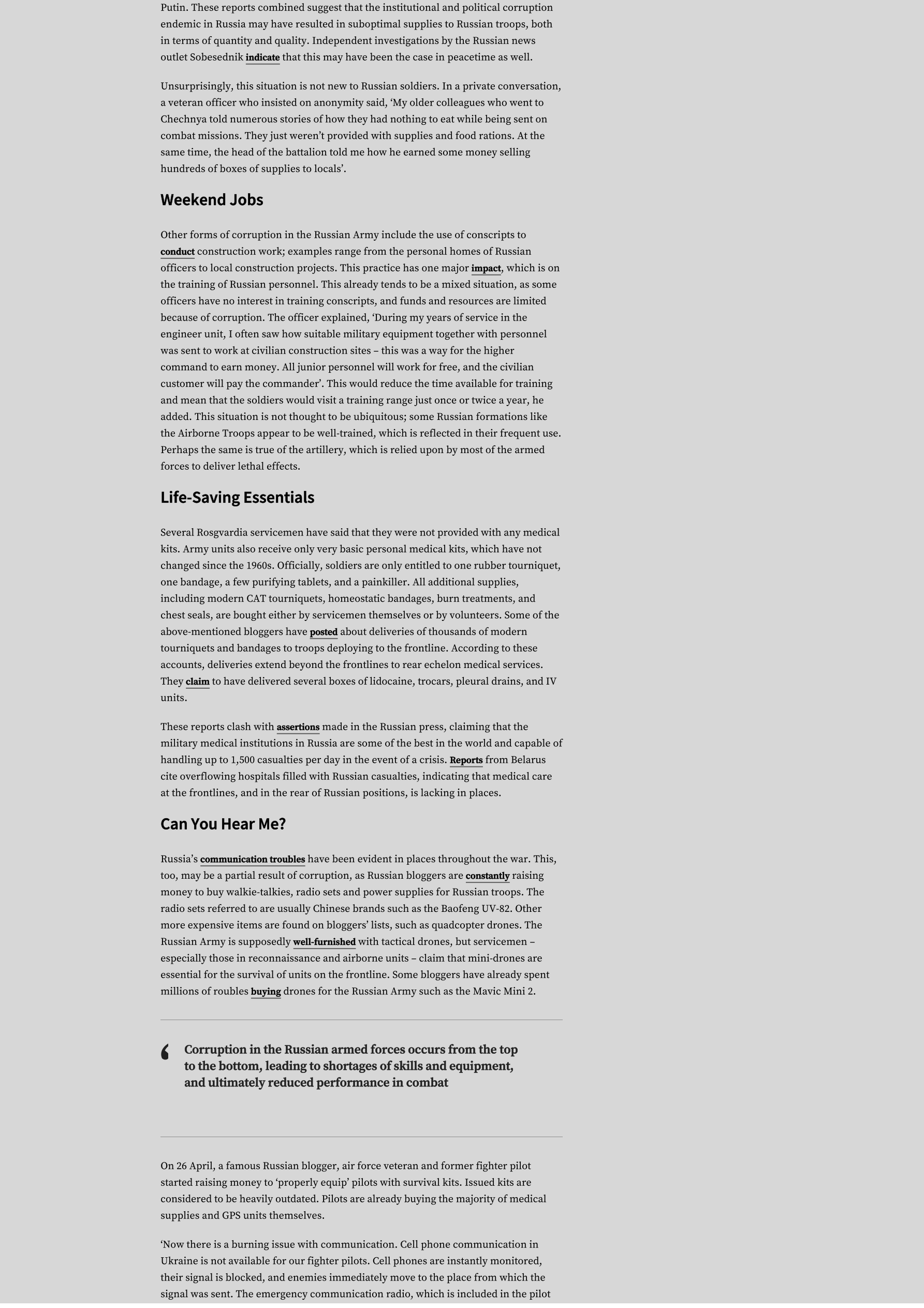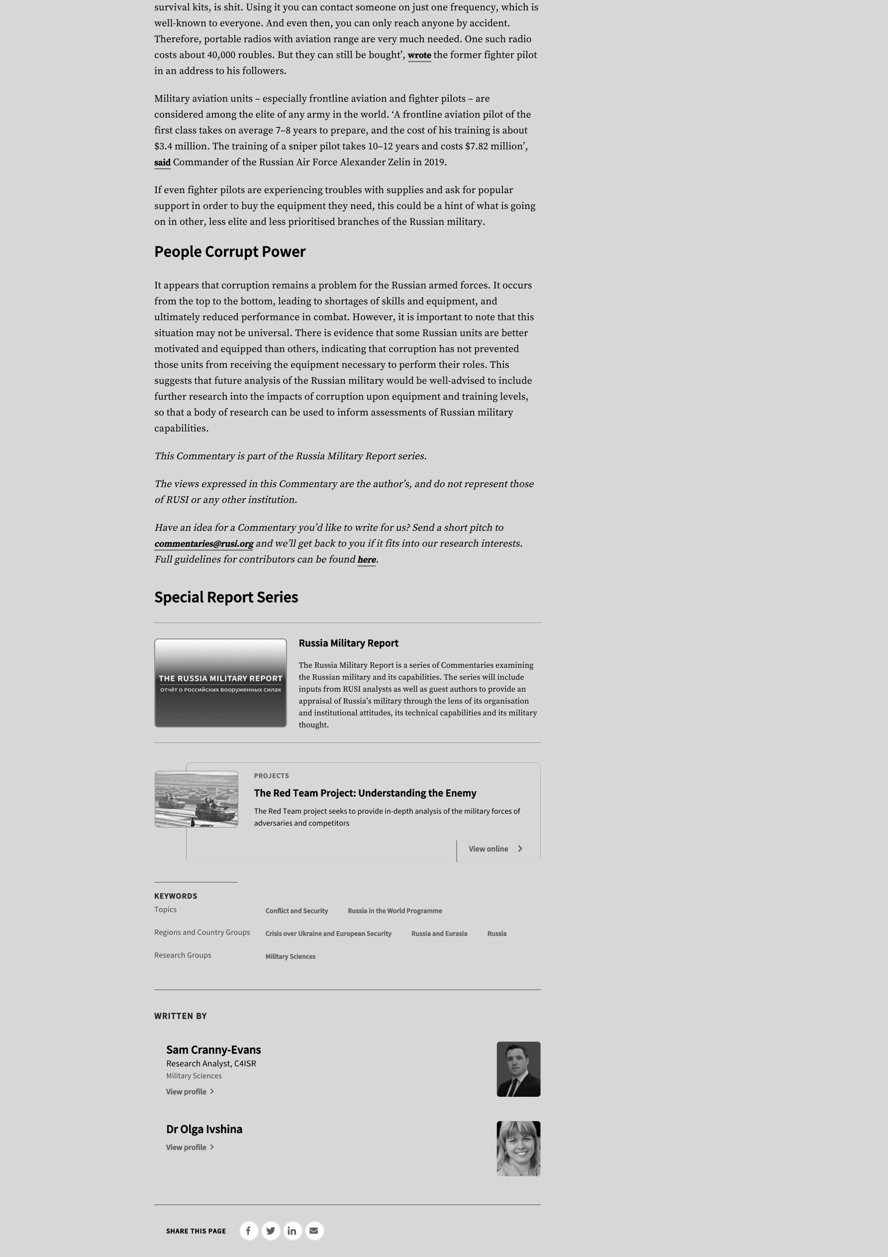 Explore our Research Events News & Comment Membership NextGen About Contact Log in Explore Our Research / Publications / Commentary COMMENTARY Corruption in the Russian Armed Forces Sam Cranny-Evans and Dr Olga Ivshina 12 May 2022 Long Read SHARE Corruption is endemic in Russia and is pervasive within its defence industrial sector and armed forces. Evidence from Ukraine suggests that it is costing Russian lives. Corruption in the Russian armed forces, and society in general,...
