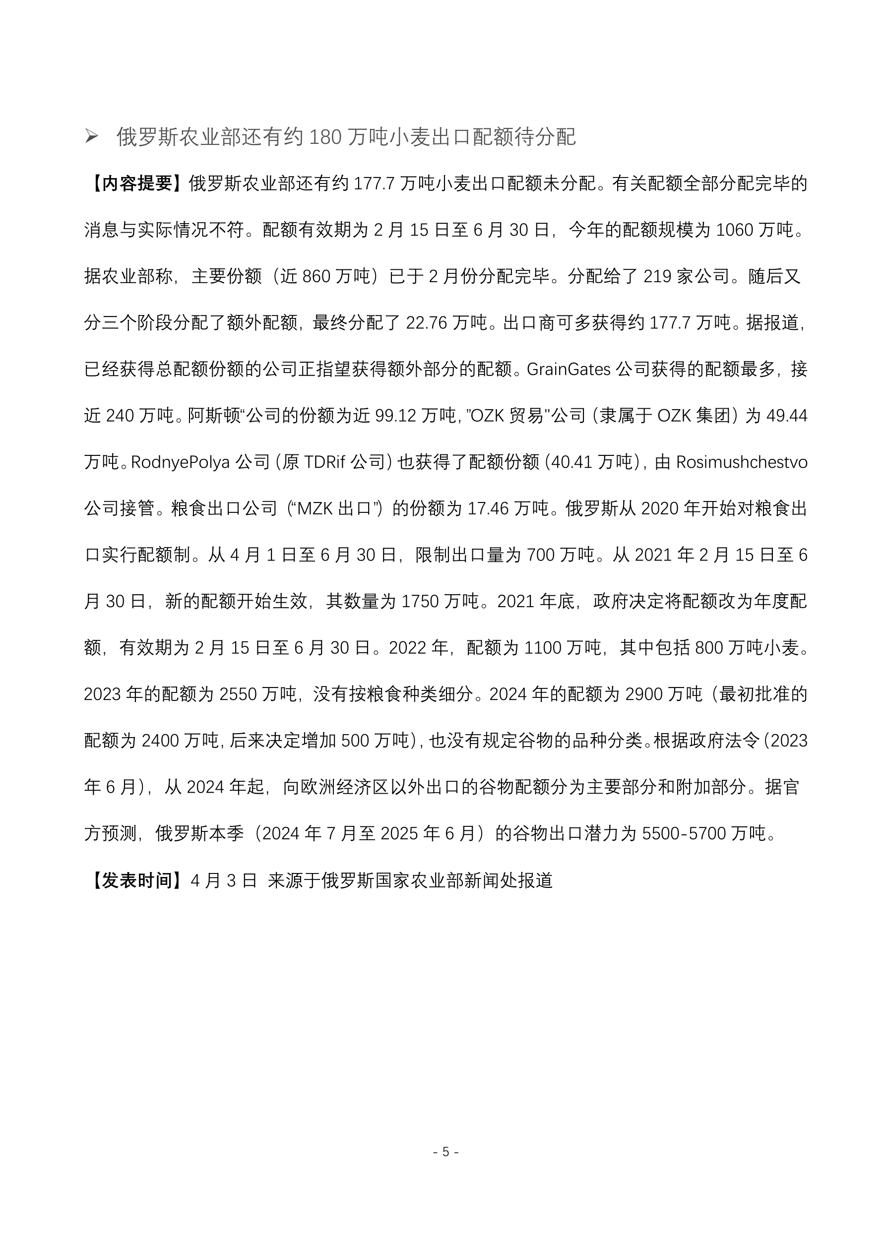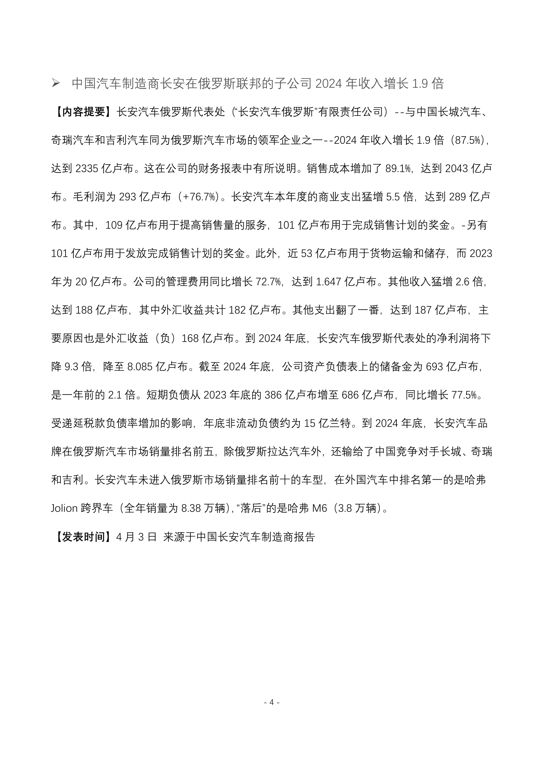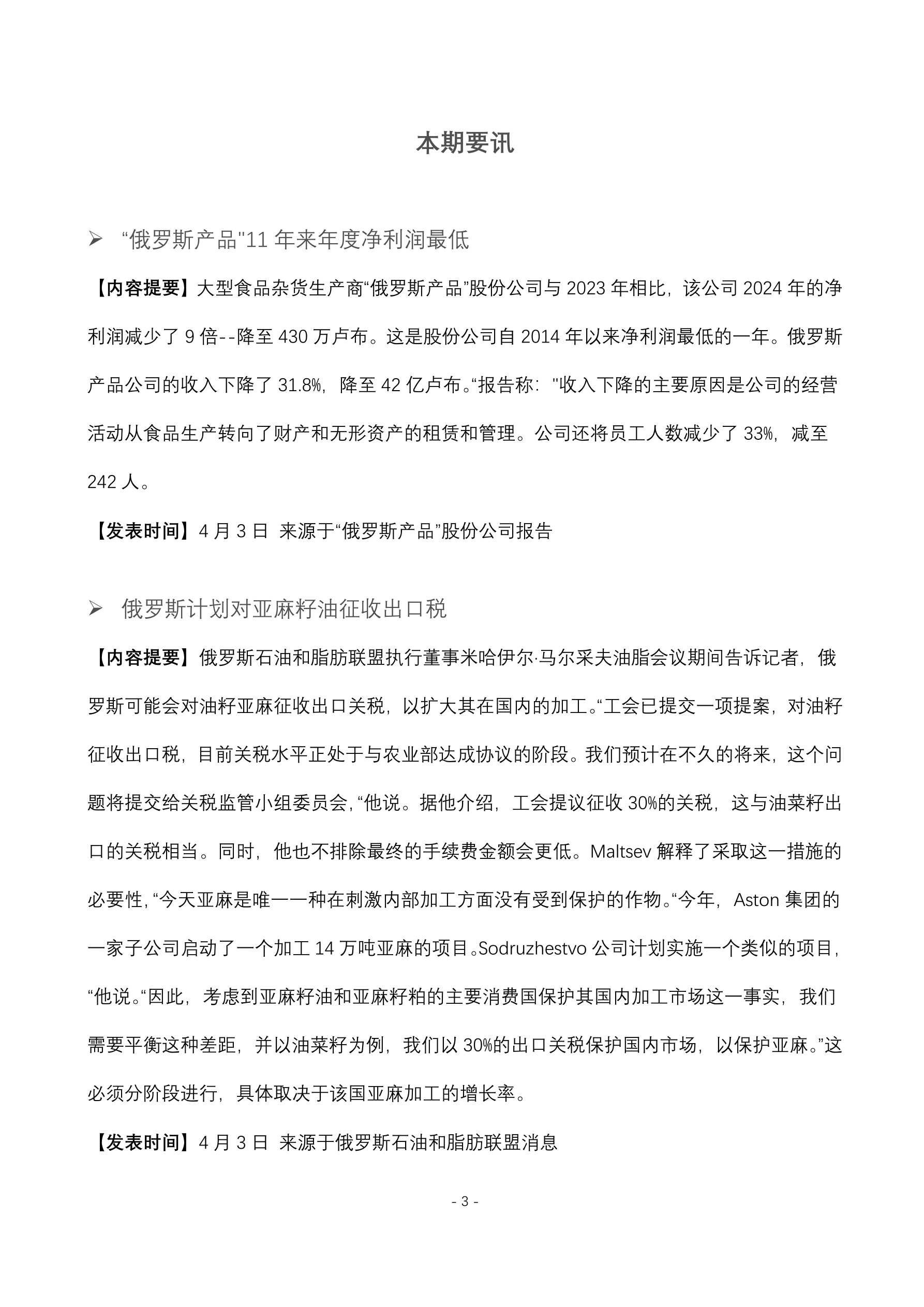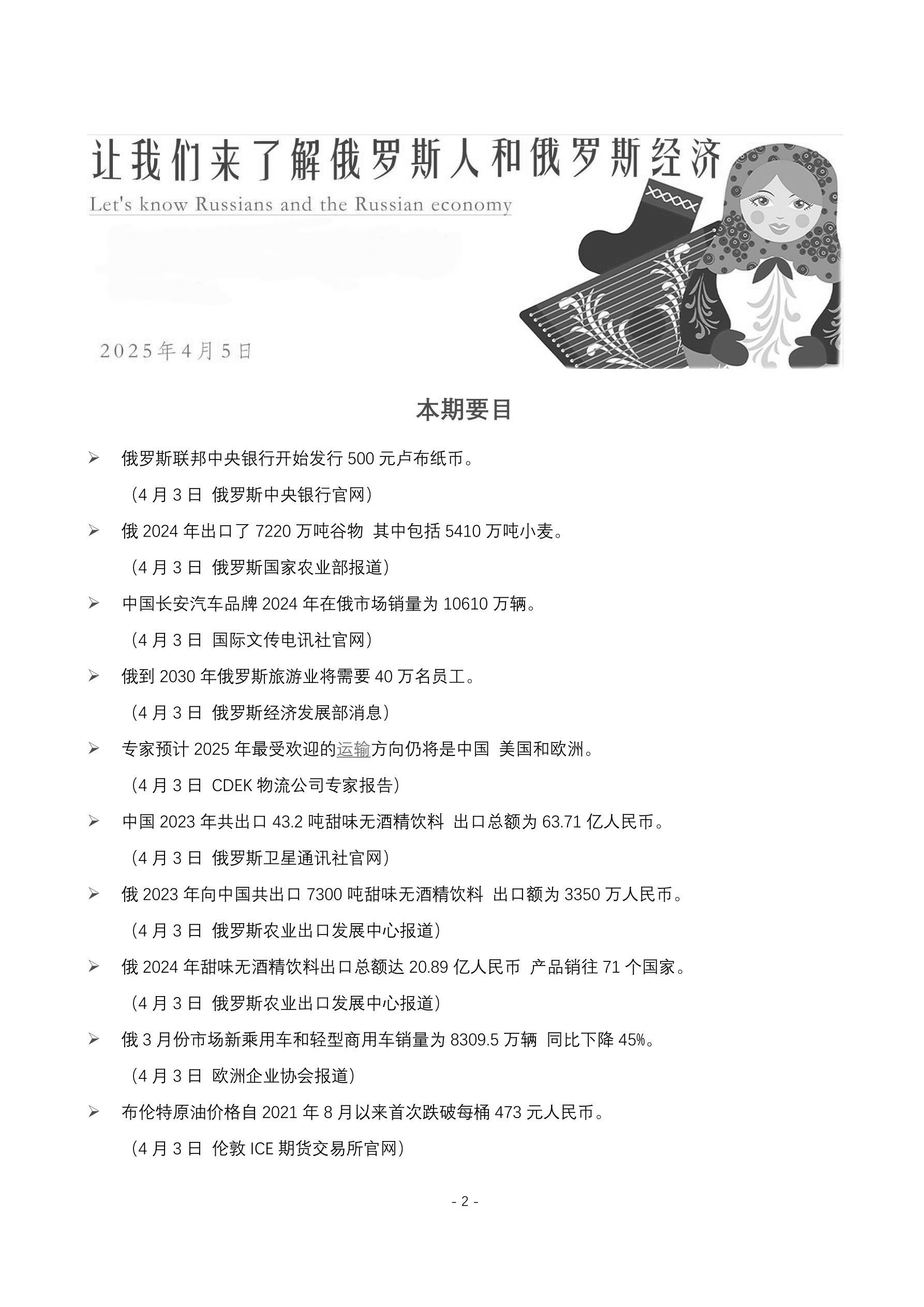 俄罗斯联邦中央银行开始发行 500 元卢布纸币。 (4 月 3 日 俄罗斯中央银行官网) 俄 2024 年出口了 7220 万吨谷物 其中包括 5410 万吨小麦。 (4 月 3 日 俄罗斯国家农业部报道) 中国长安汽车品牌 2024 年在俄市场销量为 10610 万辆。 (4 月 3 日 国际文传电讯社官网) 俄到 2030 年俄罗斯旅游业将需要 40 万名员工。 (4 月 3 日 俄罗斯经济发展部消息) 专家预计 2025 年最受欢迎的运输方向仍将是中国 美国和欧洲。 (4 月 3 日 CDEK 物流公司专家报告) 中国 2023 年共出口 43.2 吨甜味无酒精饮料 出口总额为 63.71 亿人民币。 (4 月 3 日 俄罗斯卫星通讯社官网) 俄 2023 年向中国共出口 7300 吨甜味无酒精饮料 出口额为 3350 万人民币。 (4 月 3 日 俄罗斯农业出口发展中心报道) 俄 2024 年甜味无酒精饮料出口总额达 20.89 亿人民币 产品销往 71 个国家。 (4 月 3 日 俄罗斯农业出口发展中心报道) 俄...