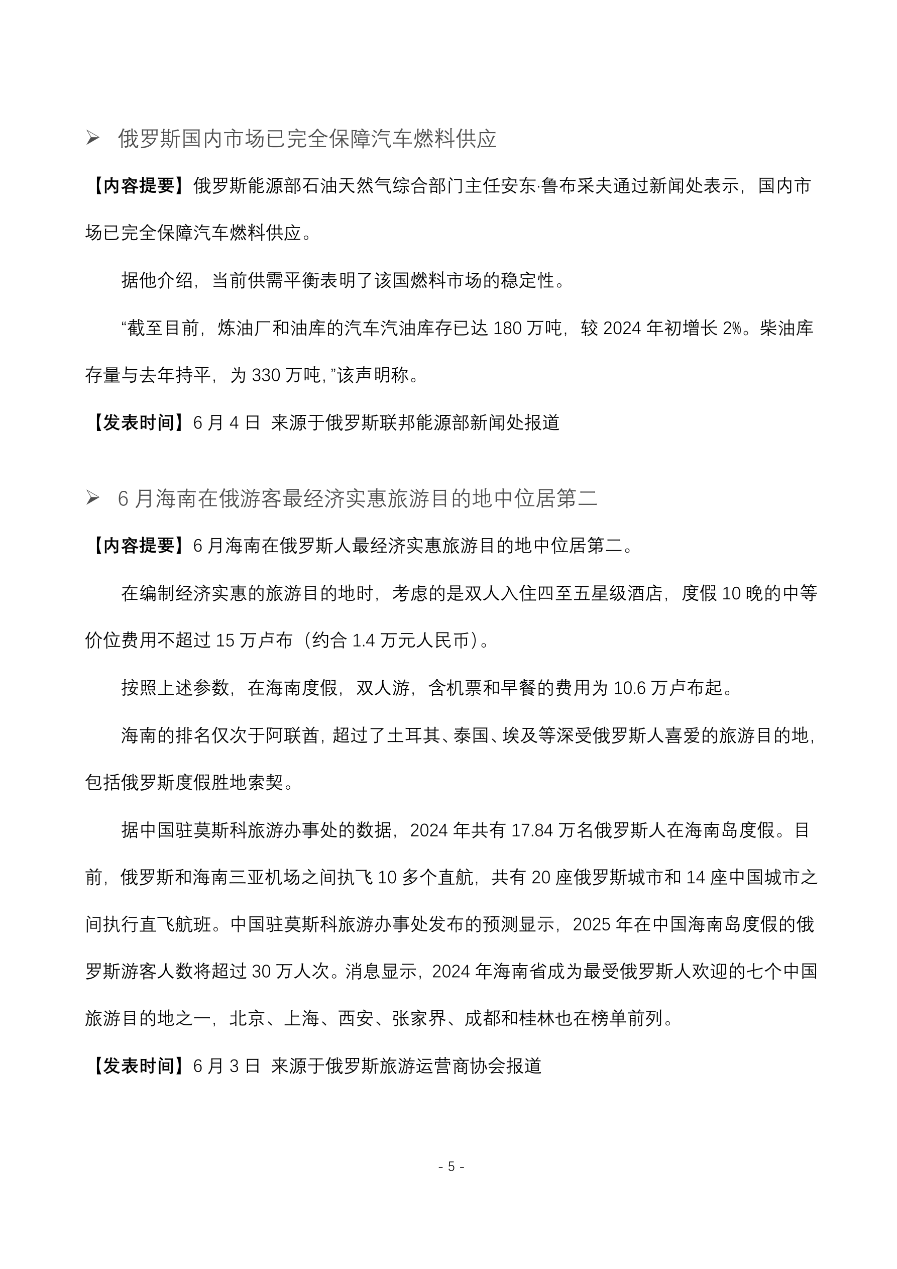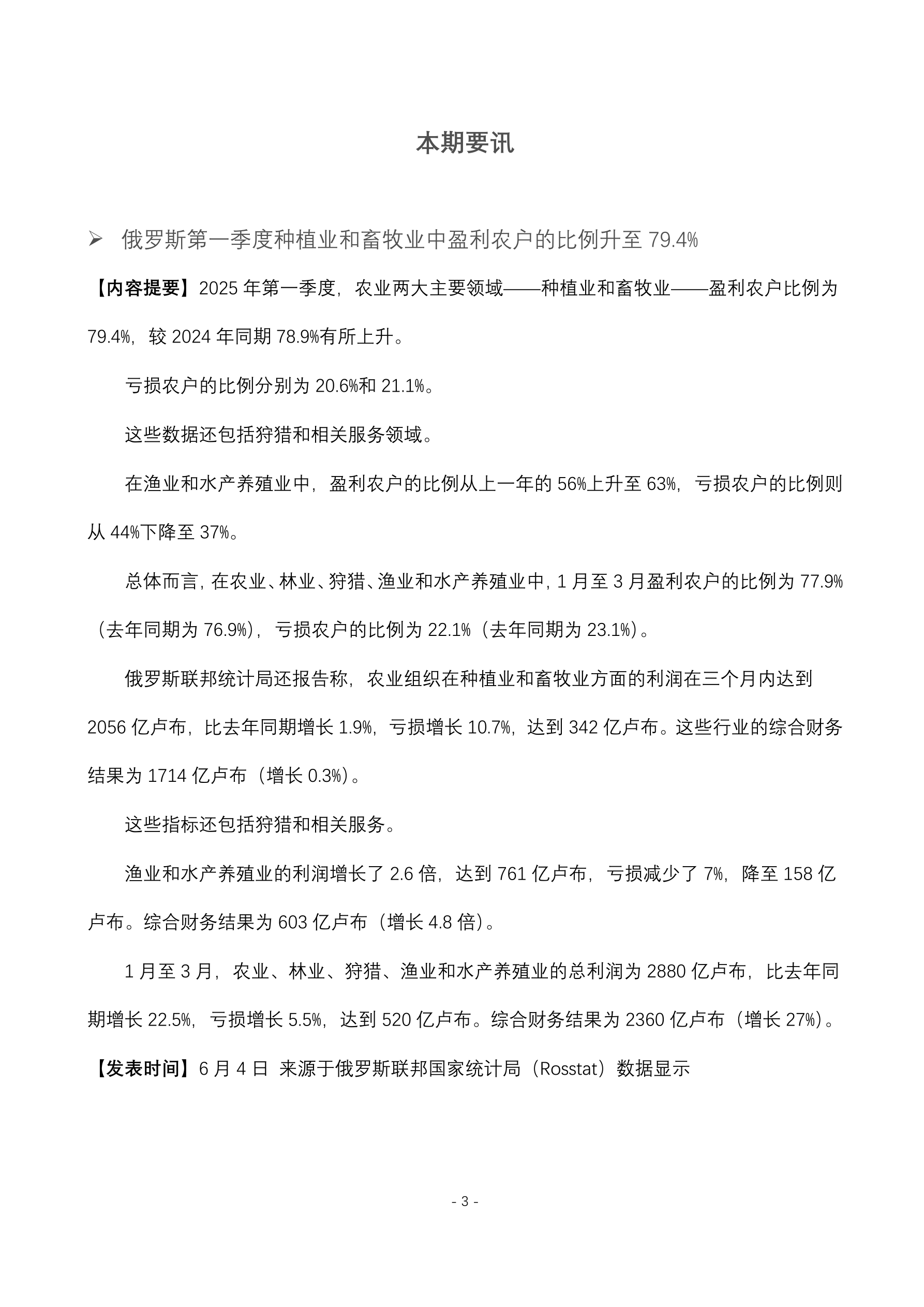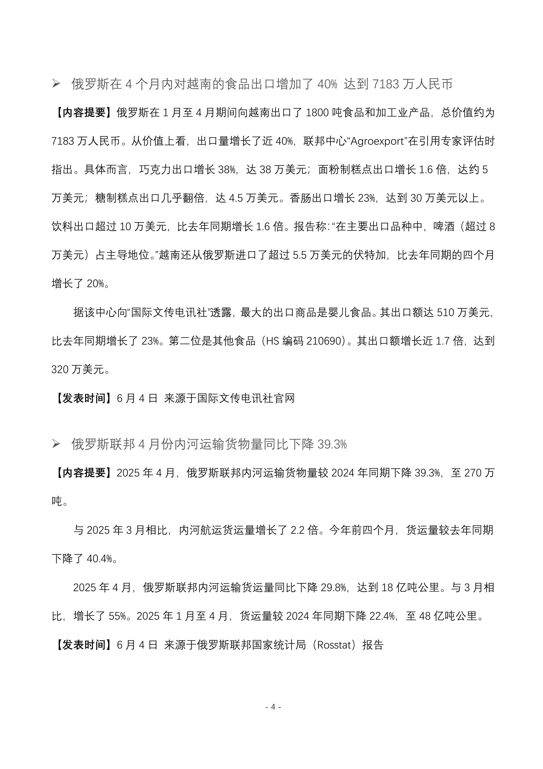 俄农业部计划到 2030 年将谷物出口量提升至每年 7500 万吨。 (5 月 30 日 俄罗斯联邦农业部报道) 俄第一季度向中国出口 0.2 亿千瓦时电力。 (5 月 30 日 俄罗斯能源公司报道) 俄铁路公司今年 5 月份的货运量为 9460 万吨。 (6 月 2 日 俄罗斯铁路公司报道) 俄政府计划于今年拨款近 7800 万人民币用于资助多个地区工业园区和科技园区的建设。 (6 月 2 日 俄罗斯政府新闻处报道) 俄第一季度平行进口总额达 489 亿人民币。 (6 月 2 日 国际文传电讯社官网) 俄工业采矿可在未来 2~3 年内处理多达 100 亿立方米的伴生气。 (6 月 2 日 国际文传电讯社官网) 俄 5 月份轻型汽车销量为 90709 辆。 (6 月 3 日 俄罗斯工业和贸易部报道) 俄农业组织今年 1~4 月份销售 87.62 万吨土豆。 (6 月 3 日 俄罗斯联邦统计局统计数据) 俄铁路公司今年 5 月份的日均装车计划为 313 万吨 相当于月度 9700 万吨。 (6 月 2 日 俄罗斯铁路公司报道...