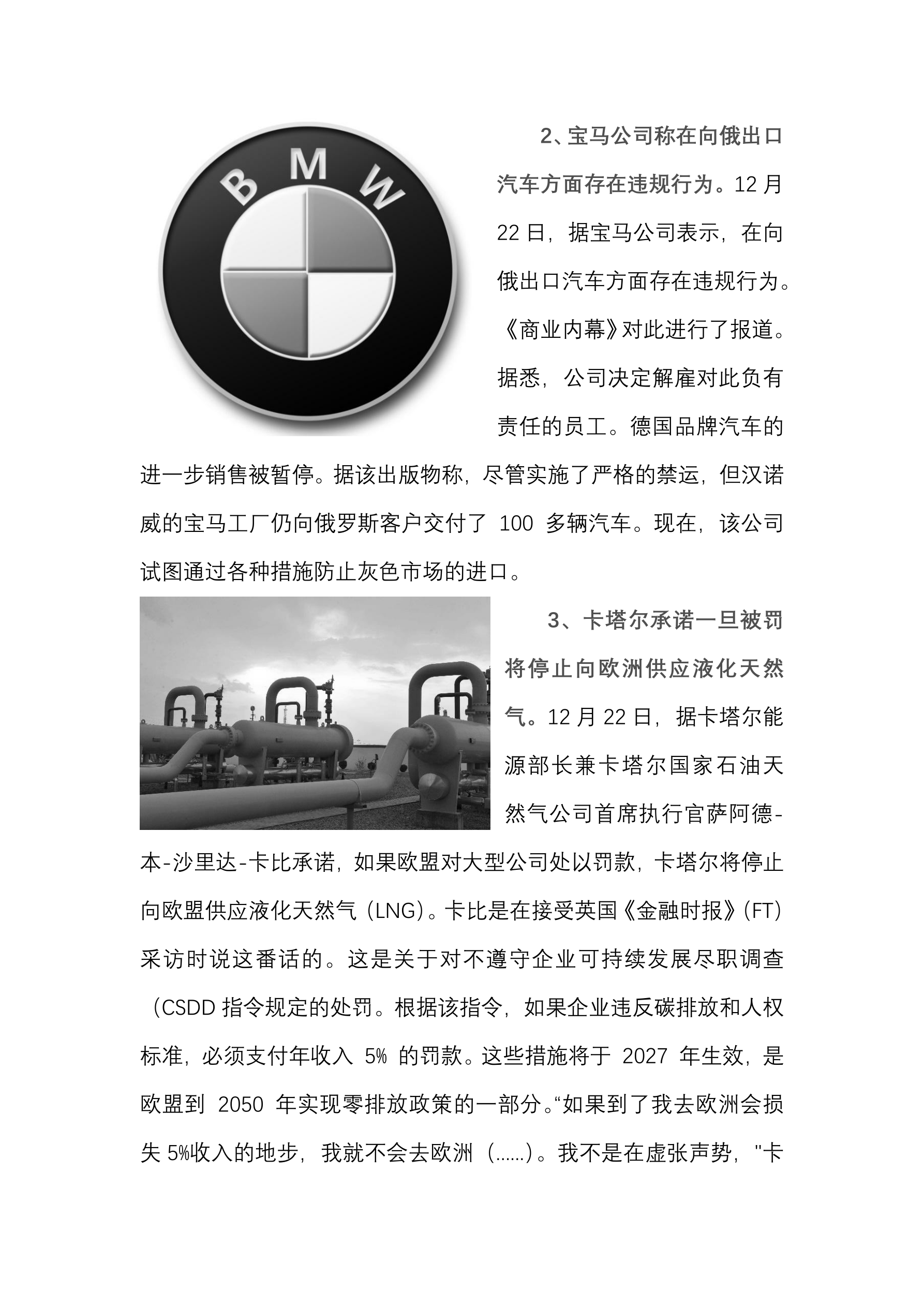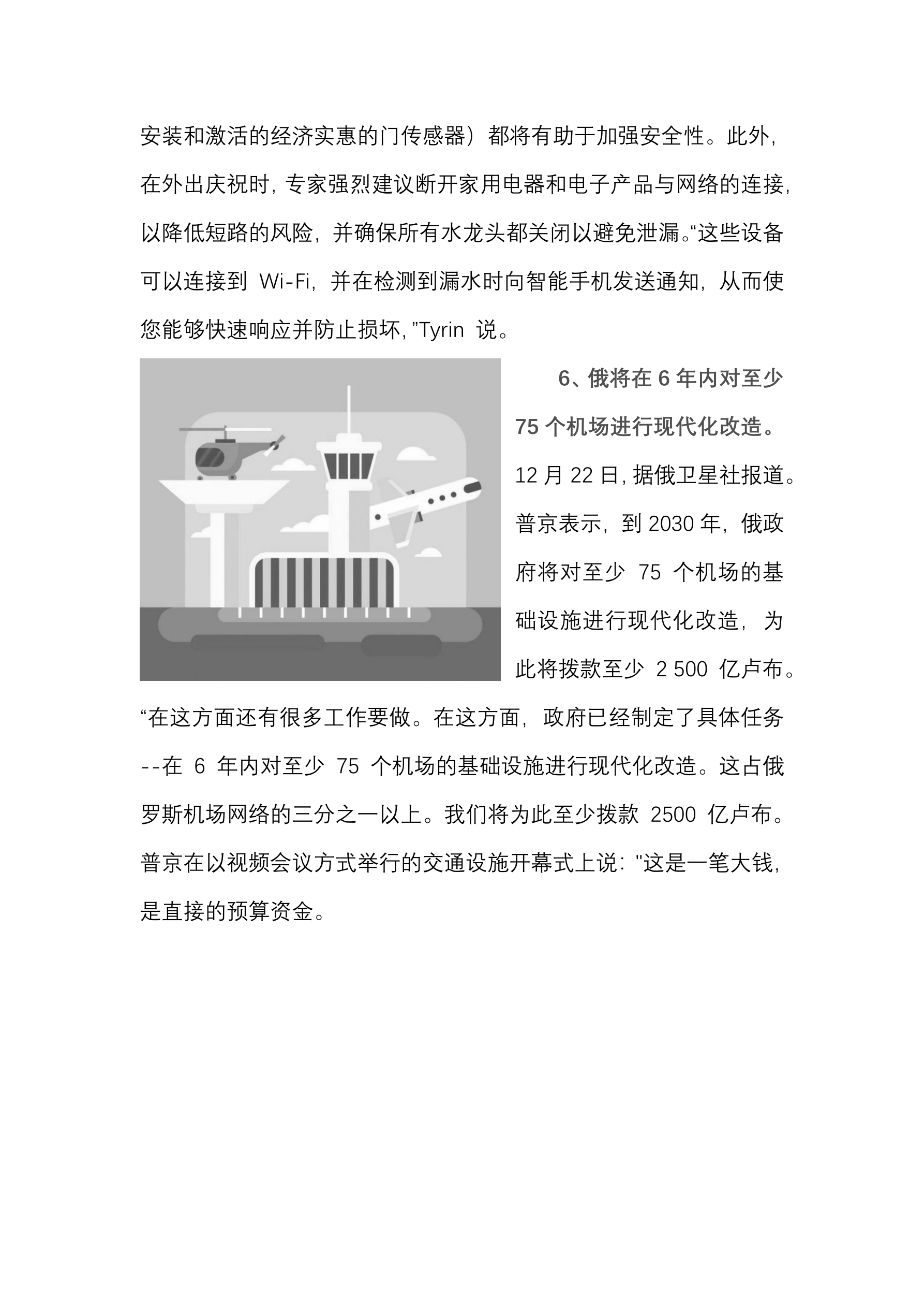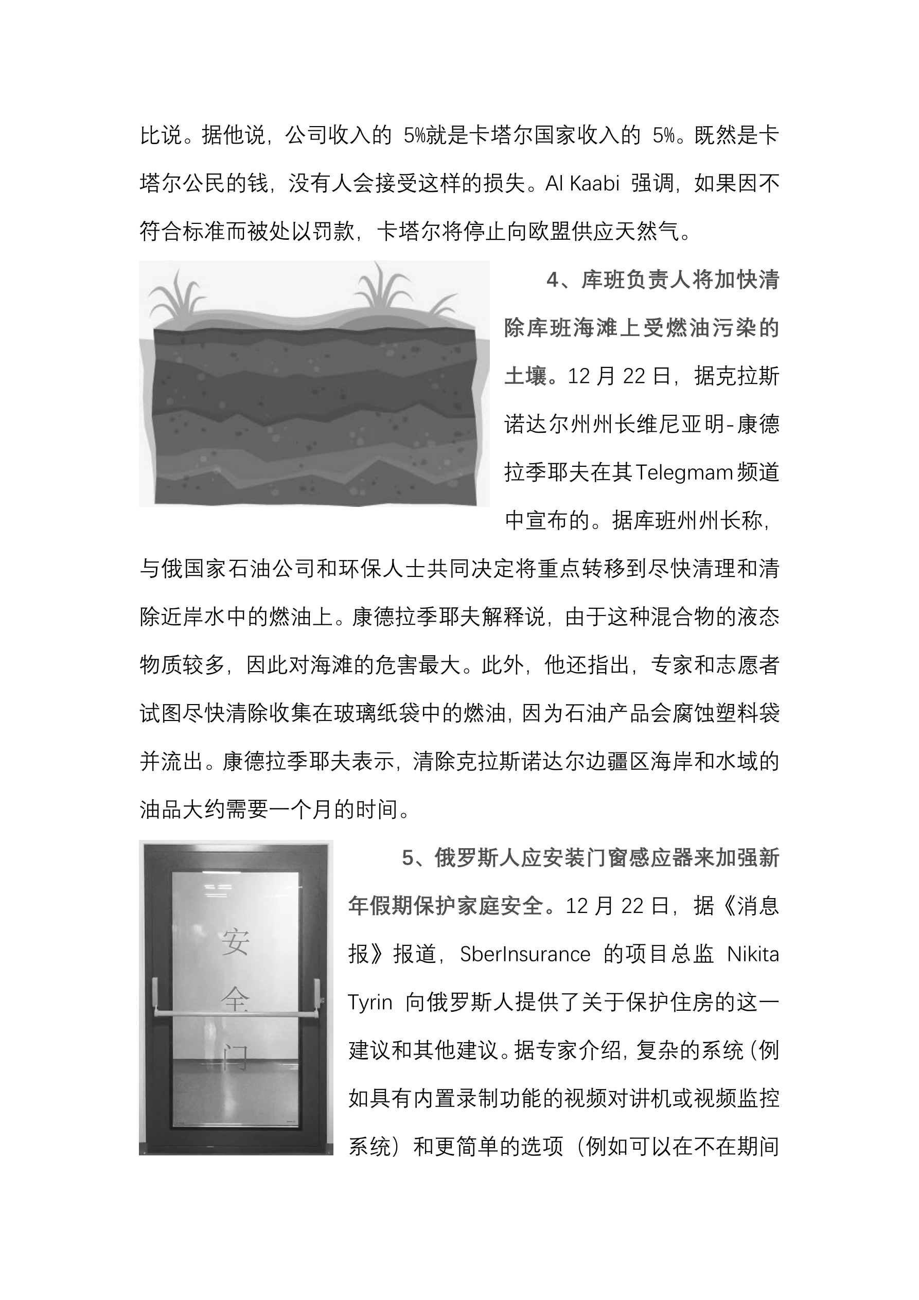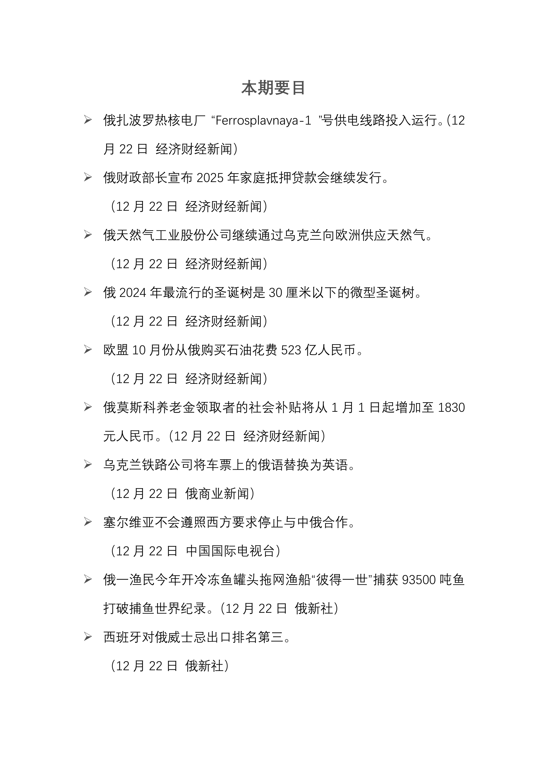 俄扎波罗热核电厂 “Ferrosplavnaya-1 ”号供电线路投入运行。 (12 月 22 日 经济财经新闻) 俄财政部长宣布 2025 年家庭抵押贷款会继续发行。 (12 月 22 日 经济财经新闻) 俄天然气工业股份公司继续通过乌克兰向欧洲供应天然气。 (12 月 22 日 经济财经新闻) 俄 2024 年最流行的圣诞树是 30 厘米以下的微型圣诞树。 (12 月 22 日 经济财经新闻) 欧盟 10 月份从俄购买石油花费 523 亿人民币。 (12 月 22 日 经济财经新闻) 俄莫斯科养老金领取者的社会补贴将从 1 月 1 日起增加至 1830 元人民币。 (12 月 22 日 经济财经新闻) 乌克兰铁路公司将车票上的俄语替换为英语。 (12 月 22 日 俄商业新闻) 塞尔维亚不会遵照西方要求停止与中俄合作。 (12 月 22 日 中国国际电视台) 俄一渔民今年开冷冻鱼罐头拖网渔船“彼得一世”捕获 93500 吨鱼 打破捕鱼世界纪录。 (12 月 22 日 俄新社) 西班牙对俄威士忌出口排名第三。 (12 月 22 日 ...