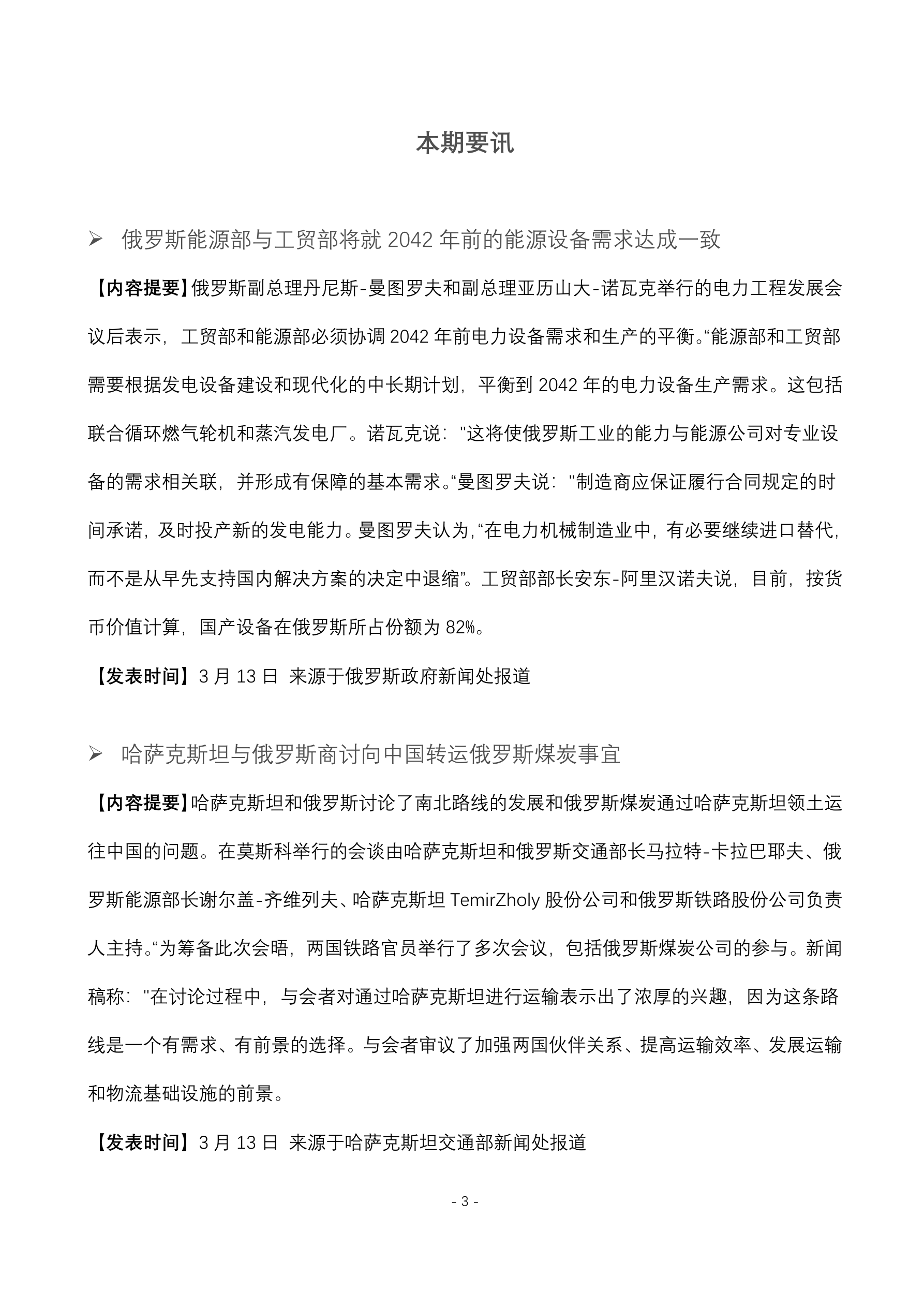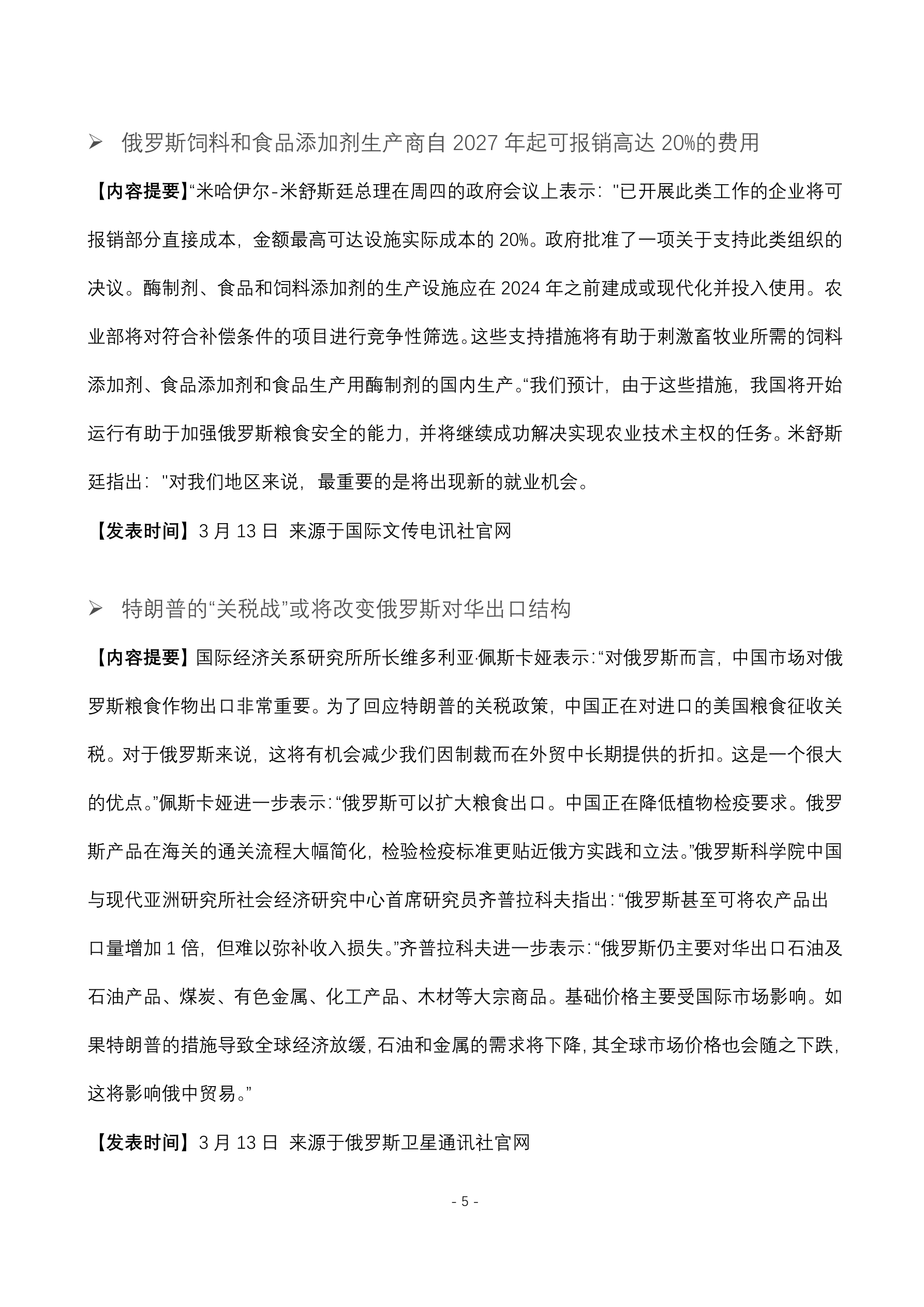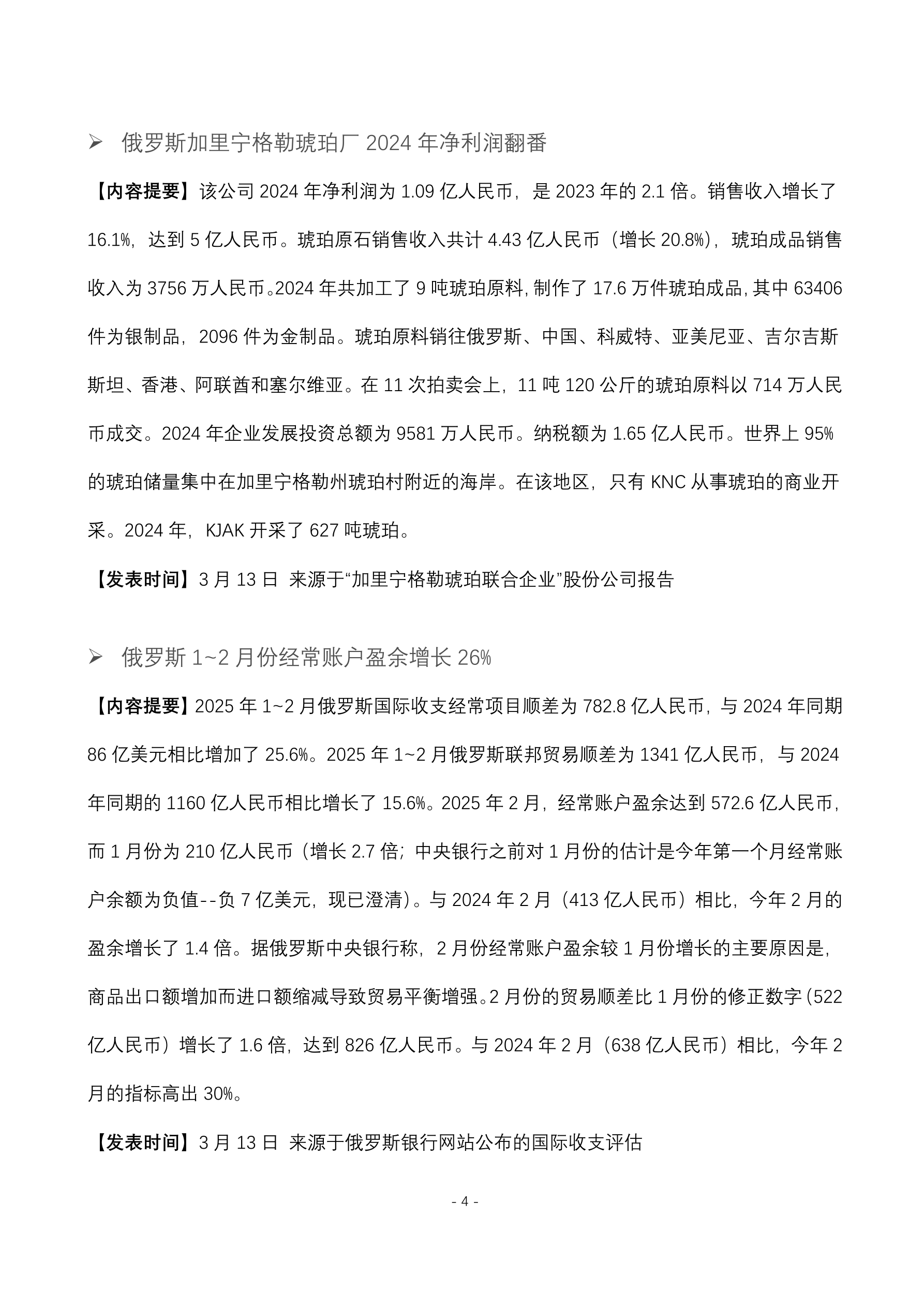 白俄 2024 年在俄乳制品进口中的份额超过 93% 进口量达到 95.3 万吨。 (3 月 13 日 俄罗斯农业部报道) 俄水电公司 2024 年净亏损总额达 51.4 亿人民币。 (3 月 13 日 俄罗斯水电公司报告) 俄罗斯将在 2025 年向阿布哈兹提供 4.45 亿人民币的财政援助。 (3 月 13 日 国际文传电讯社官网) 俄 3 月 7 日的国际储备为 4.63 万亿人民币。 (3 月 13 日 俄罗斯银行报告) 俄农业部预测今年粮食收成为 1.45 亿吨。 (3 月 13 日 俄罗斯农业部报道) 俄酿酒商 1 月份向中国出口约 200 吨葡萄酒。 (3 月 13 日 俄罗斯卫星通讯社官网) 俄在 3 月份全面恢复了对印度的石油供应。 (3 月 13 日 英国路透社报道) 俄水电公司 2024 年的营业费用增长 12.3% 达到 447 亿人民币。 (3 月 13 日 俄罗斯水电公司报告) 俄 2024 年超 13.8 万吨的肉类产品和超 8.5 万吨的鱼类产品运往白俄市场。 (3 月 13 日 俄罗斯农业...