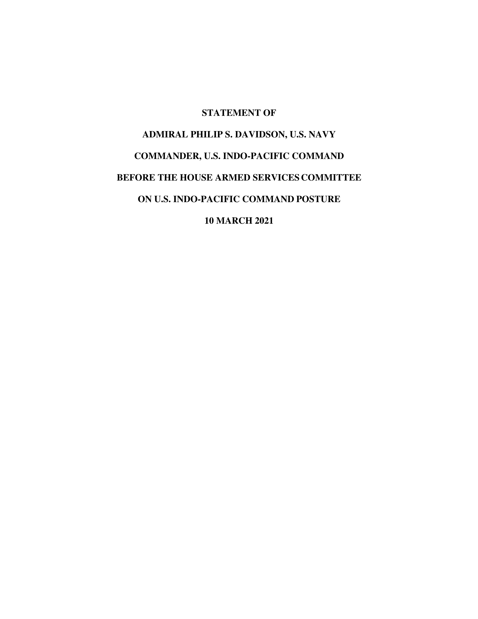 STATEMENT OF ADMIRAL PHILIP S. DAVIDSON, U.S. NAVY COMMANDER, U.S. INDO-PACIFIC COMMAND BEFORE THE HOUSE ARMED SERVICES COMMITTEE ON U.S. INDO-PACIFIC COMMAND POSTURE 10 MARCH 2021