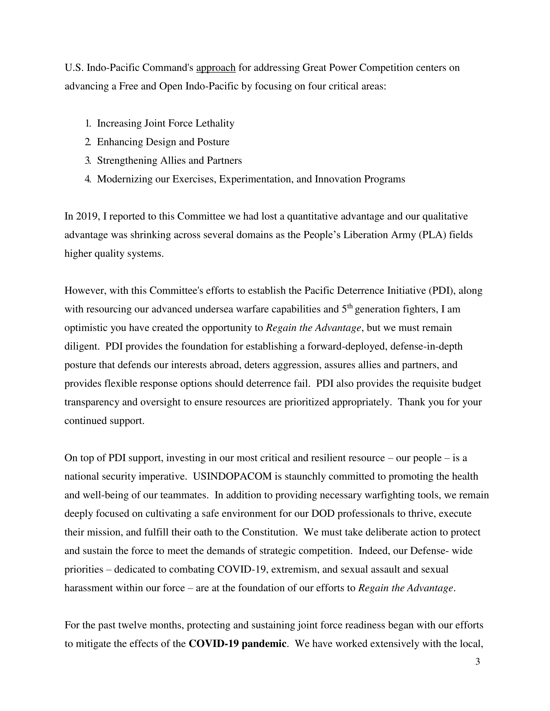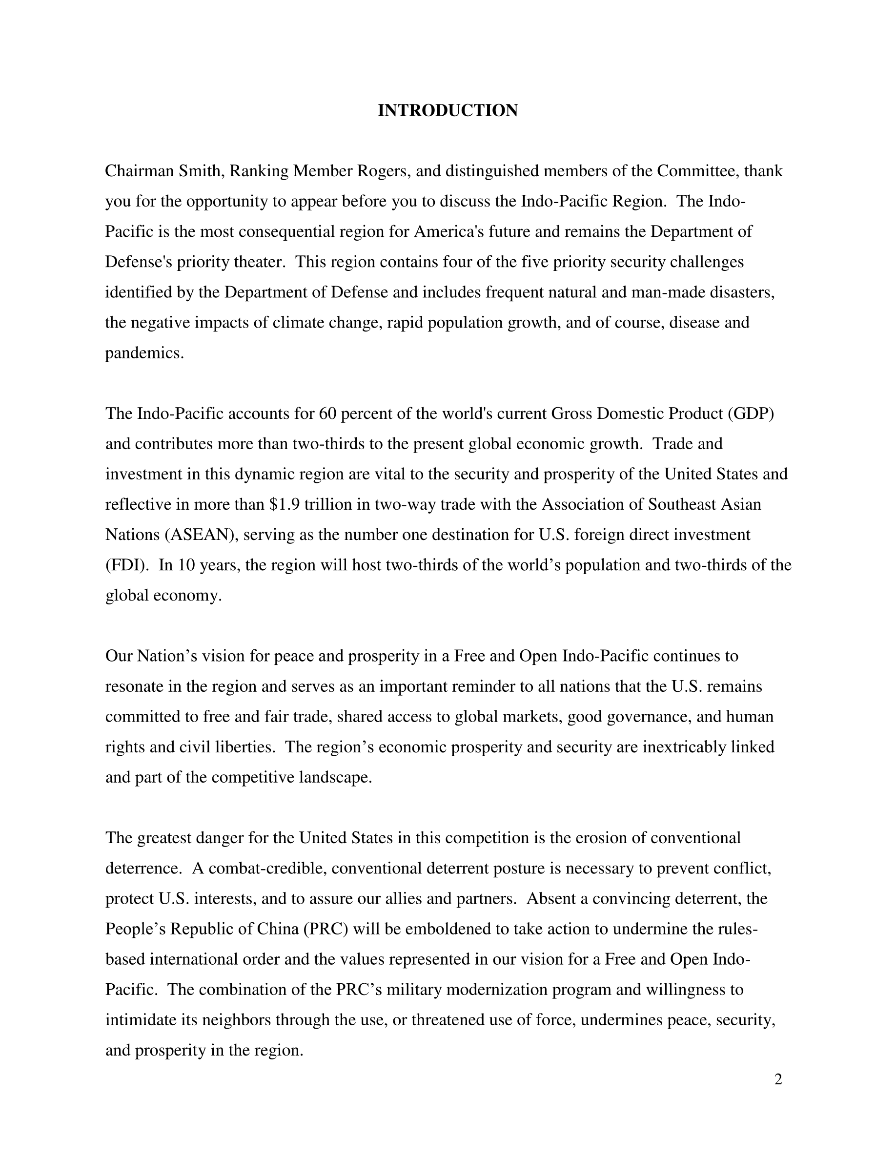 Chairman Smith, Ranking Member Rogers, and distinguished members of the Committee, thank you for the opportunity to appear before you to discuss the Indo-Pacific Region. The IndoPacific is the most consequential region for America's future and remains the Department of Defense's priority theater. T...