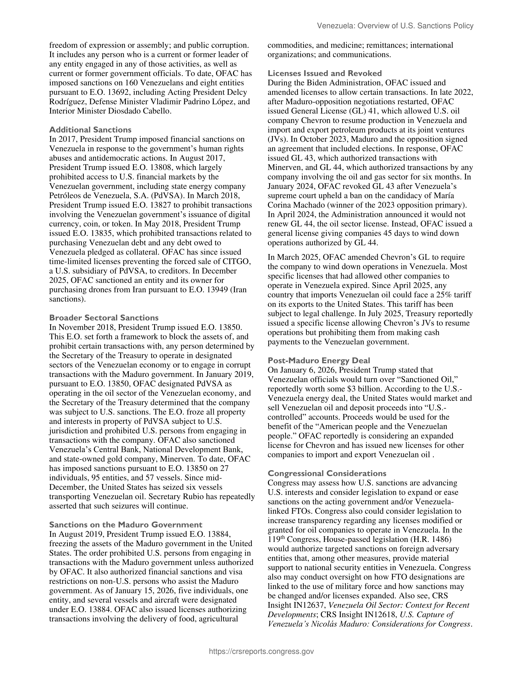 Since 2005, the United States has imposed targeted sanctions on Venezuelan individuals and entities that have engaged in criminal, antidemocratic, or corrupt actions. U.S. sanctions have been imposed via both executive and congressional action. Under President Nicolás Maduro (2013-2026), the first Trump Administration expanded U.S. sanctions. The Biden Administration offered limited sanctions relief to try to incentivize Madur...