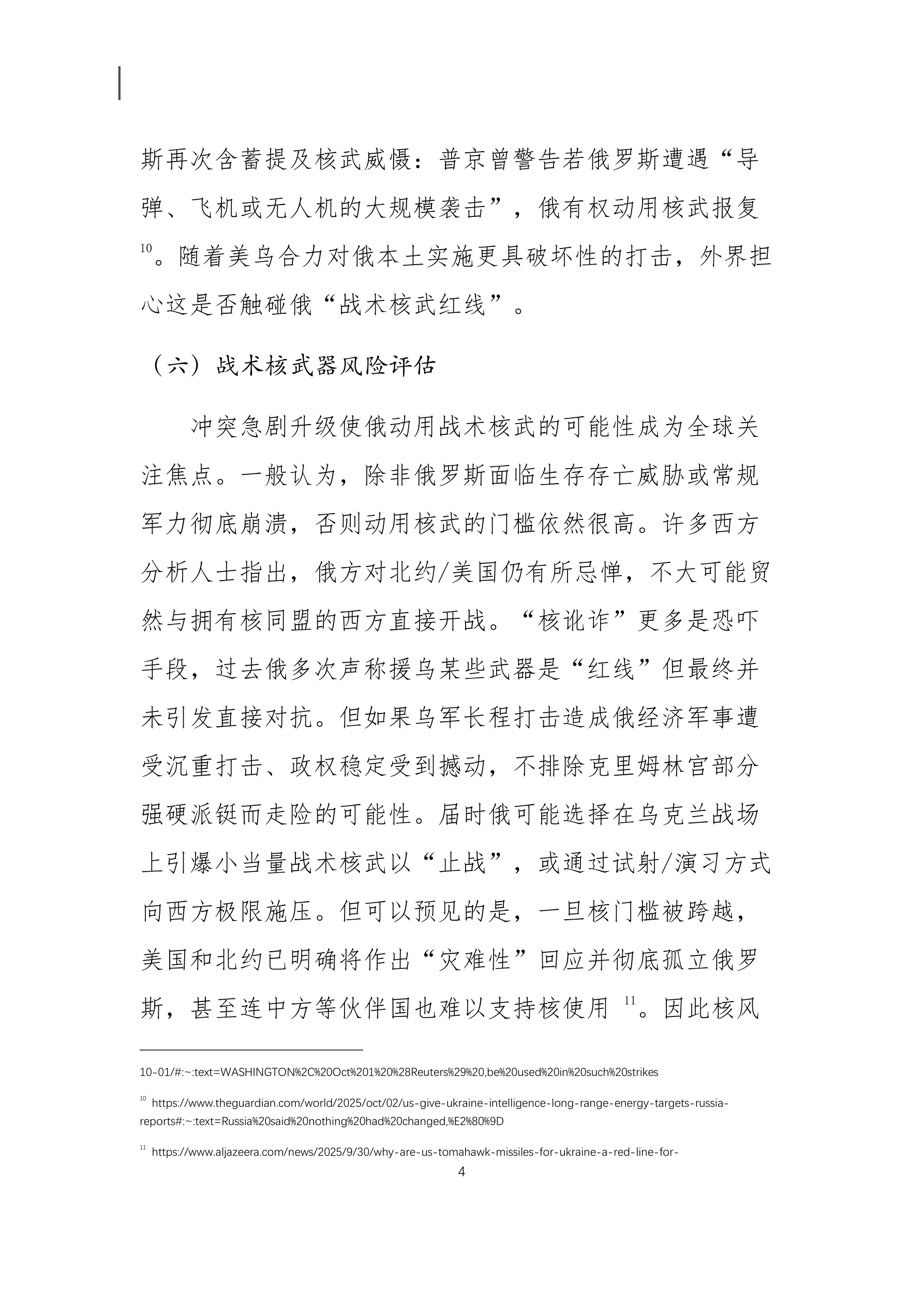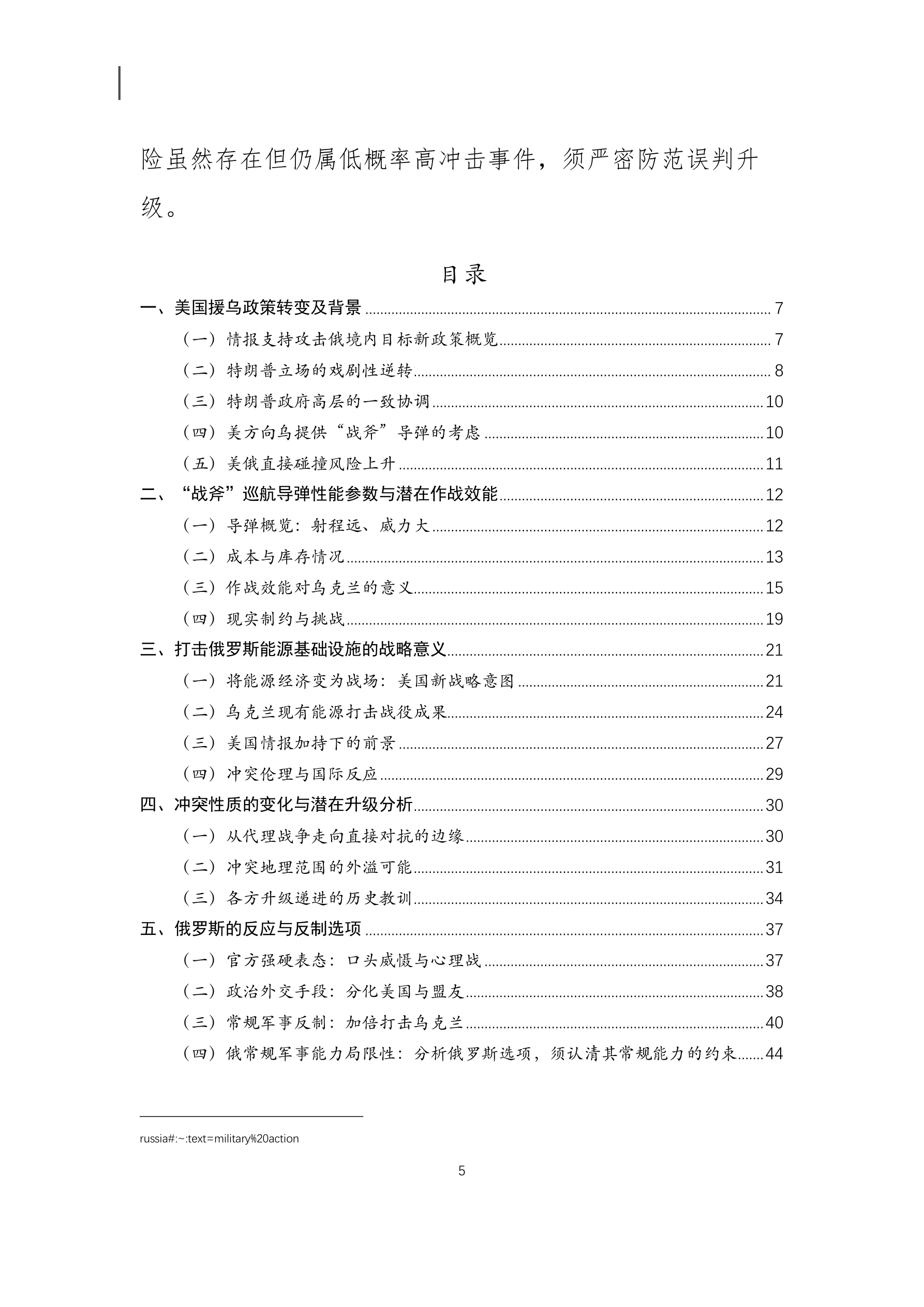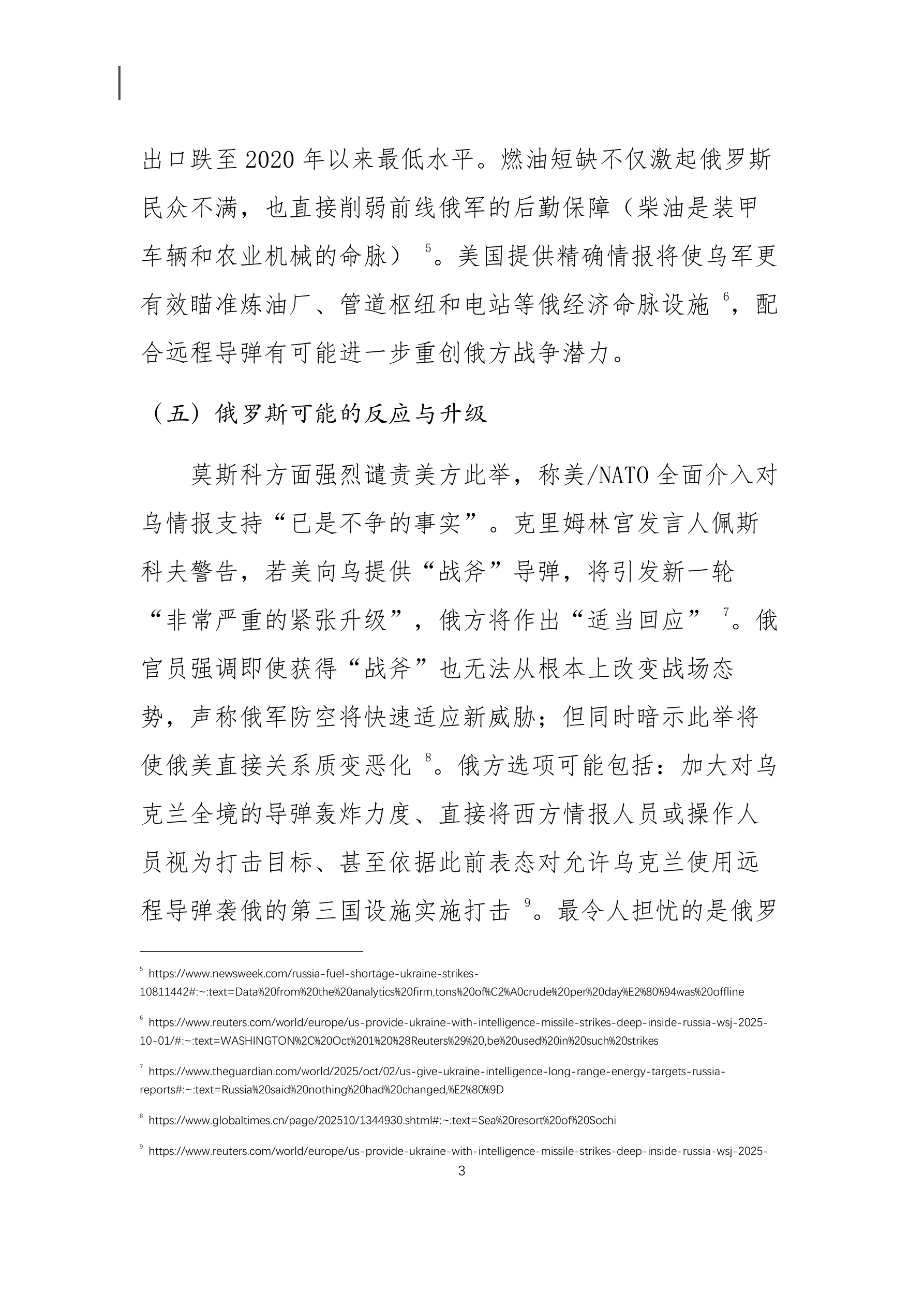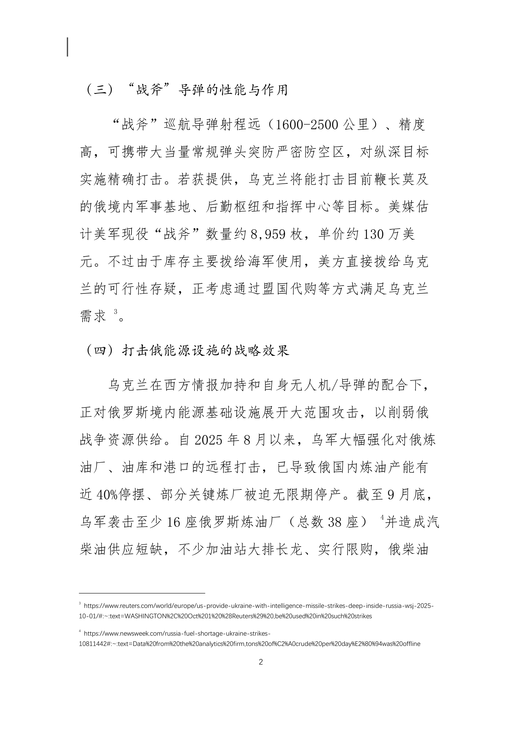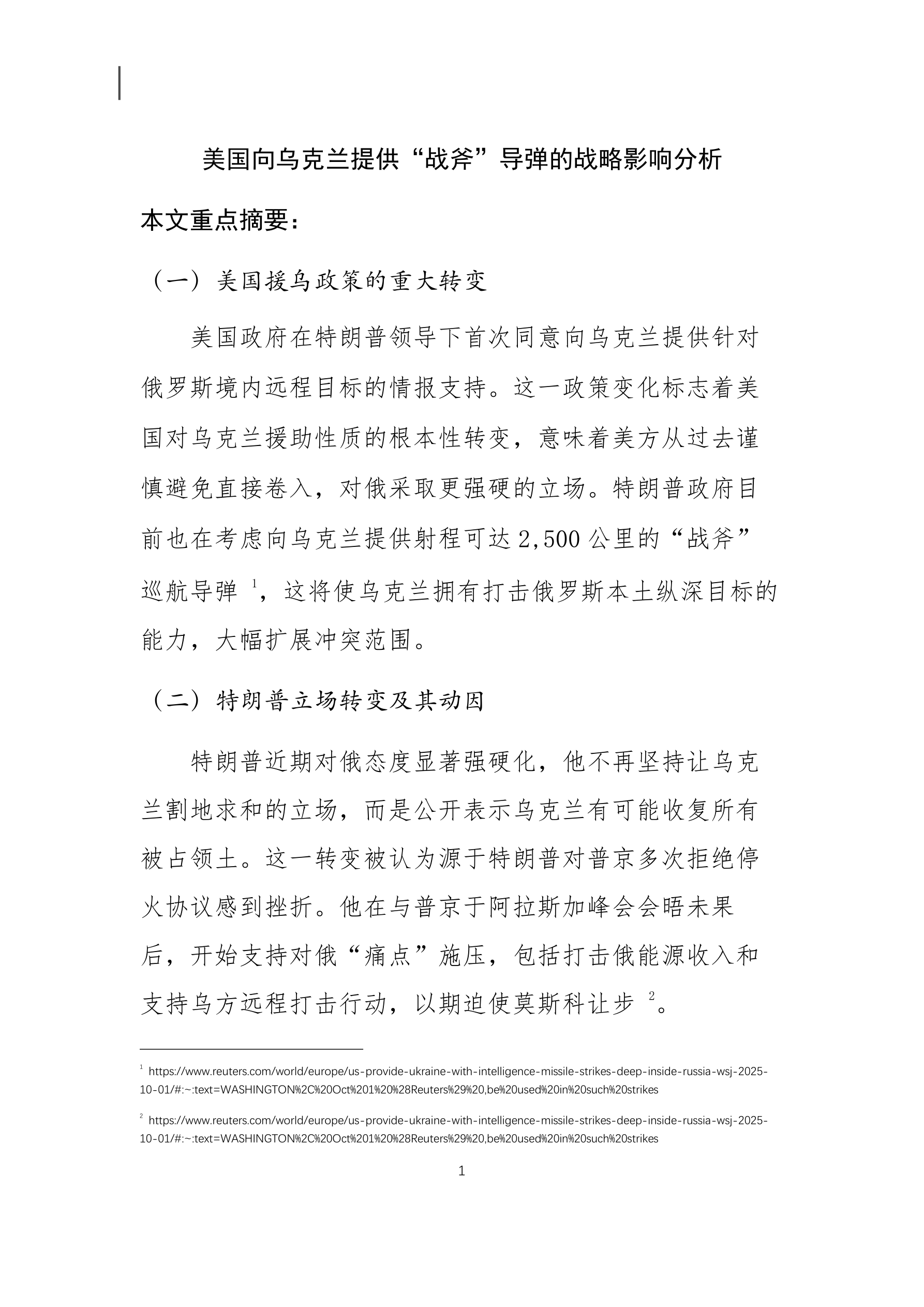 美国向乌克兰提供“战斧”导弹的战略影响分析 本文重点摘要: (一)美国援乌政策的重大转变 美国政府在特朗普领导下首次同意向乌克兰提供针对 俄罗斯境内远程目标的情报支持。这一政策变化标志着美 国对乌克兰援助性质的根本性转变,意味着美方从过去谨 慎避免直接卷入,对俄采取更强硬的立场。特朗普政府目 前也在考虑向乌克兰提供射程可达 2,500 公里的“战斧” 巡航导弹 ,这将使乌克兰拥有打击俄罗斯本土纵深目标的 能力,大幅扩展冲突范围。 (二)特朗普立场转变及其动因 特朗普近期对俄态度显著强硬化,他不再坚持让乌克 兰割地求和的立场,而是公开表示乌克兰有可能收复所有 被占领土。这一转变被认为源于特朗普对普京多次拒绝停 火协议感到挫折。他在与普京于阿拉斯加峰会会晤未果 后,开始支持对俄“痛点”施压,包括打击俄能源收入和 支持乌方远程打击行动,以期迫使莫斯科让步 。