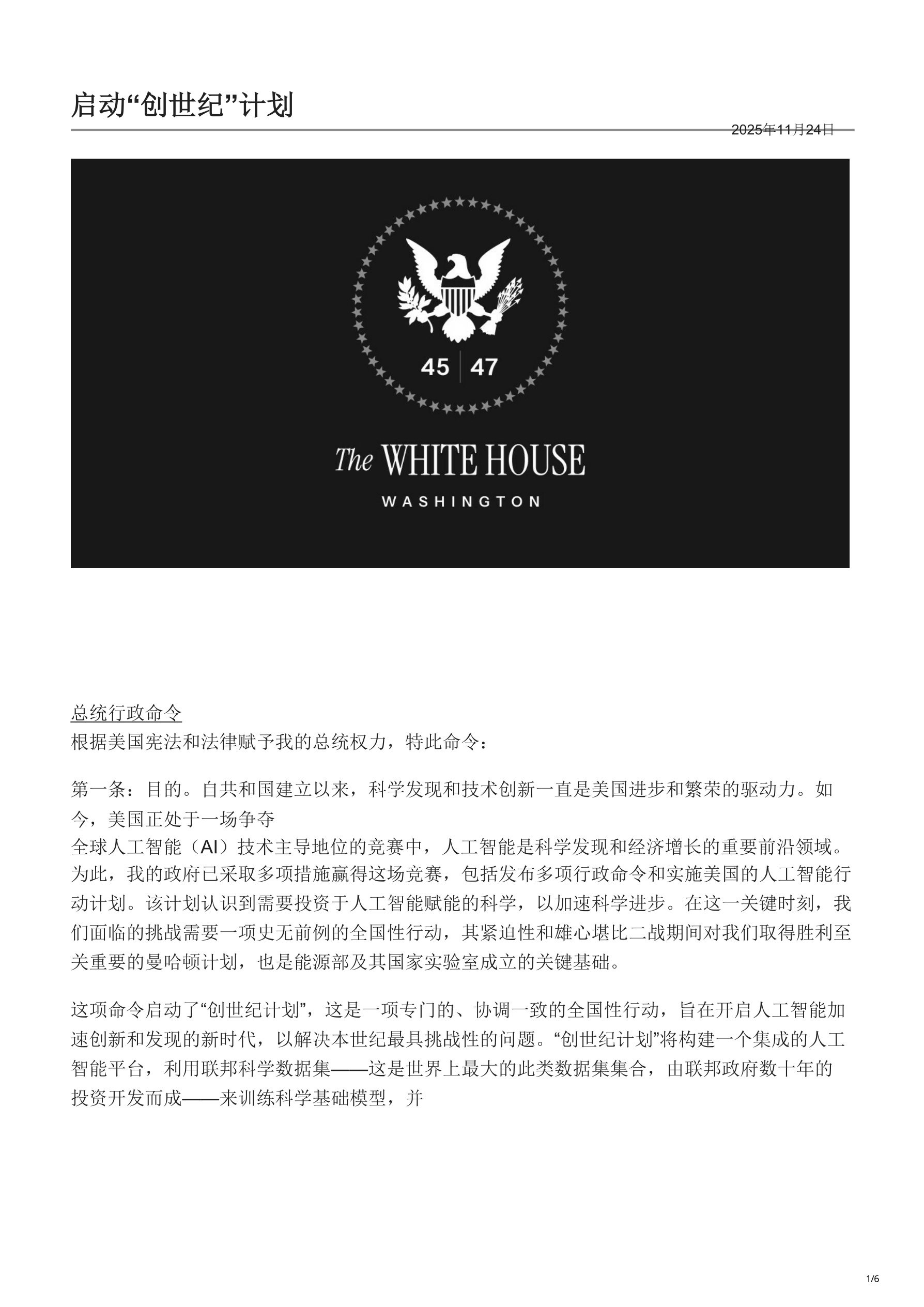 国家级人工智能战略“创世纪计划”(Genesis Mission)(译文)