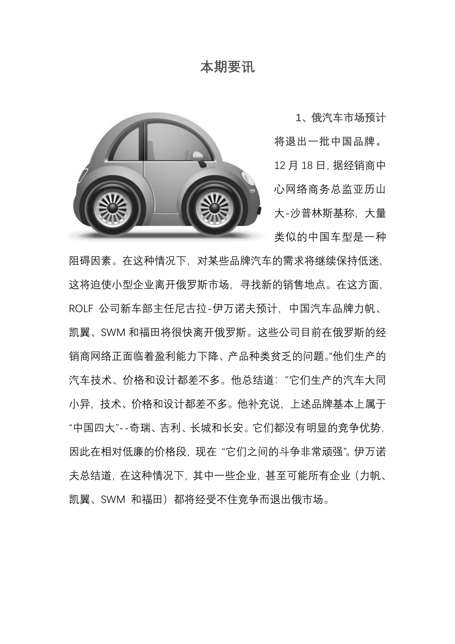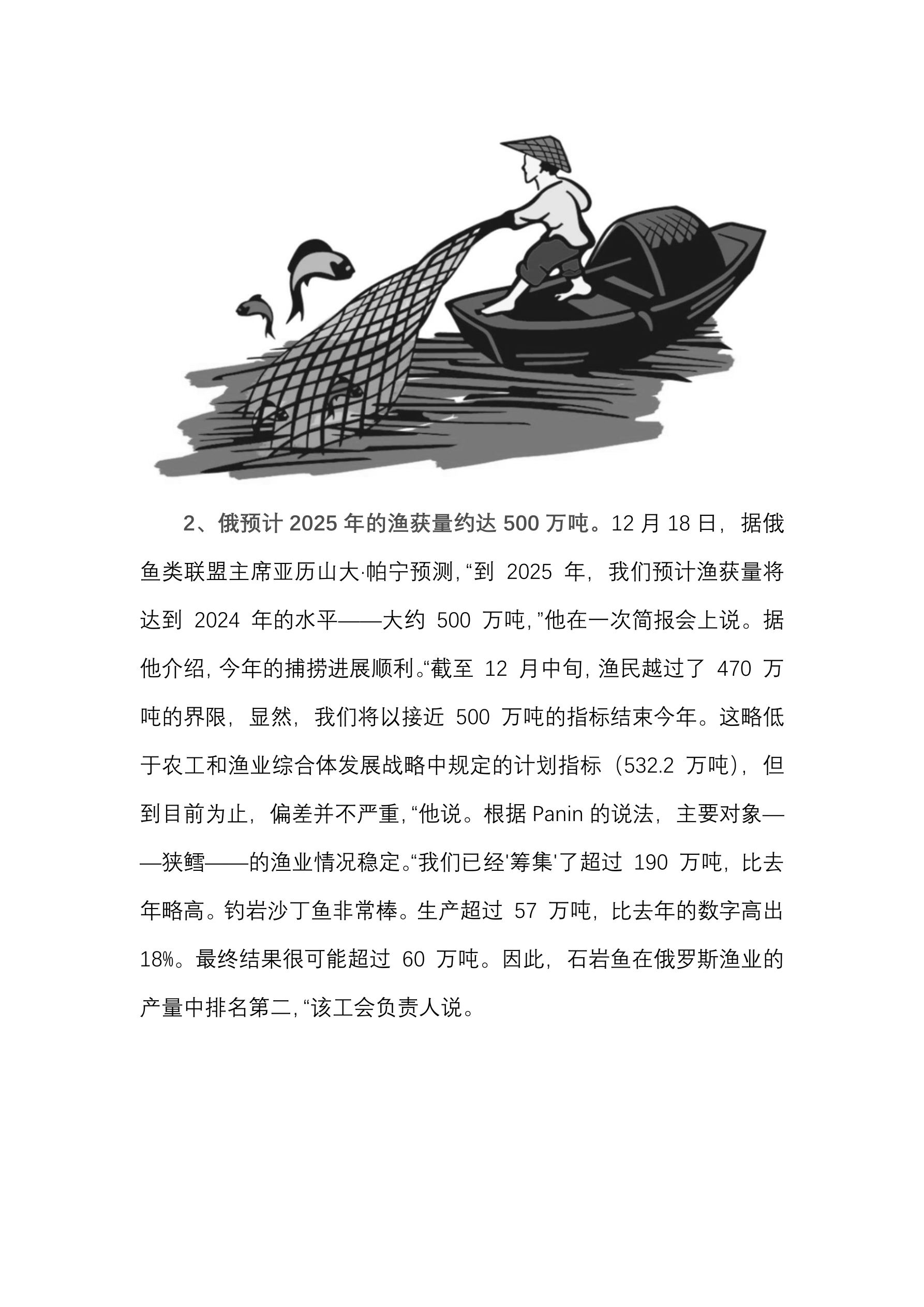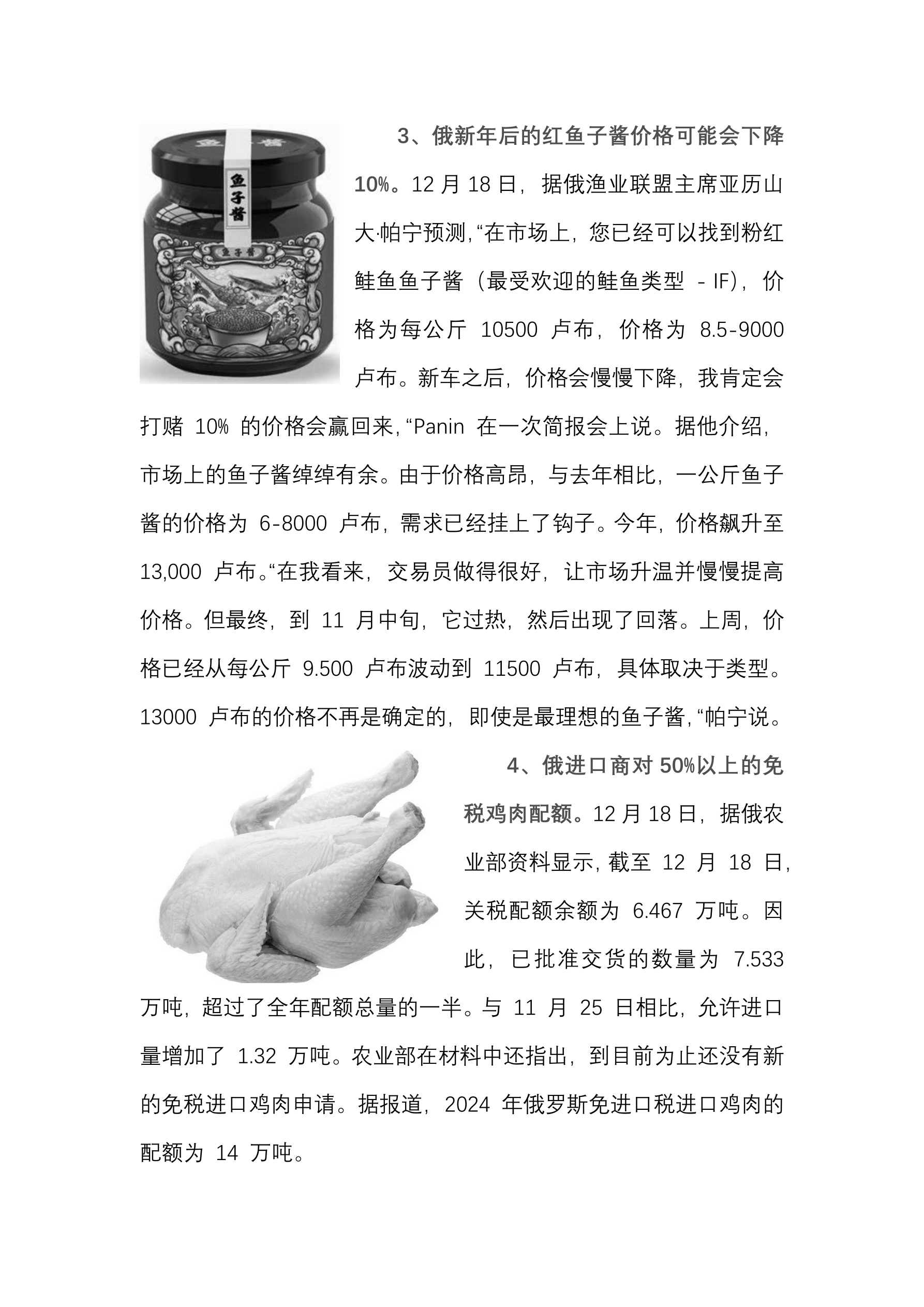 俄超过 30%的人更喜欢大众平价市场而不是品牌店。 (12 月 18 日 经济财经新闻) 可可豆价格首次超过每吨 8.7 万元人民币。 (12 月 18 日 经济财经新闻) 俄 11 月份上半个月鸡肉的平均消费价格为每公斤 15 元人民币。 (12 月 18 日 经济财经新闻) 俄副总理指出俄煤炭储量足够使用 500 年。 (12 月 18 日 经济财经新闻) 俄律师呼吁将儿童酗酒的罚款提高到 3500 元人民币。 (12 月 18 日 经济财经新闻) 俄副议长宣布计划成立一个委员会以应对物价上涨。 (12 月 18 日 经济财经新闻) 俄铁路 2025 年投资计划的金额将达到 628 亿人民币。 (12 月 18 日 经济财经新闻) 俄预计到 2030 年远东能源行业的投资将超过 2120 亿人民币。 (12 月 18 日 国际文传电讯社) 俄预计到 2050 年的能源战略假设液态碳氢化合物产量为 5.4 亿吨。 (12 月 18 日 国际文传电讯社) 俄截至 9 月底鱼类和海产品进口量达 42 万吨。 (12 月 18 日 国际文...