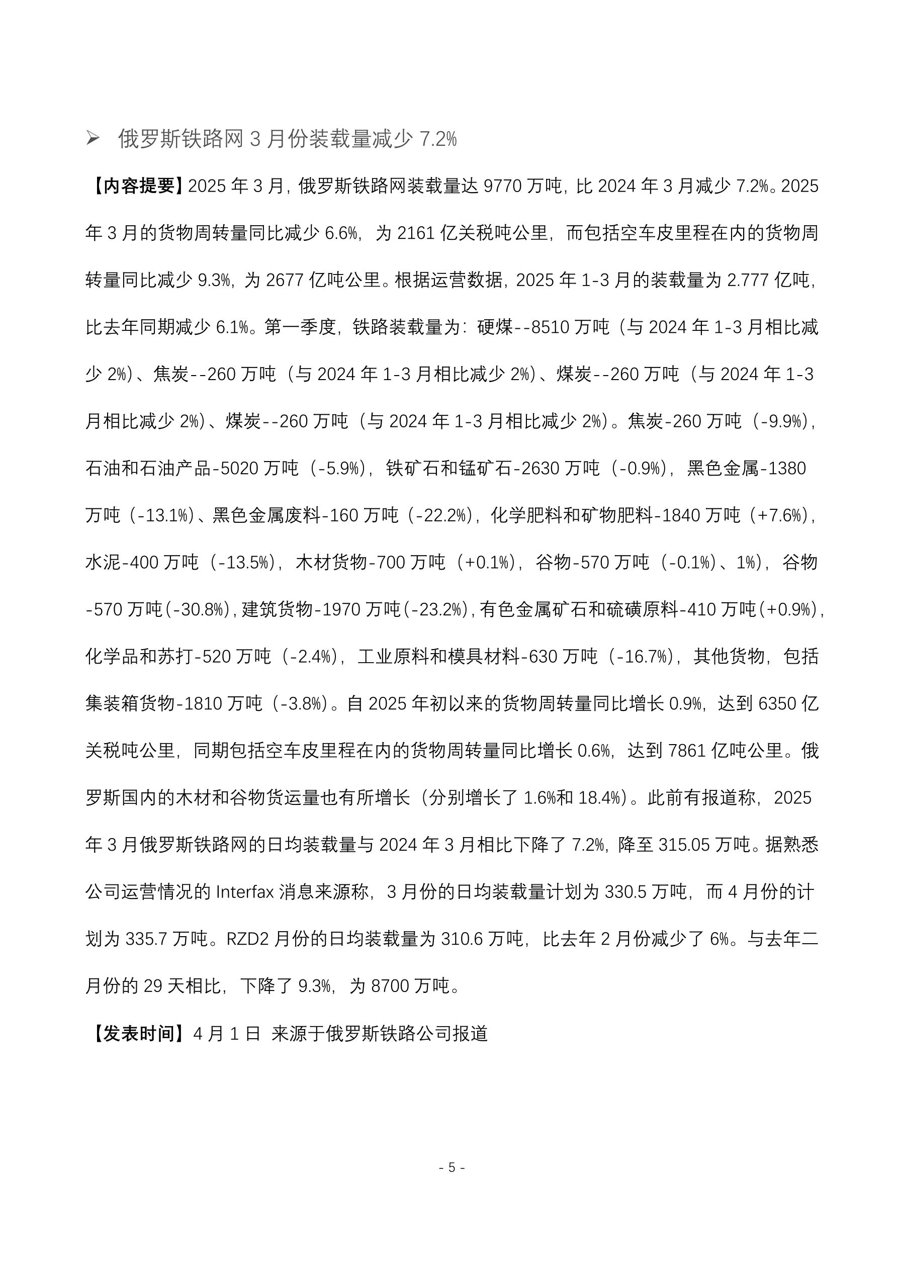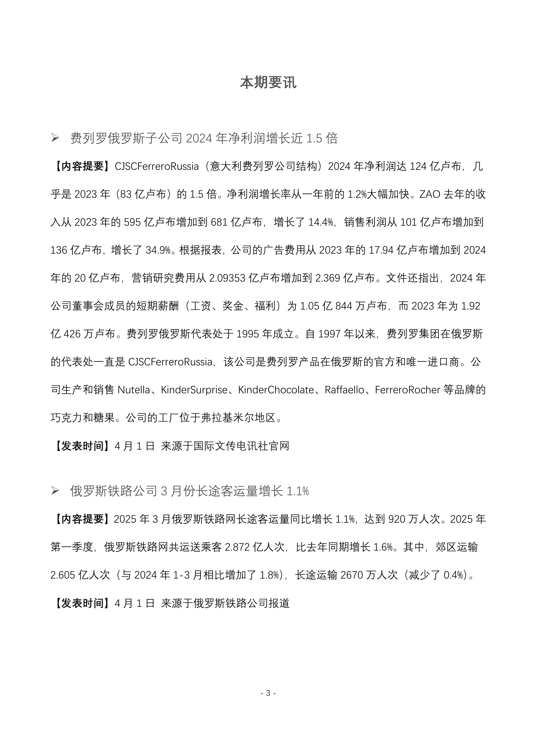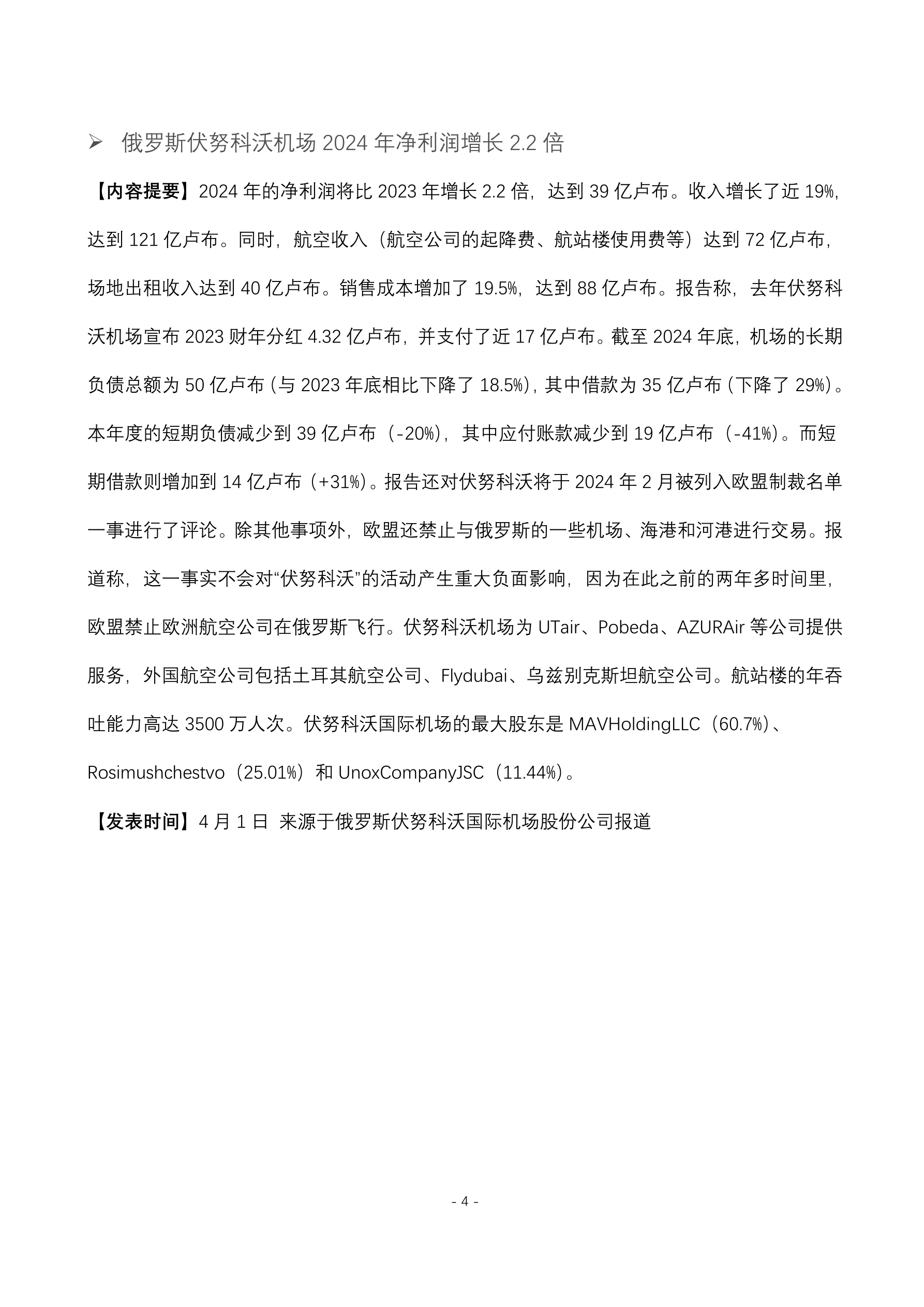 俄罗斯国家运输租赁公司又为莫斯科圣彼得堡高速公路的高速列车建设预付 15.5 亿人民币。 (4 月 1 日 俄罗斯国家运输租赁公司报道) 俄莫斯科交易所市场 3 月份总交易额为 12.85 万亿人民币。 (4 月 1 日 俄罗斯莫斯科交易所新闻稿) 俄罗斯伏努科沃国际机场 2024 年客流量增长 11% 达到 1610 万人次。 (4 月 1 日 俄罗斯伏努科沃国际机场股份公司报道) 俄罗斯纳米公司 2024 年在俄罗斯科学院下的收入从 2023 年的 2.07 亿人民币增至 7.25 亿人民币 增长 3.5 倍。 月 1 日 俄罗斯纳米股份公司声明) (4 俄 3 月份出口小麦 178.4 万吨 同比去年 3 月份减少 1.9 倍。 (4 月 1 日 俄罗斯谷物联盟监测) 俄启动了市政和建筑道路设备优惠租赁计划 预计到 2030 年租赁总额将达 43.2 亿人民币。 (4 月 1 日 俄罗斯联邦工业和贸易部报道) 俄铁路公司 3 月份共运送旅客 1.026 亿人次 比 2024 年 3 月增加 0.9%。 (4 月 1 日 俄罗...