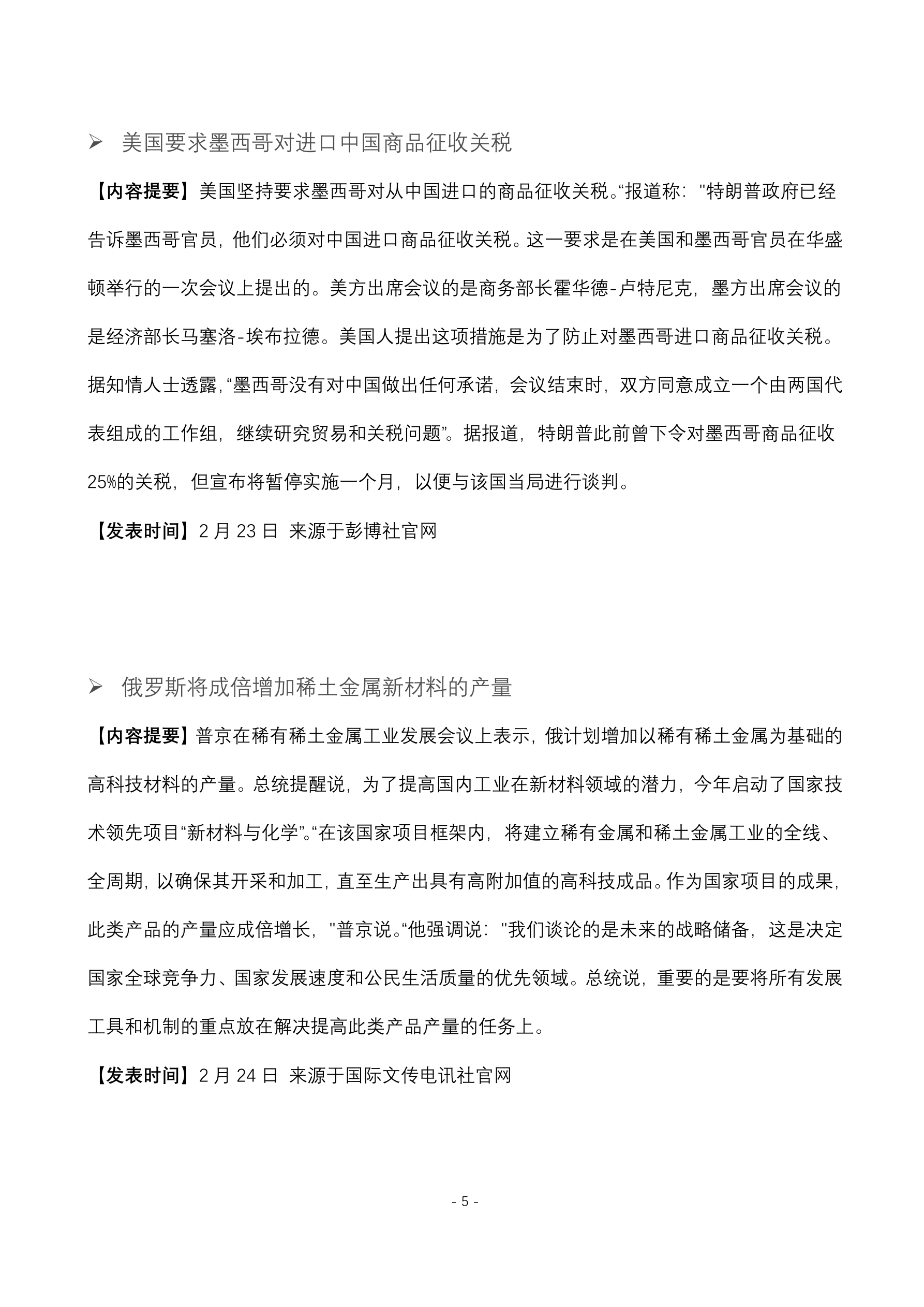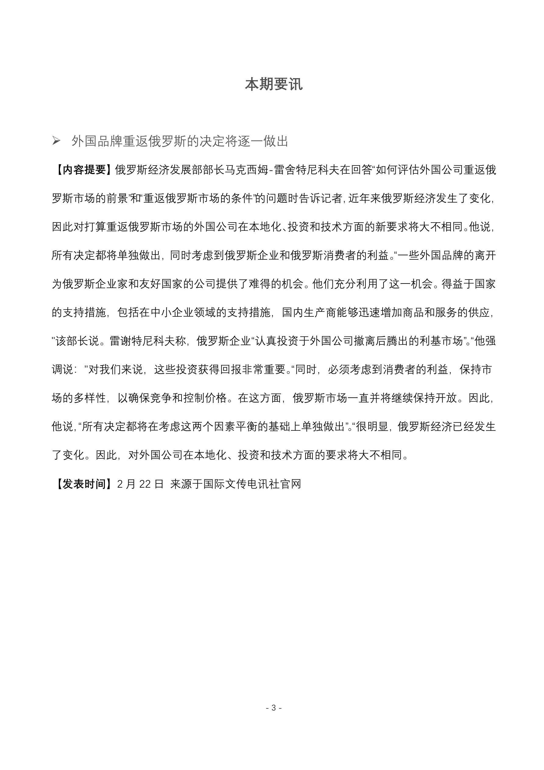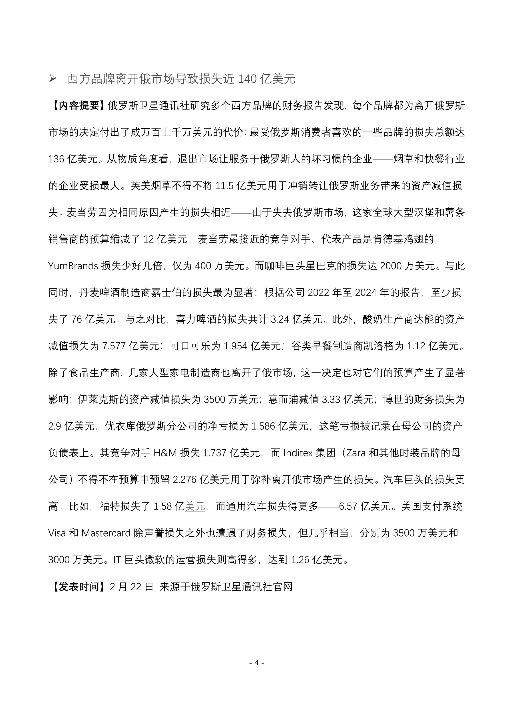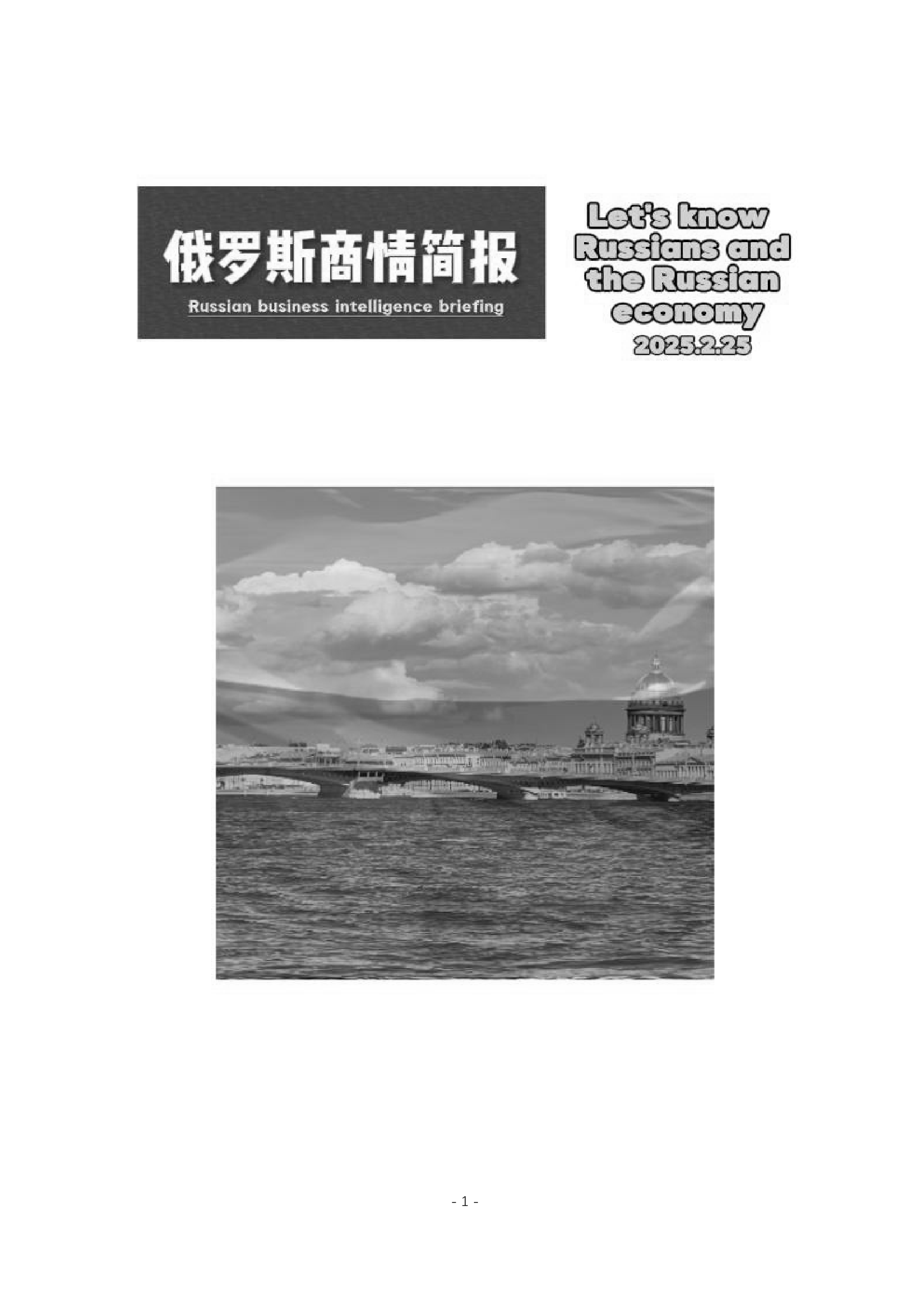 布伦特原油价格为每桶 540 元人民币。 月 24 日 伦敦 ICE 期货交易所官网) (2 俄工业和贸易部部准备拨款 12.6 亿人民币用于补贴俄铁路公司购买铁路工程产品。 (2 月 24 日 国际文传电讯社官网) 中国 2024 年从俄进口 360 万吨绵羊毛 是 2023 年的 4 倍。 (2 月 24 日 中国 GTU 数据报告) 中国 2024 年从俄进口价值约 1.5 亿人民币的亚麻纤维 比 2023 年增加 38%。 (2 月 24 日 中国 GTU 数据报告) 俄在中国亚麻供应商中排名第四 前三位分别是法国 68 亿人民币 比利时 10.8 亿人民币 埃及 6 亿 人民币。 月 24 日 俄罗斯农产品出口中心报道) (2 俄罗斯有 2175 个生产鲑鱼的渔场 这些渔场的租期大部分将于 2027-2028 年到期。 (2 月 24 日 全俄渔业生产者协会报道) 俄黄金公司启动大学生赴中国培训项目。 (2 月 24 日 俄罗斯《生意人报》报道) 俄直投基金自成立以来与外国伙伴共投资 1841 亿人民币。 (2 月 ...