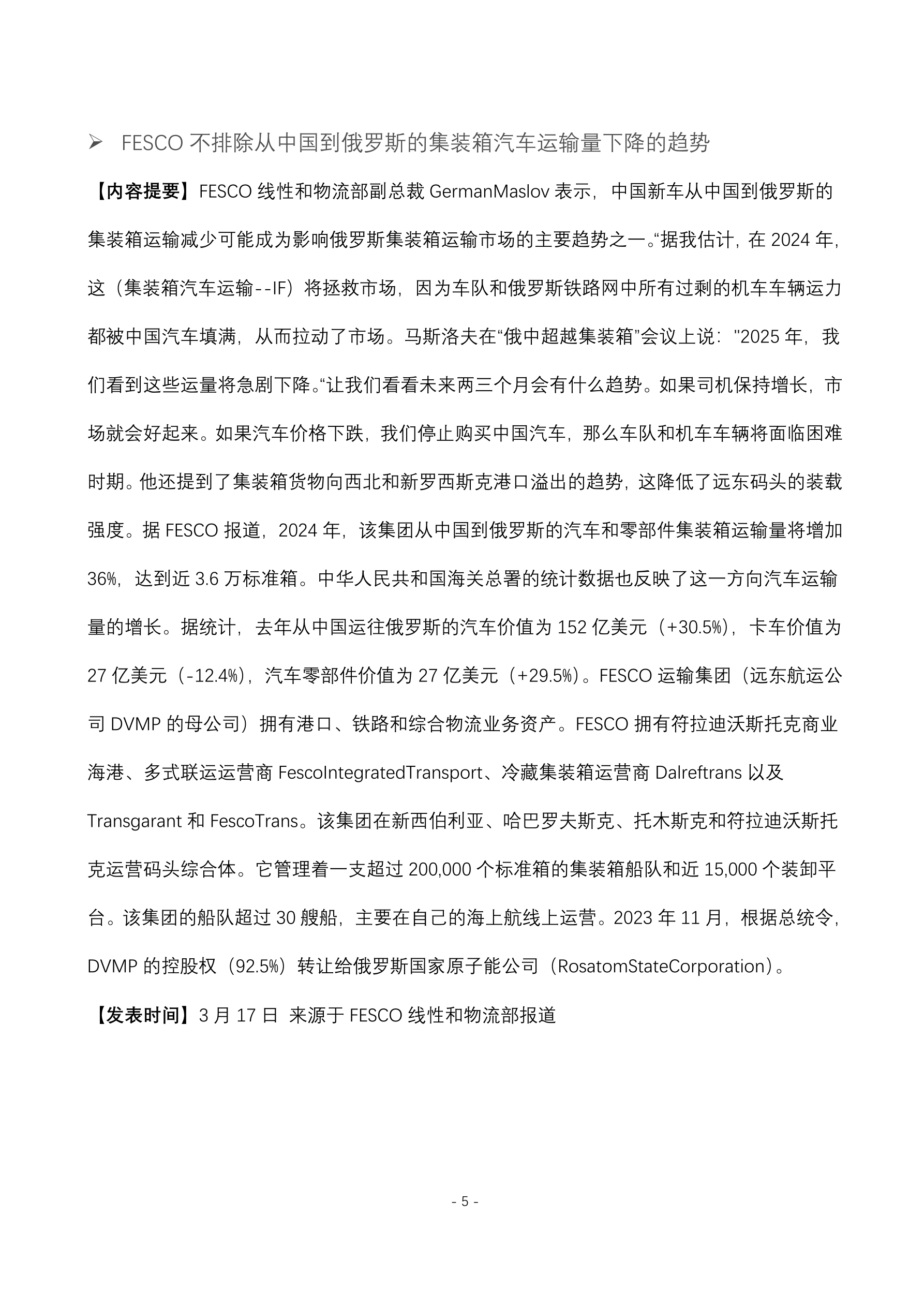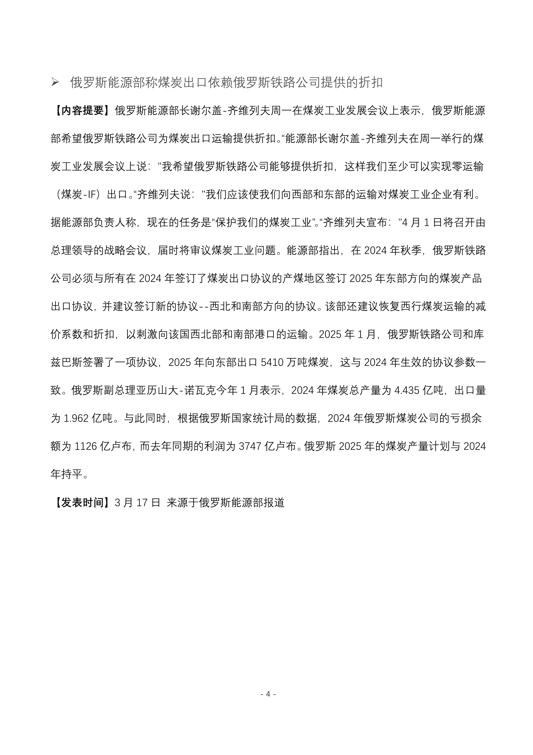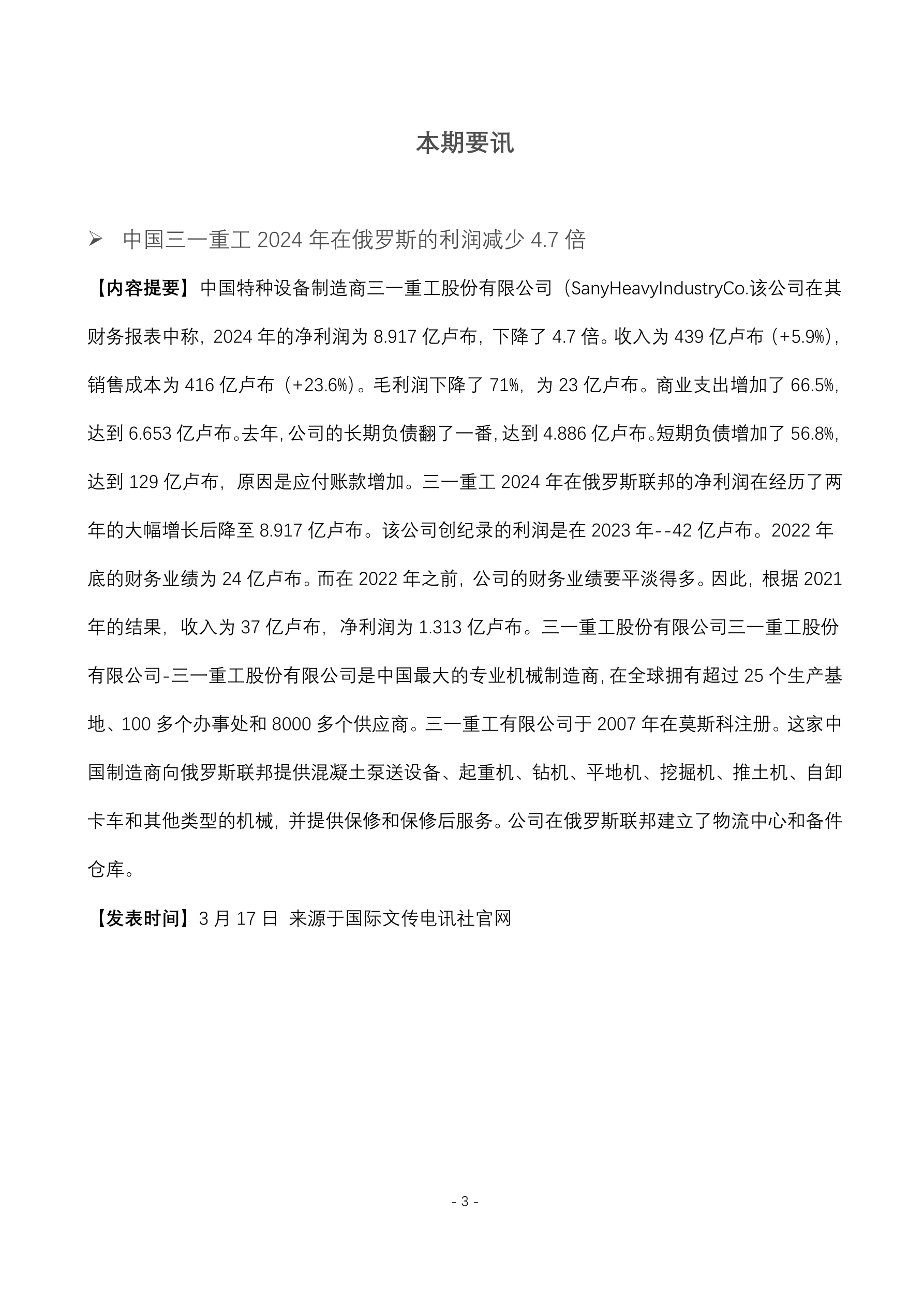 俄在 2025 年拨款超 6.8 亿人民币用于补贴农产品出口商优惠贷款计划。 (3 月 17 日 俄罗斯国家内阁新闻处报道) 俄 1 月出口食品和农业原材料 238 亿人民币 比去年 1 月增加 7.4%。 (3 月 17 日 俄罗斯国家统计局数据) 俄渔业局局长希望 2025 年捕鱼量增至 500 万吨。 (3 月 17 日 俄罗斯渔业局报道) 俄国际钢铁股份公司 2024 年资本支出增至 25.8 亿人民币。 (3 月 18 日 国际文传电讯社官网) 俄联合利华公司 2024 年冰淇淋产量提高 20% 达到 4.8 万吨。 (3 月 18 日 国际文传电讯社官网) 俄 PhosAgro 集团计划在 2025 年将化肥产量提高 6% 达到 1250 万吨。 (3 月 18 日 俄罗斯 PhosAgro 集团公报) 全球针对俄罗斯个人和实体的制裁为 28595 项。 (3 月 18 日 俄罗斯财政部统计数据) 俄 2024 年出口价值 994 亿人民币的武器 在世界武器贸易分析中心专家编制的排名中位居第二。 (3 月 18 日...