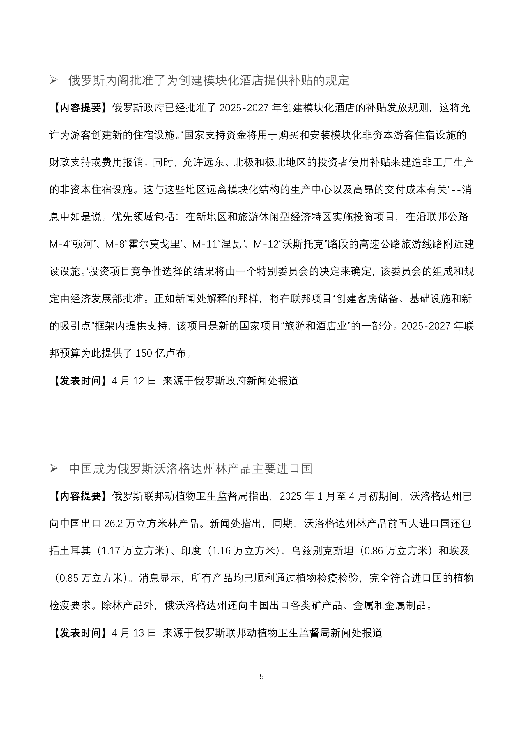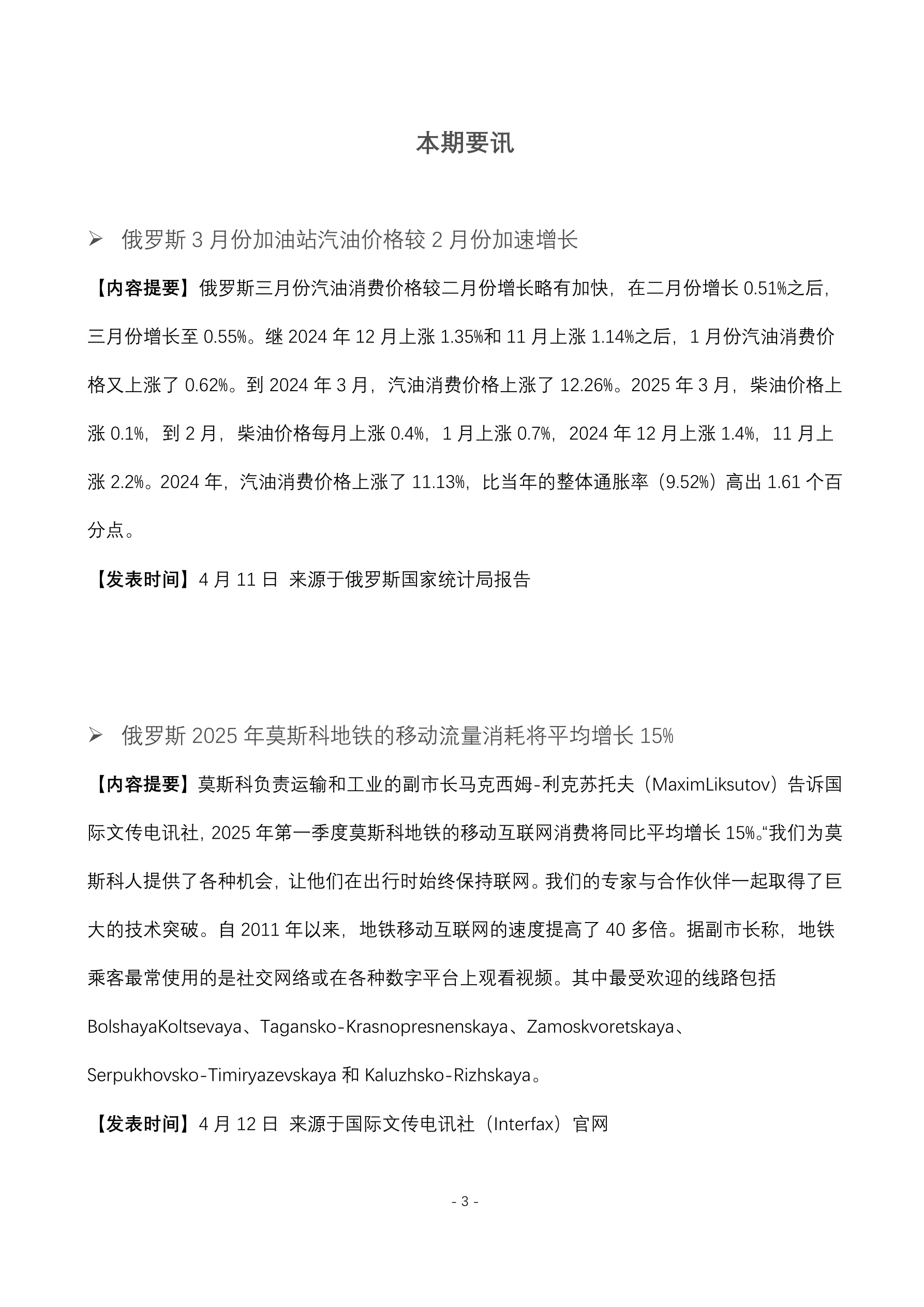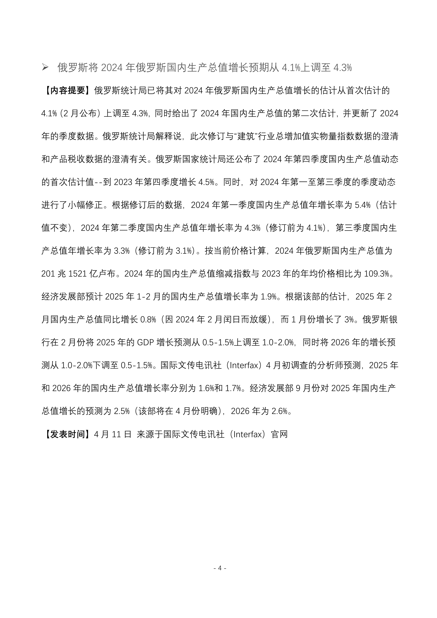 俄农场截至 4 月 1 日油籽库存为 313.2 万吨 比 2024 年同期增加 1.1%。 (4 月 14 日 俄罗斯国家统计局统计数据) 俄计划到 2050 年将天然气产量增至 1.1 万亿立方米。 (4 月 14 日 俄罗斯联邦政府官网) 俄预计到 2030 年俄罗斯石油产量将增至每年 5.4 亿吨。 (4 月 14 日 俄罗斯《能源战略》消息) 俄农场截至 4 月 1 日小麦库存为 977.6 万吨 比 2024 年同期减少三分之一。 (4 月 14 日 俄罗斯国家统计局统计数据) 俄能源战略 2050 年前的目标方案中石油出口量预计为每年 2.35 亿吨。 (4 月 14 日 国际文传电讯社官网) 俄大豆收成从 2023 年的 682.6 万吨增至 2024 年的 705.5 万吨。 (4 月 14 日 俄罗斯国家统计局统计数据) 俄 2024 年出口 1.09 亿吨农产品 是世界第三大农产品供应国。 (4 月 14 日 俄罗斯国家农业部报道) 中俄截至今年 1~3 月贸易额与 2024 年同期相比下降 6.6% 达...