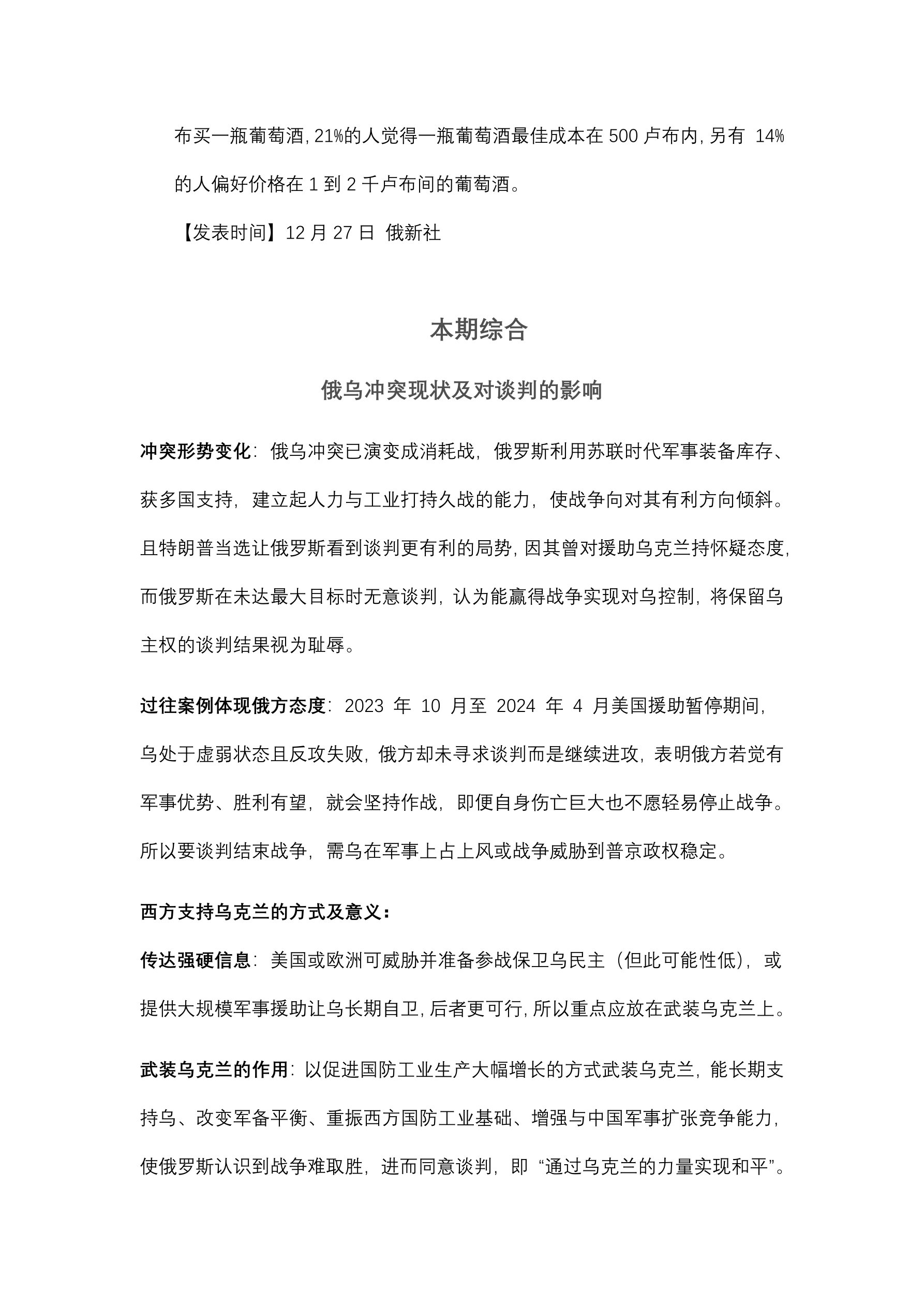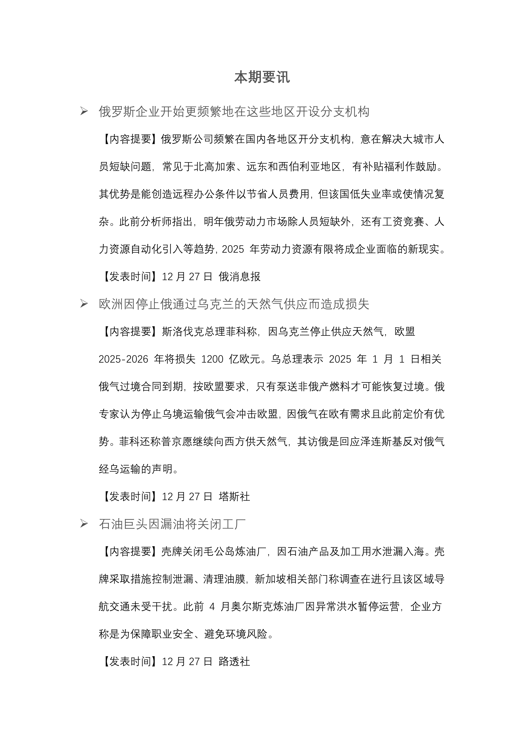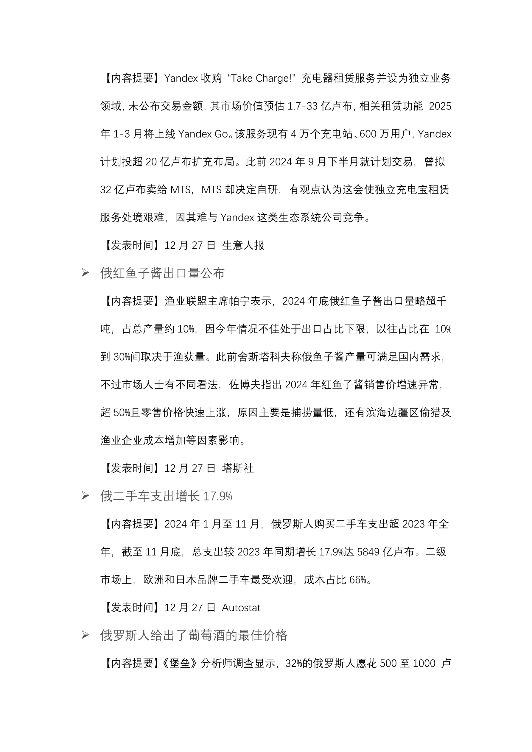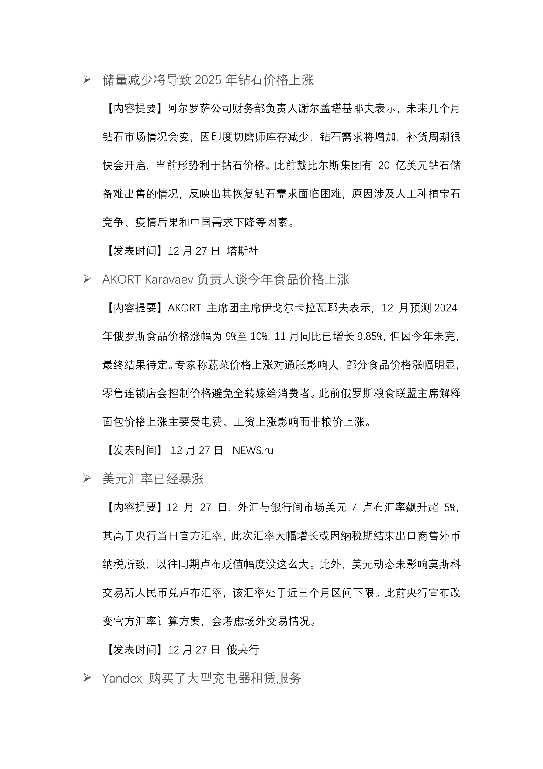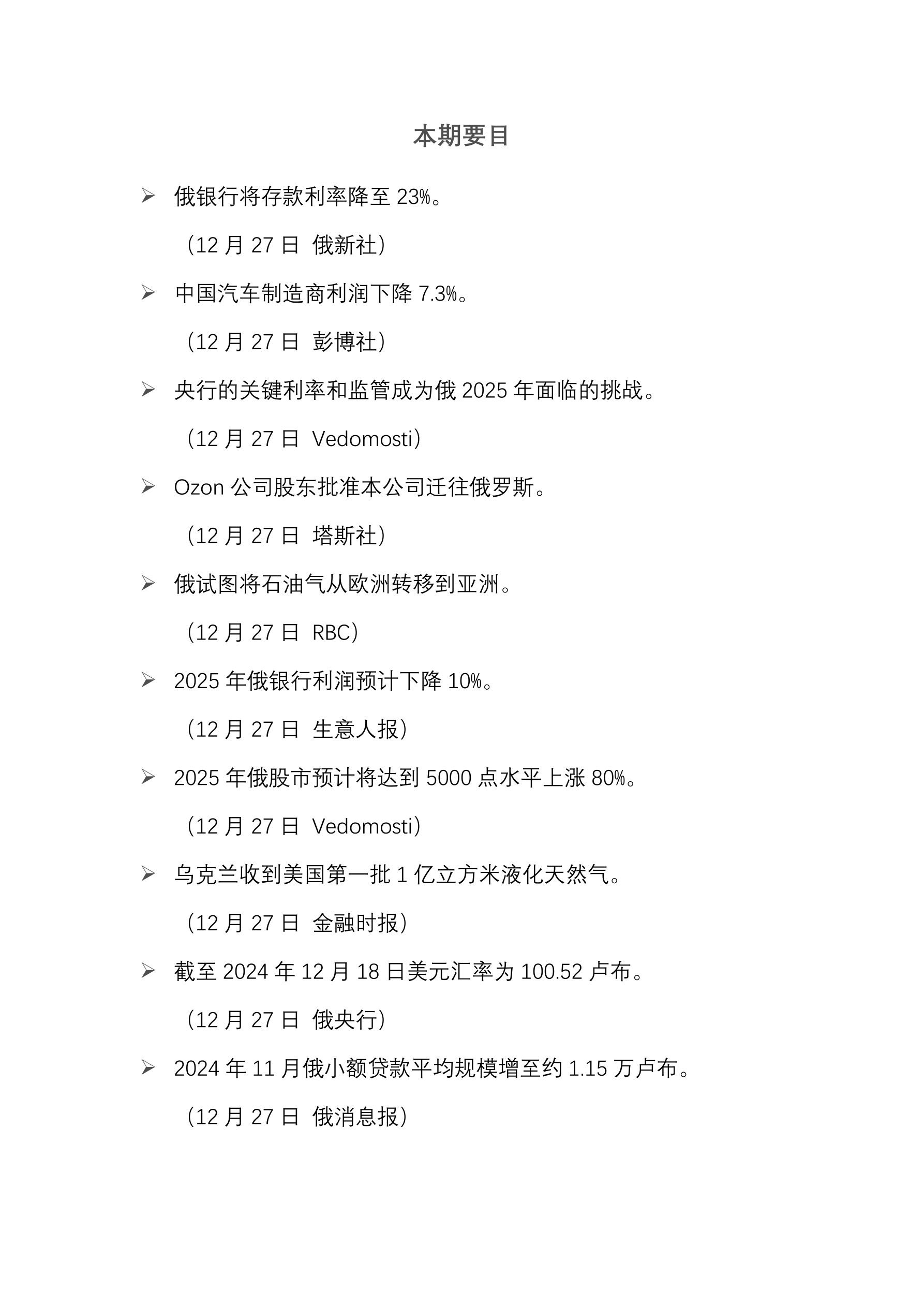 俄银行将存款利率降至 23%。 (12 月 27 日 俄新社) 中国汽车制造商利润下降 7.3%。 (12 月 27 日 彭博社) 央行的关键利率和监管成为俄 2025 年面临的挑战。 (12 月 27 日 Vedomosti) Ozon 公司股东批准本公司迁往俄罗斯。 (12 月 27 日 塔斯社) 俄试图将石油气从欧洲转移到亚洲。 (12 月 27 日 RBC) 2025 年俄银行利润预计下降 10%。 (12 月 27 日 生意人报) 2025 年俄股市预计将达到 5000 点水平上涨 80%。 (12 月 27 日 Vedomosti) 乌克兰收到美国第一批 1 亿立方米液化天然气。 (12 月 27 日 金融时报) 截至 2024 年 12 月 18 日美元汇率为 100.52 卢布。 (12 月 27 日 俄央行) 2024 年 11 月俄小额贷款平均规模增至约 1.15 万卢布。 (12 月 27 日 俄消息报)