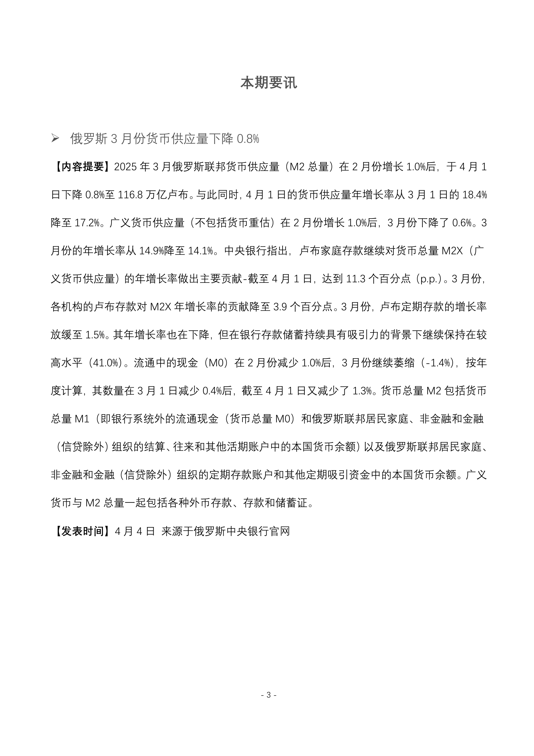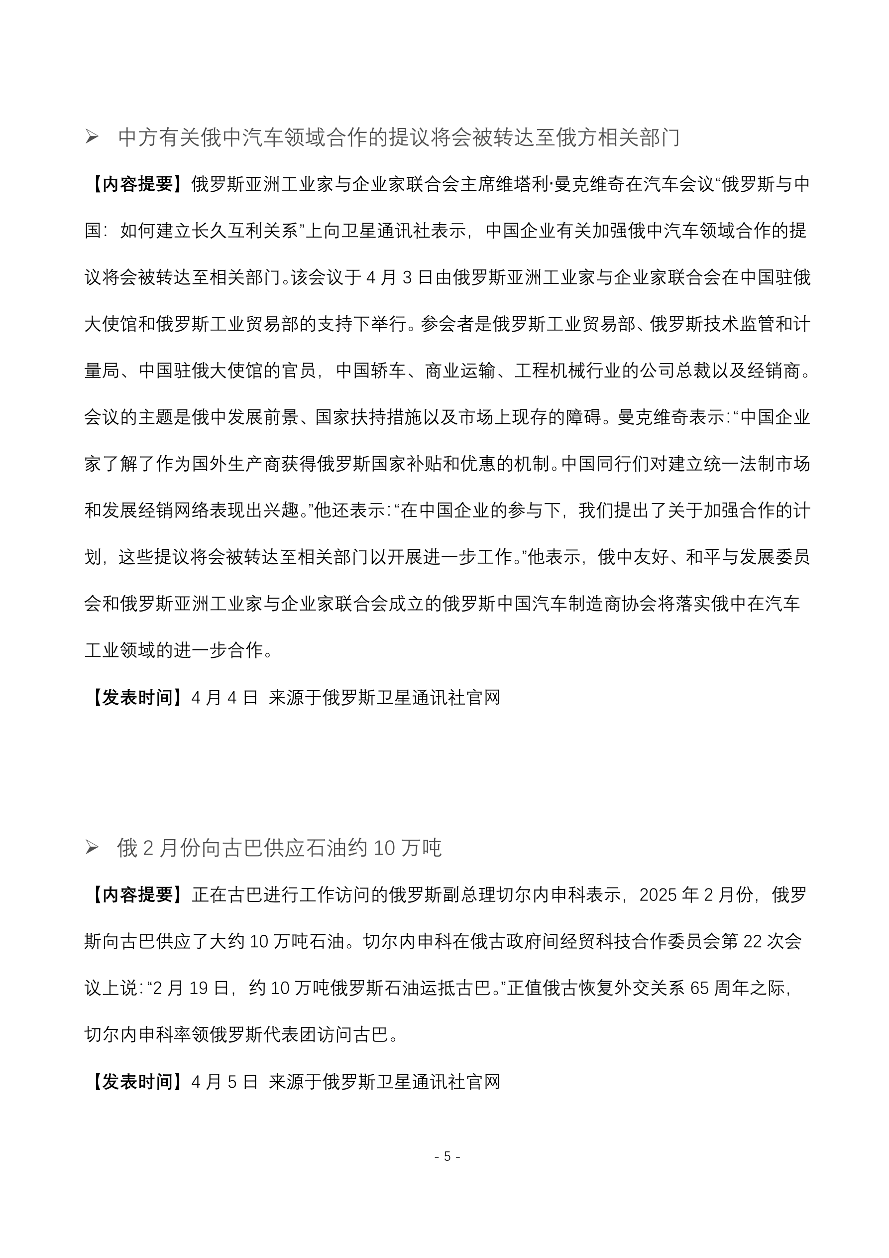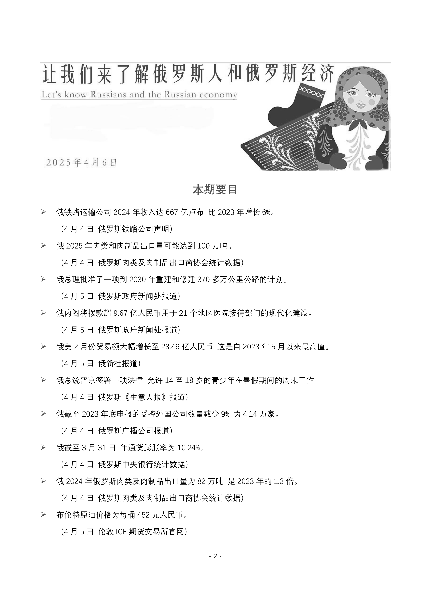 俄铁路运输公司 2024 年收入达 667 亿卢布 比 2023 年增长 6%。 (4 月 4 日 俄罗斯铁路公司声明) 俄 2025 年肉类和肉制品出口量可能达到 100 万吨。 (4 月 4 日 俄罗斯肉类及肉制品出口商协会统计数据) 俄总理批准了一项到 2030 年重建和修建 370 多万公里公路的计划。 (4 月 5 日 俄罗斯政府新闻处报道) 俄内阁将拨款超 9.67 亿人民币用于 21 个地区医院接待部门的现代化建设。 (4 月 5 日 俄罗斯政府新闻处报道) 俄美 2 月份贸易额大幅增长至 28.46 亿人民币 这是自 2023 年 5 月以来最高值。 (4 月 5 日 俄新社报道) 俄总统普京签署一项法律 允许 14 至 18 岁的青少年在暑假期间的周末工作。 (4 月 4 日 俄罗斯《生意人报》报道) 俄截至 2023 年底申报的受控外国公司数量减少 9% 为 4.14 万家。 (4 月 4 日 俄罗斯广播公司报道) 俄截至 3 月 31 日 年通货膨胀率为 10.24%。 (4 月 4 日 俄罗斯中央银行统...