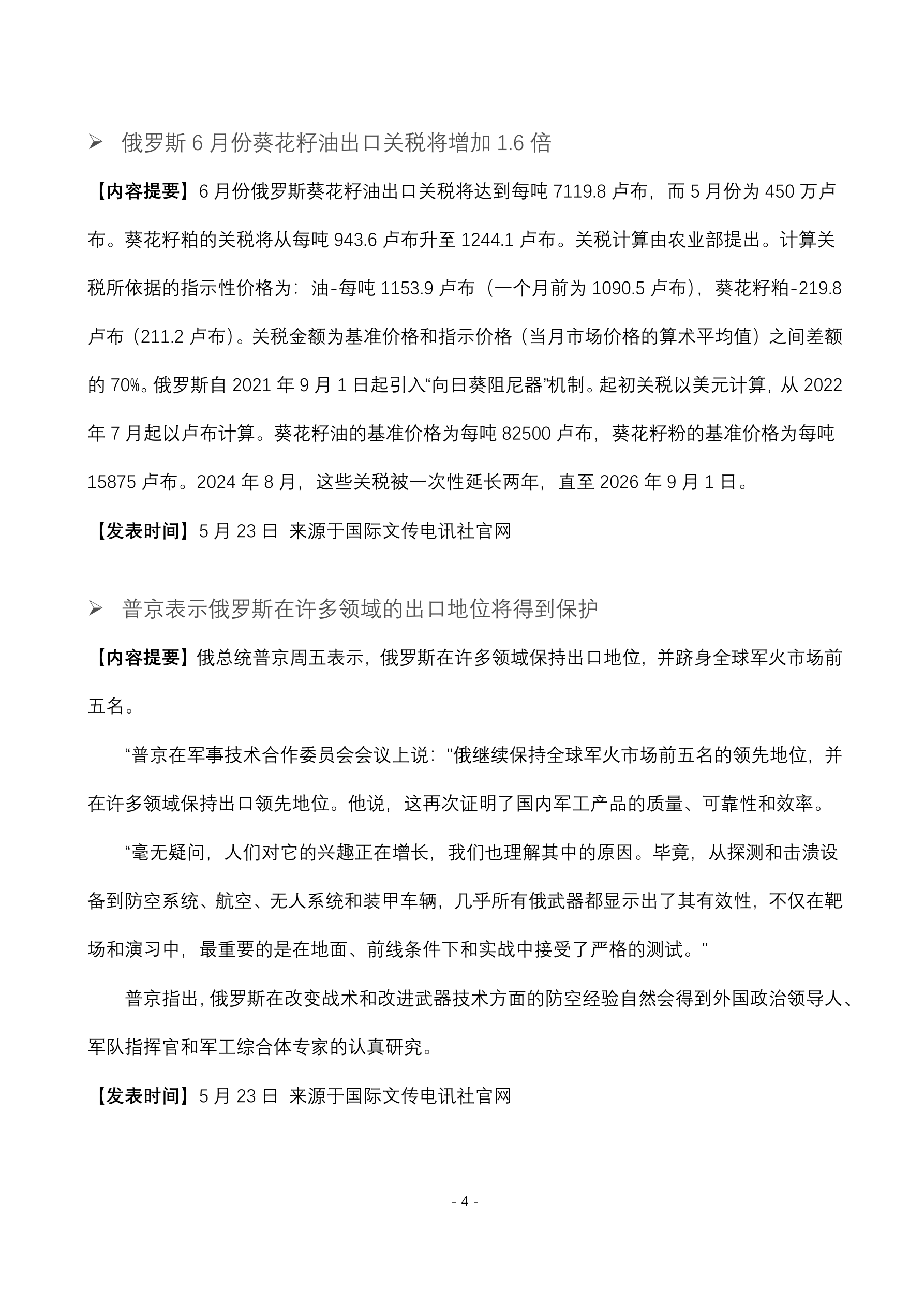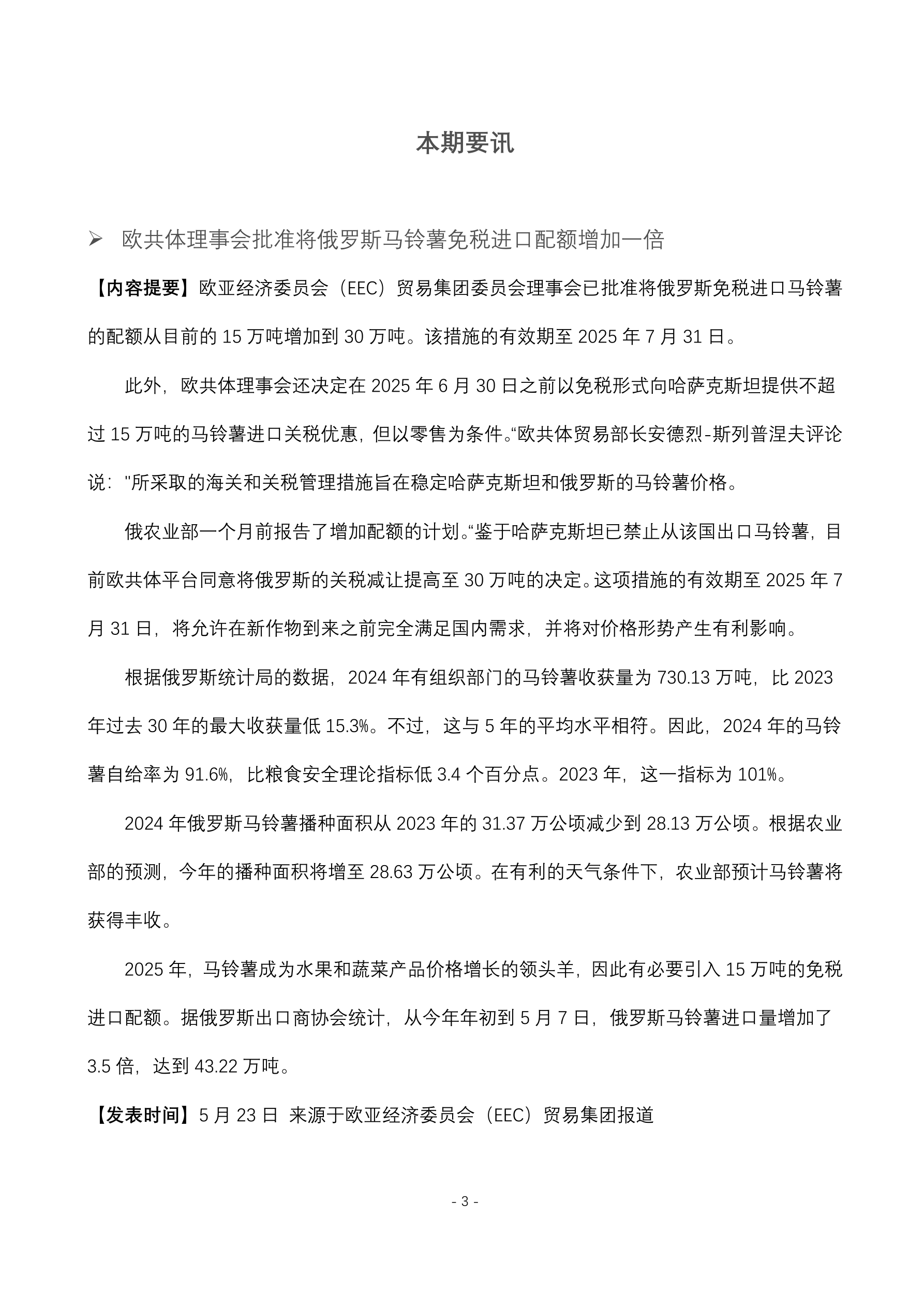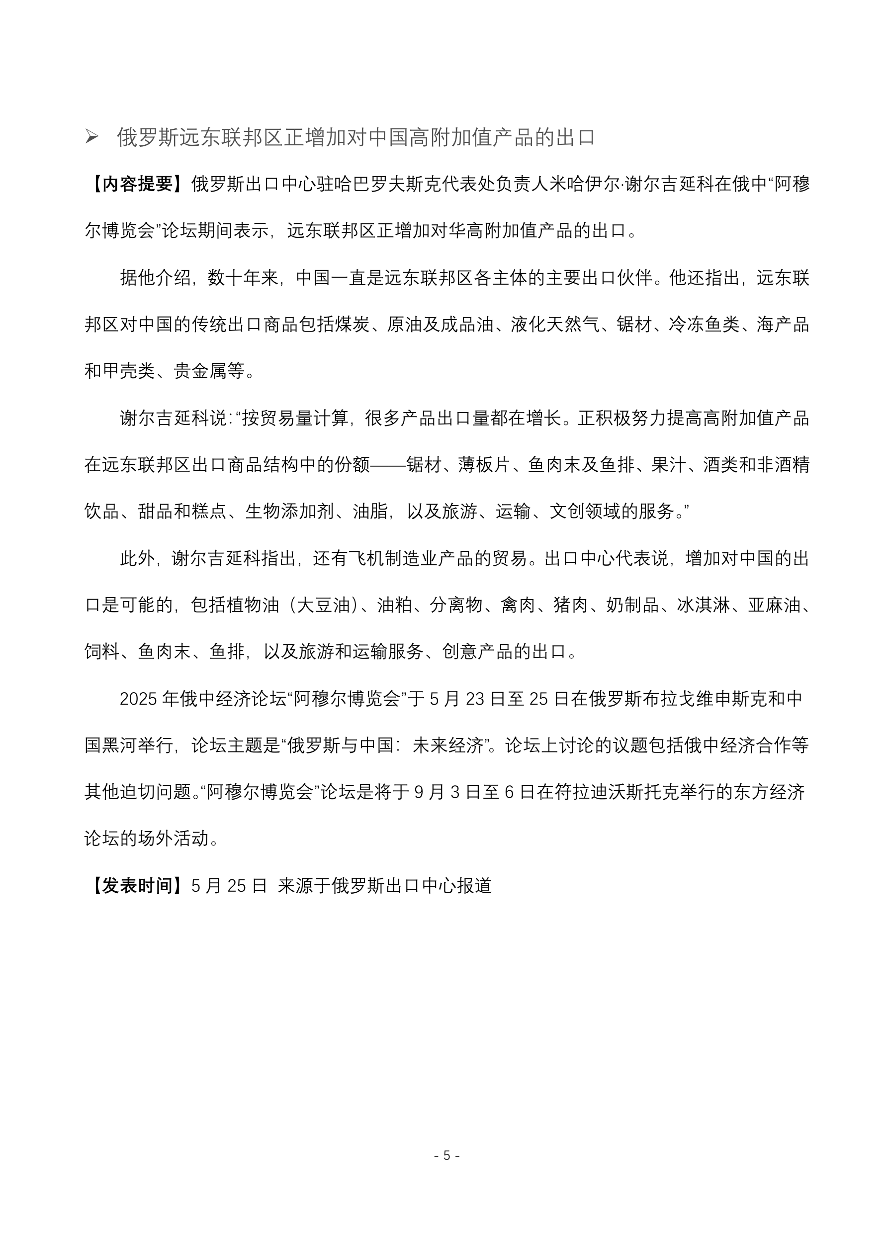 俄 2025 年第一季度在线贸易规模达 2324 亿人民币 同比增长 36%。 (5 月 15 日 俄罗斯电商企业协会报道) 俄阿穆尔矿业公司签署了 10 年内每年向中国供应 100 万吨铁精矿的协议。 (5 月 23 日 俄罗斯远东发展集团消息) 俄中今年 1~4 月份的贸易额为 5101 亿人民币。 (5 月 12 日 中国海关总署报道) 俄中 2024 年服务贸易额达到 918 亿人民币 占两国贸易总额的 10.8%。 (5 月 23 日 中国驻莫斯科旅游办事处消息) 中国 4 月份向俄出口 2300 吨芒果 出口额为 2976 万人民币。 (5 月 22 日 中国统计局统计数据) 俄中 2025 年前 4 个月下列宁斯科耶-同江铁路口岸的货物吞吐量增长 10% 达到近 200 万吨。 (5 月 23 日 俄罗斯联邦海关局消息) 俄 2025 年第一季度约有 90 万名外国游客赴俄游玩。 (5 月 23 日 俄罗斯卫星通讯社官网) 俄葡萄酒 4 月份对中国出口额增至 318.5 万人民币 创历史新高。 (5 月 22 日...