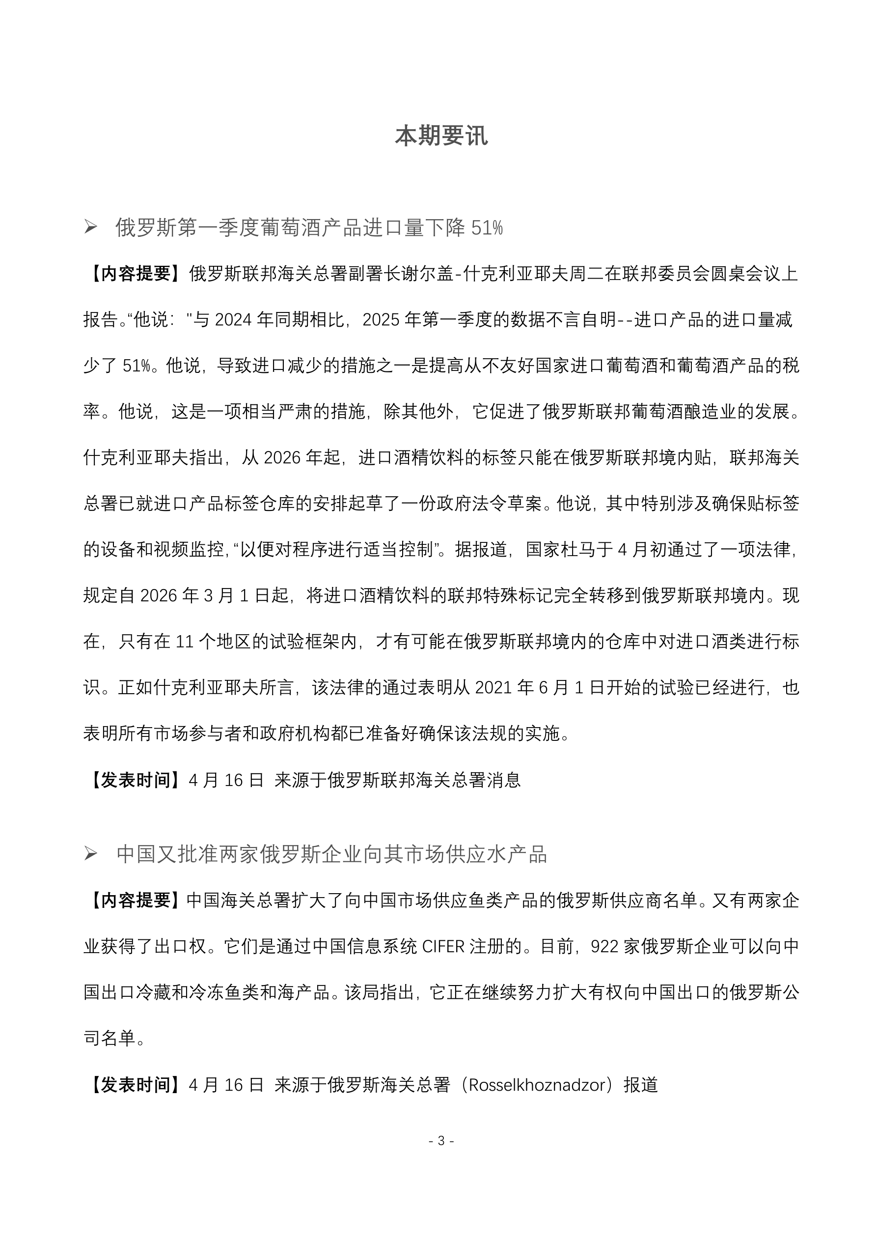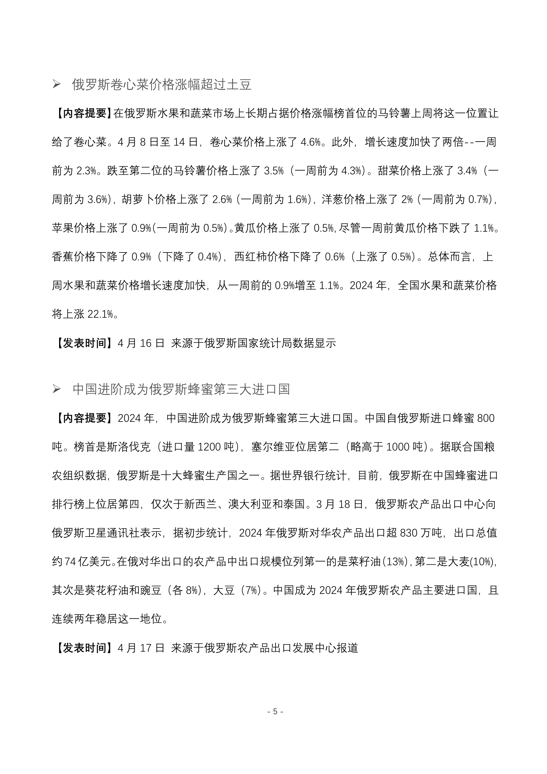 俄预计 2030 年前蜂蜜出口额或能达到 7297 万人民币。 (4 月 17 日 俄罗斯农产品出口发展中心预测) 俄 2024 年农工综合体出口产品价值 3108 亿人民币 2023 年为 3145 亿人民币。 (4 月 16 日 俄罗斯联邦海关总署统计数据) 俄 2024 年外贸总额为 5.23 万亿人民币 其中出口额为 3.16 万亿人民币 进口额为 2.06 万亿人民币。 (4 月 17 日 俄罗斯联邦海关局数据显示) 俄 2024 年消耗约 4370 万吨钢材。 (4 月 17 日 国际文传电讯社官网) 俄 2024 年企业的 IT 产品和 IT 服务销售额为 3182.4 亿人民币。 (4 月 17 日 国际文传电讯社官网) 俄 1~2 月份生产乙醇 1291 万升 比 2024 年同期减少 18.1%。 (4 月 17 日 俄罗斯商业新闻官网) 俄对塞尔维亚的蜂蜜出口量增长 2.3 倍 超过 1000 吨。 (4 月 17 日 俄罗斯农业出口发展中心报道) 俄 2024 年出口 590 万公升乙醇 进口 1100...