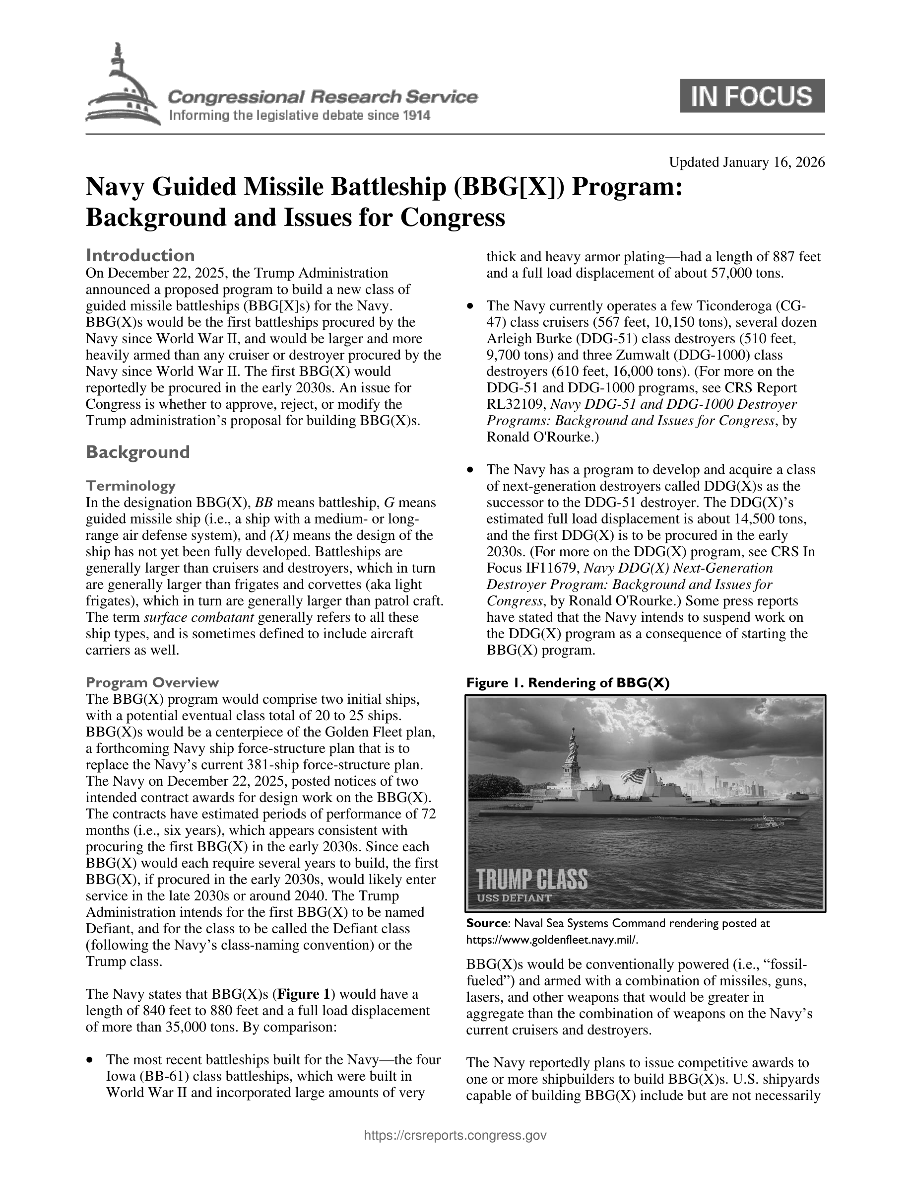 On December 22, 2025, the Trump Administration announced a proposed program to build a new class of guided missile battleships (BBG[X]s) for the Navy. BBG(X)s would be the first battleships procured by the Navy since World War II, and would be larger and more heavily armed than any cruiser or destroyer procured by the Navy since World War II. The first BBG(X) would reportedly...