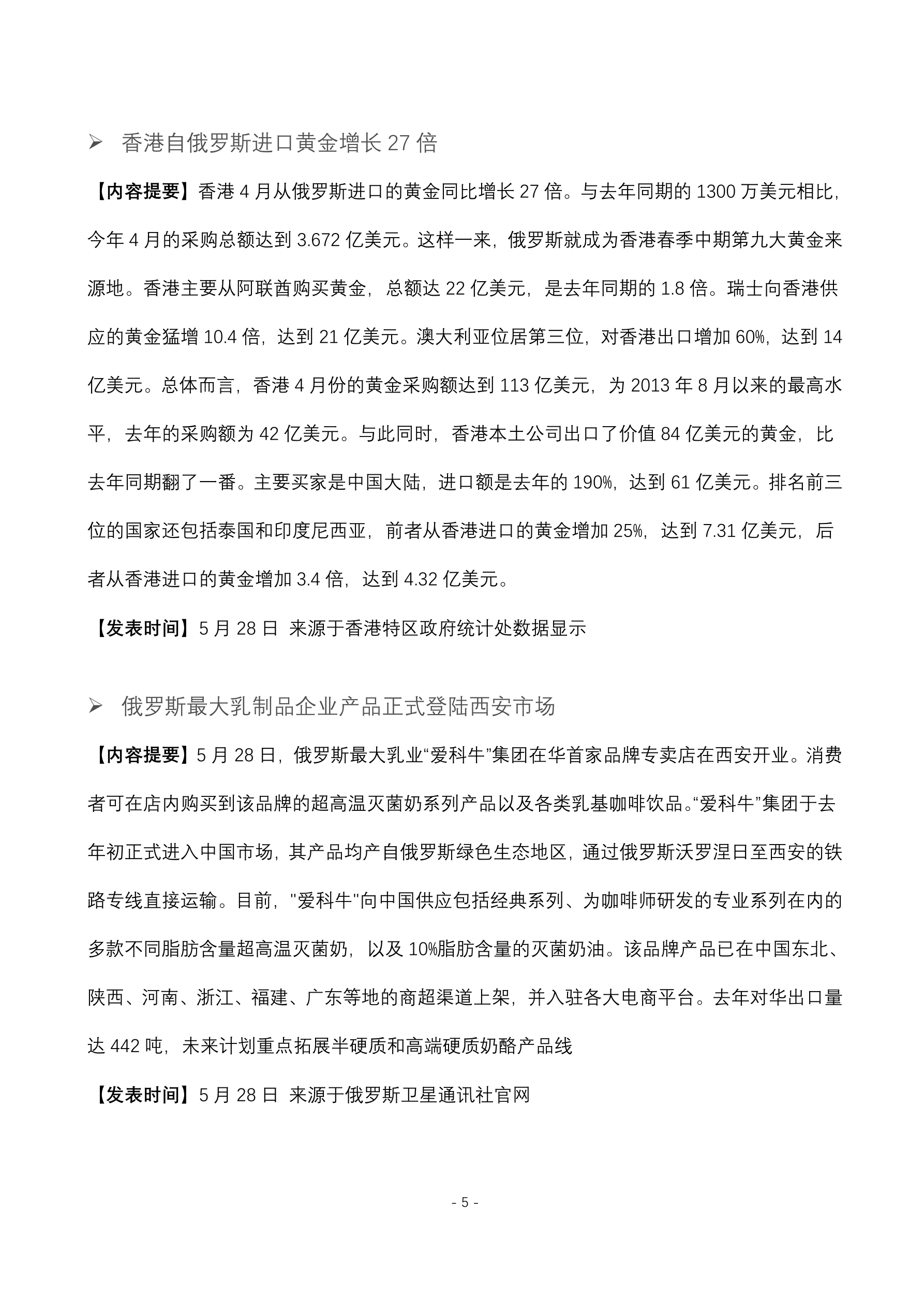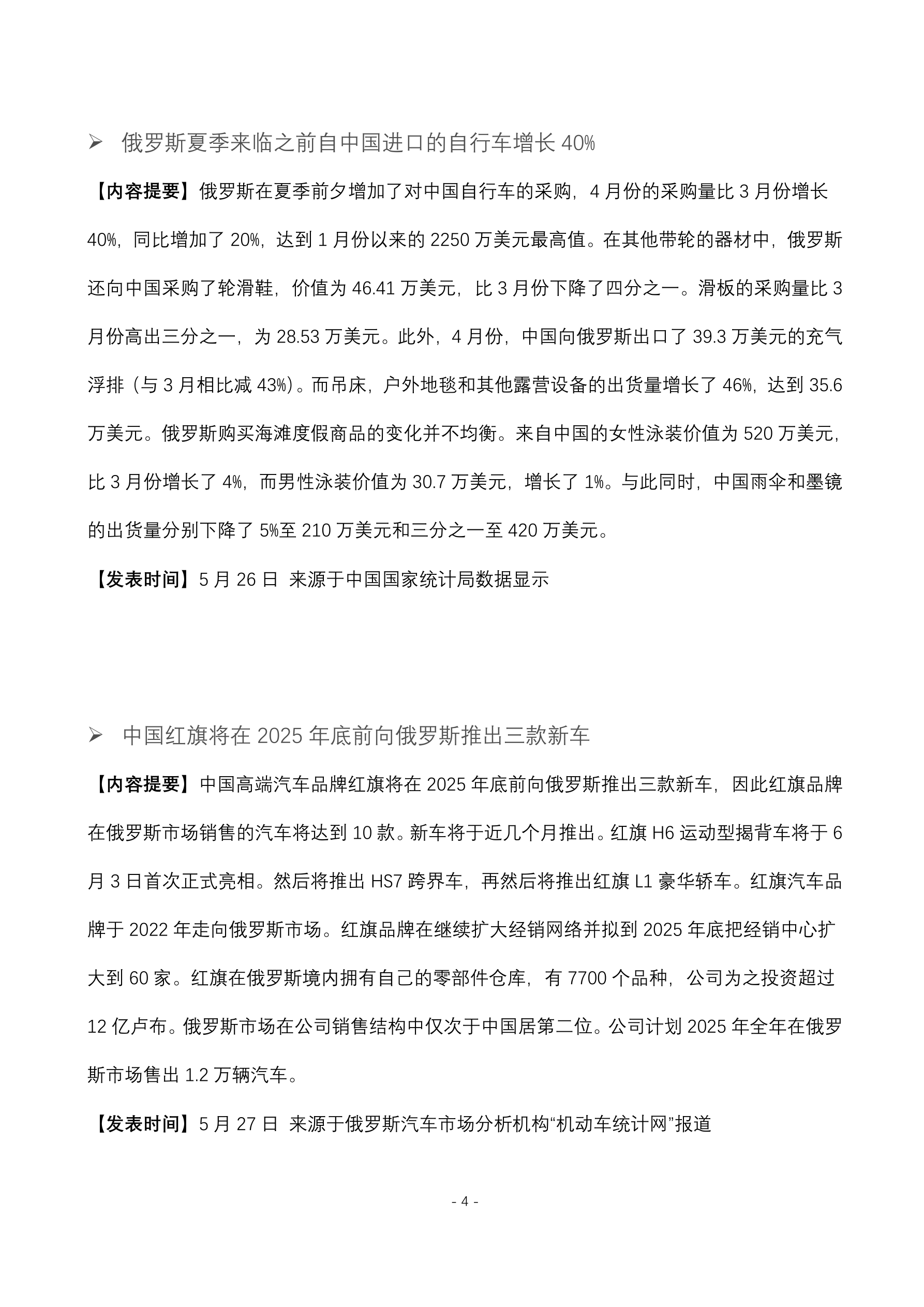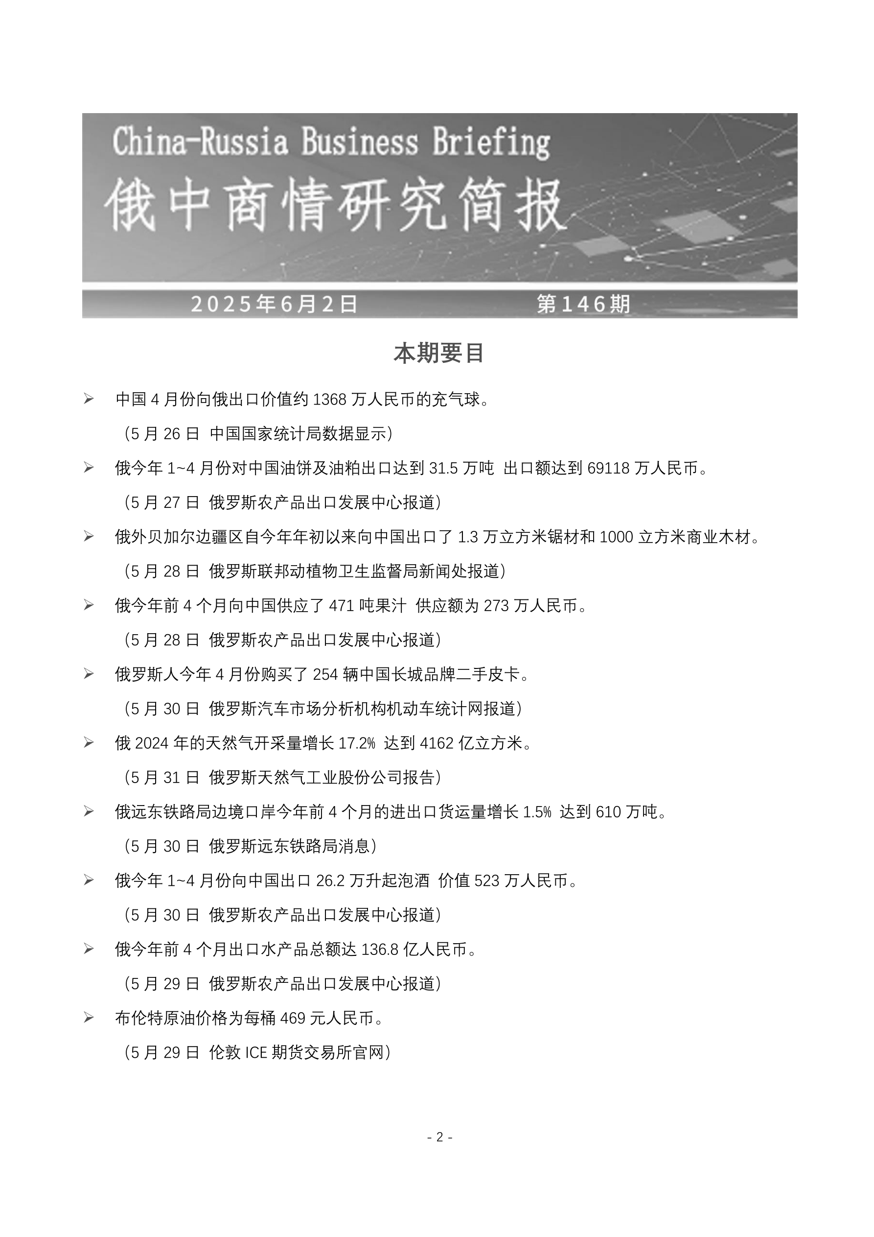 中国 4 月份向俄出口价值约 1368 万人民币的充气球。 (5 月 26 日 中国国家统计局数据显示) 俄今年 1~4 月份对中国油饼及油粕出口达到 31.5 万吨 出口额达到 69118 万人民币。 (5 月 27 日 俄罗斯农产品出口发展中心报道) 俄外贝加尔边疆区自今年年初以来向中国出口了 1.3 万立方米锯材和 1000 立方米商业木材。 (5 月 28 日 俄罗斯联邦动植物卫生监督局新闻处报道) 俄今年前 4 个月向中国供应了 471 吨果汁 供应额为 273 万人民币。 (5 月 28 日 俄罗斯农产品出口发展中心报道) 俄罗斯人今年 4 月份购买了 254 辆中国长城品牌二手皮卡。 (5 月 30 日 俄罗斯汽车市场分析机构机动车统计网报道) 俄 2024 年的天然气开采量增长 17.2% 达到 4162 亿立方米。 (5 月 31 日 俄罗斯天然气工业股份公司报告) 俄远东铁路局边境口岸今年前 4 个月的进出口货运量增长 1.5% 达到 610 万吨。 (5 月 30 日 俄罗斯远东铁路局消息) 俄今年 1~...