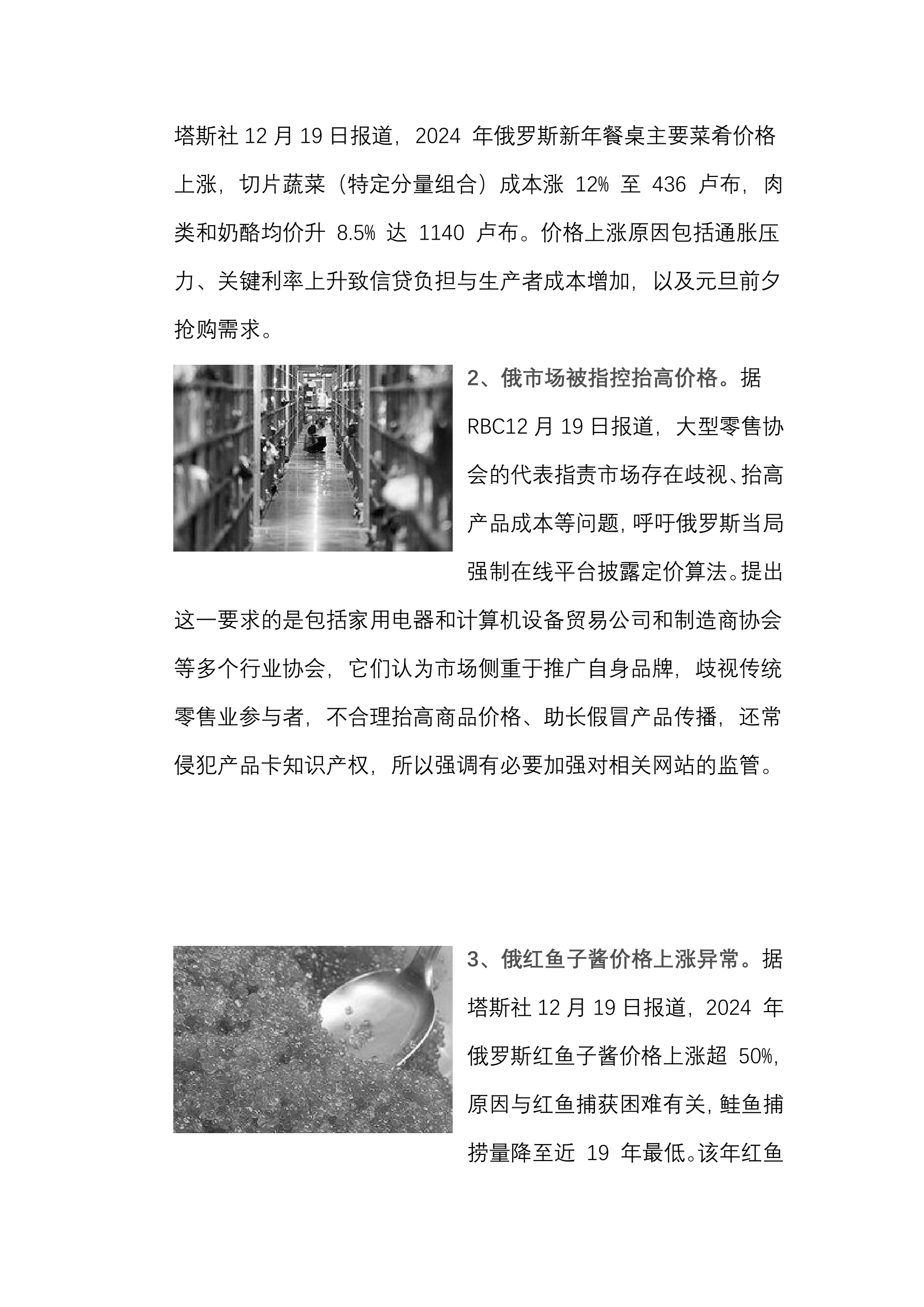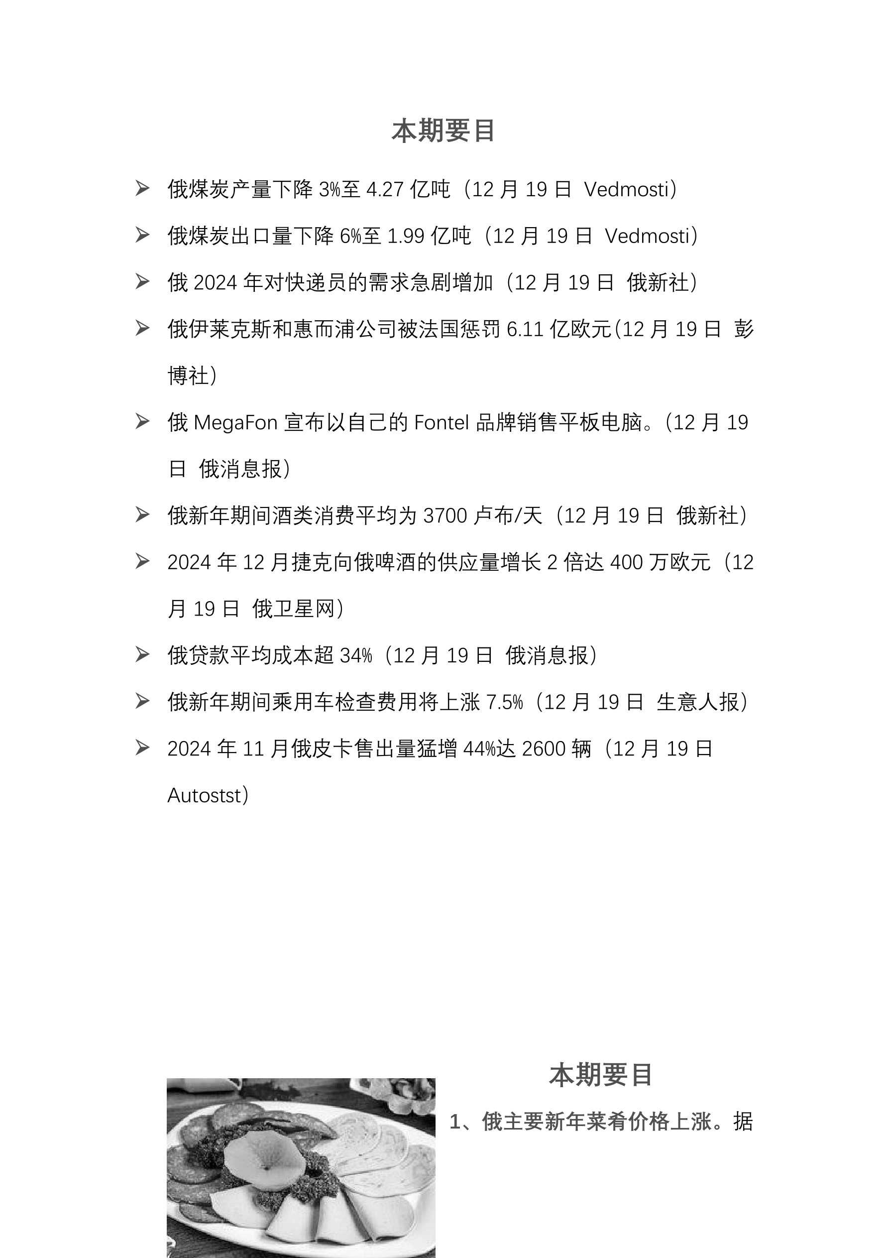 俄煤炭产量下降 3%至 4.27 亿吨(12 月 19 日 Vedmosti) 俄煤炭出口量下降 6%至 1.99 亿吨(12 月 19 日 Vedmosti) 俄 2024 年对快递员的需求急剧增加(12 月 19 日 俄新社) 俄伊莱克斯和惠而浦公司被法国惩罚 6.11 亿欧元 (12 月 19 日 彭 博社) 俄 MegaFon 宣布以自己的 Fontel 品牌销售平板电脑。 (12 月 19 日 俄消息报) 俄新年期间酒类消费平均为 3700 卢布/天(12 月 19 日 俄新社) 2024 年 12 月捷克向俄啤酒的供应量增长 2 倍达 400 万欧元(12 月 19 日 俄卫星网) 俄贷款平均成本超 34%(12 月 19 日 俄消息报) 俄新年期间乘用车检查费用将上涨 7.5%(12 月 19 日 生意人报) 2024 年 11 月俄皮卡售出量猛增 44%达 2600 辆(12 月 19 日 Autostst)