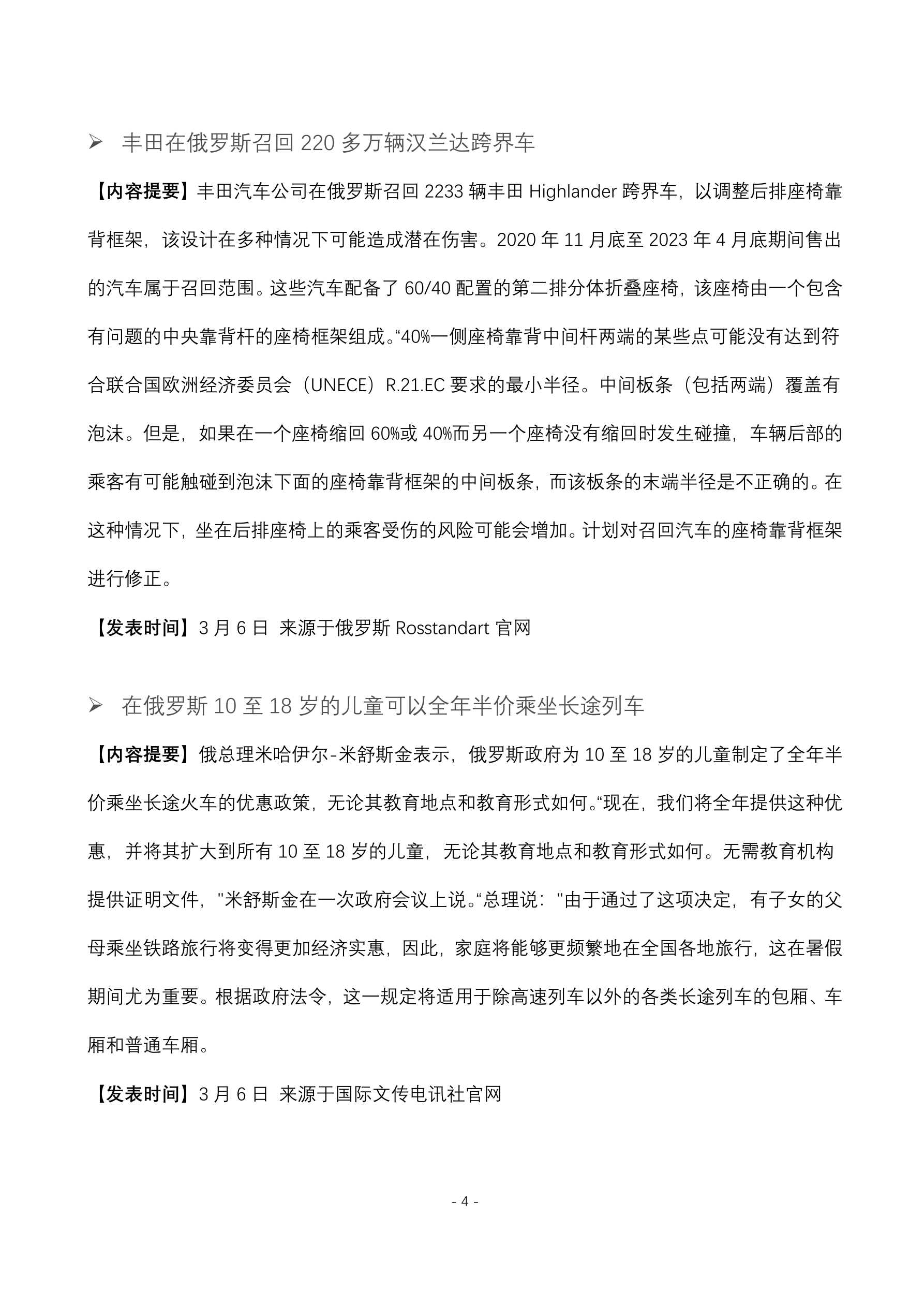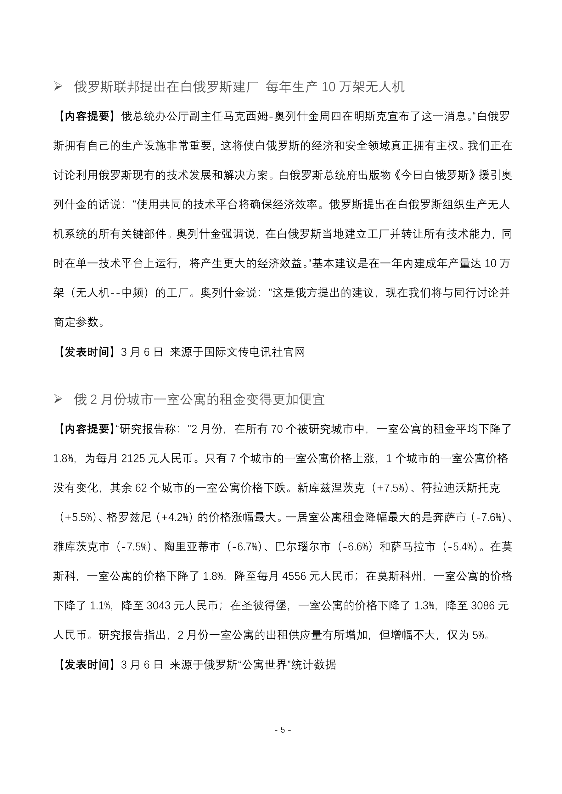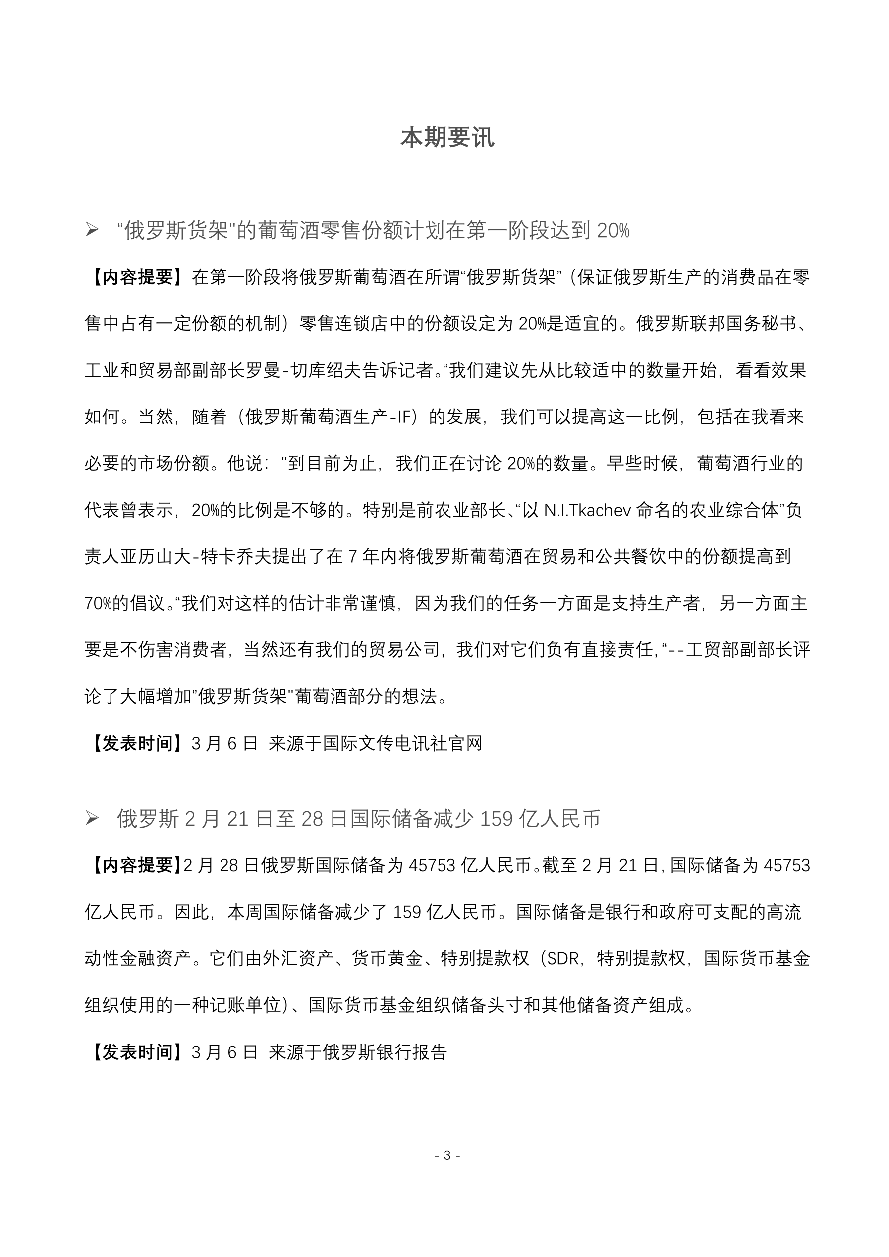俄 1 月至 2 月通过俄铁路网出口的煤炭与去年同期相比增加 3.8% 达到 3050 万吨。 (3 月 6 日 俄罗斯铁路公司报道) 俄 2 月份乘用车销量为 77296 辆 同比下降 25.2%。 (3 月 6 日 俄罗斯工业和贸易部报告) 俄 2024 年作物甜菜糖产量为 608 万吨,同比下降 8.1%。 (3 月 7 日 Soyuzrossakhar 公司分析部门报告) 俄本周国家基金出售的谷物数量为 1.08 万吨 比上周增加 23%。 (3 月 7 日 俄罗斯国家商品交易所) 俄罗斯对中国乳制品供应商增至 61 家。 (3 月 7 日 俄罗斯出口商协会报道) 俄罗斯人 2024 年总共获得 56.5 万多份申根签证 其中 50.85 万份用于旅游。 (3 月 7 日 Shengen.news 报道) 俄 1 月至 2 月的伏特加产量下降 26.3% 至 76 亿公升 。 (3 月 7 日 俄罗斯伏特加酒厂报道) 俄 1 月至 2 月的酒精饮料总产量为 1997.6 亿公升 比 2023 年同期减少 25.6%。 ...
