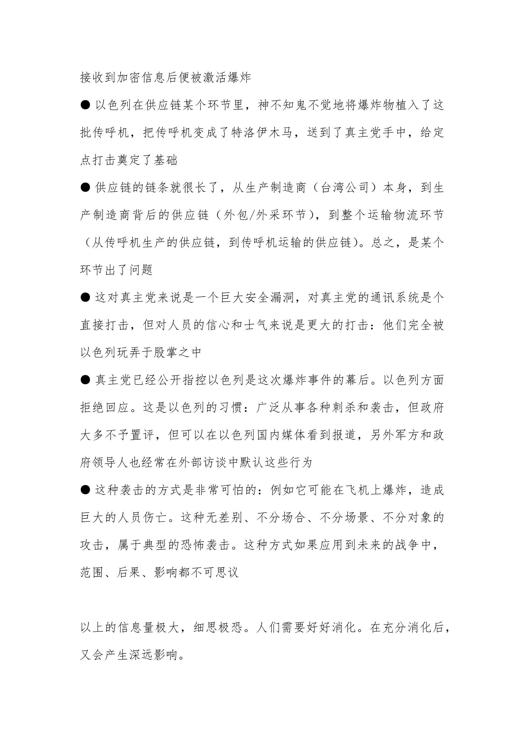 9 月 18 日,发生在中东的一则新闻引起热议:黎巴嫩数千个传呼机 爆炸,已导致 12 人死亡,约 2800 人受伤。截至本文发布时,黎巴 嫩又发生大量新的爆炸事件,涉及对讲机设备发生爆炸,又造成三 人死亡,数百人受伤。一开始有许多传闻,例如怀疑传呼机是摩托 罗拉的,但若干小时后,线索逐渐清晰: ● 黎巴嫩真主党向一家名为“金阿波罗” (Gold Apollo)的台湾制 造商公司订购了 5,000 个传呼机,设备型号为 AP924。设备可进行 无线接收,显示文本,但不能打电话 ● 真主党采用传呼机这种“古老”通讯手段的目的是为了规避以色 列/敌对方的定位追踪 ● 这批设备是新近制造的,今年春天被运到黎巴嫩 ● 使用该设备的是真主党成员,政治上的关联人员(伤者包括伊朗 驻贝鲁特大使) ,以及家属(死者中包括两个真主党议员的儿子,一 个真主党成员的女儿) ● 爆炸在黎巴嫩各地发生,超市,街头,餐厅……许多人在做日常 的事情。传呼机一下变成了小型炸弹,当事人普遍被炸伤眼部、手 部,不少需要截肢。而且传呼机爆炸不仅伤及当事人,还会伤及身 边人● 目前,...