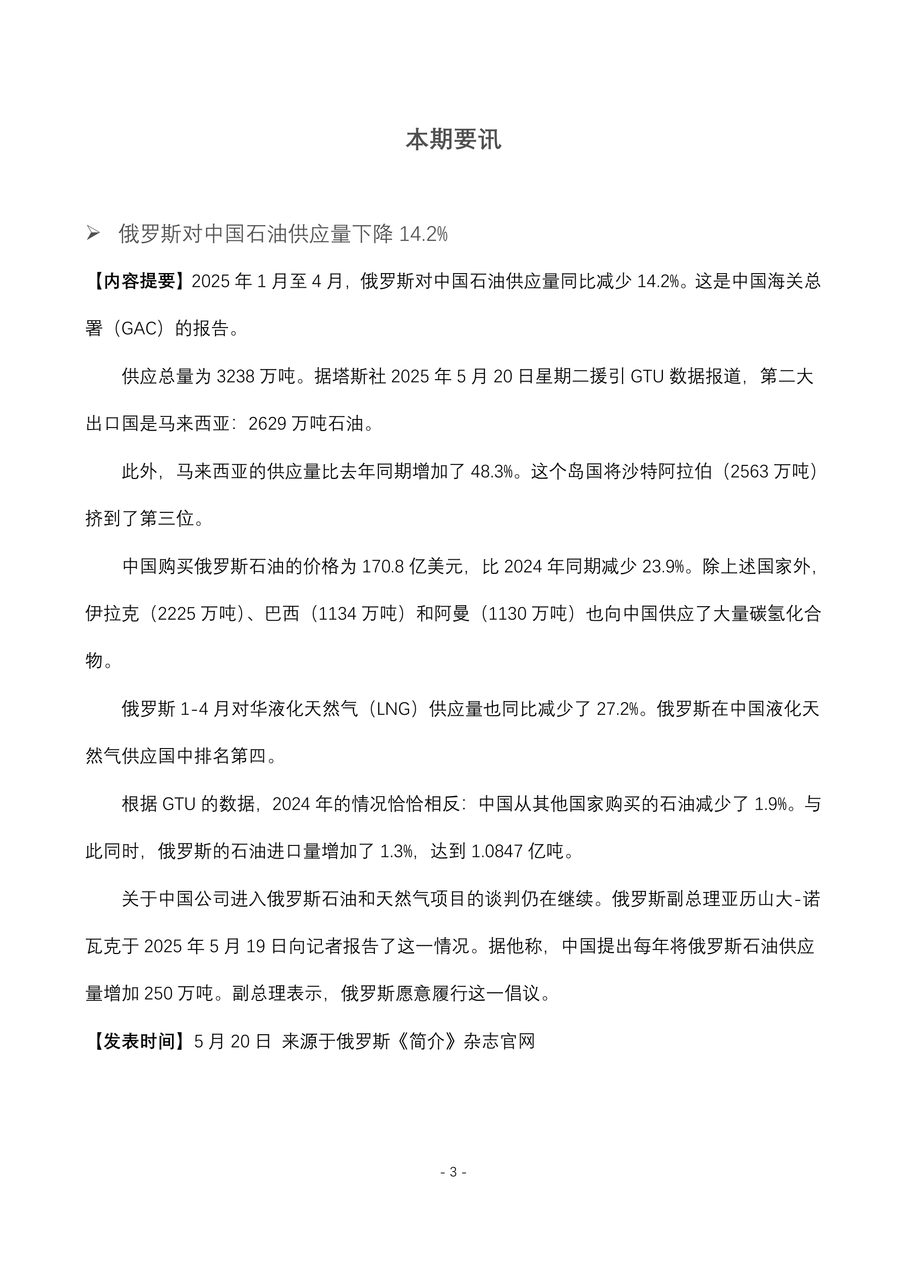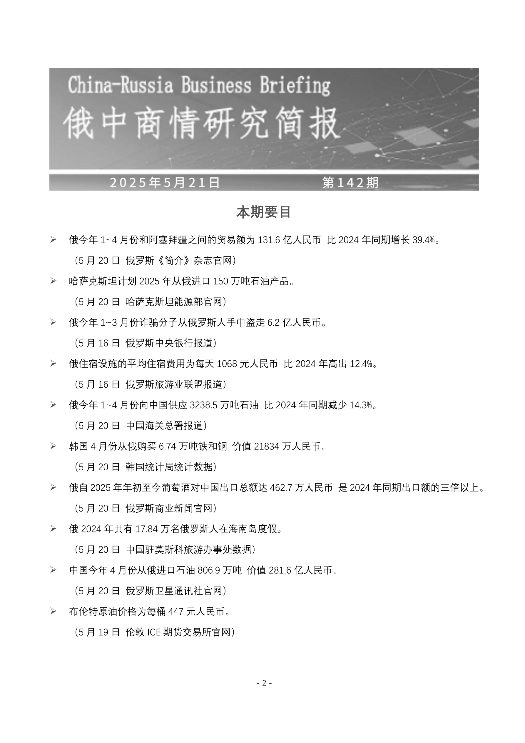 俄今年 1~4 月份和阿塞拜疆之间的贸易额为 131.6 亿人民币 比 2024 年同期增长 39.4%。 (5 月 20 日 俄罗斯《简介》杂志官网) 哈萨克斯坦计划 2025 年从俄进口 150 万吨石油产品。 (5 月 20 日 哈萨克斯坦能源部官网) 俄今年 1~3 月份诈骗分子从俄罗斯人手中盗走 6.2 亿人民币。 (5 月 16 日 俄罗斯中央银行报道) 俄住宿设施的平均住宿费用为每天 1068 元人民币 比 2024 年高出 12.4%。 (5 月 16 日 俄罗斯旅游业联盟报道) 俄今年 1~4 月份向中国供应 3238.5 万吨石油 比 2024 年同期减少 14.3%。 (5 月 20 日 中国海关总署报道) 韩国 4 月份从俄购买 6.74 万吨铁和钢 价值 21834 万人民币。 (5 月 20 日 韩国统计局统计数据) 俄自 2025 年年初至今葡萄酒对中国出口总额达 462.7 万人民币 是 2024 年同期出口额的三倍以上。 (5 月 20 日 俄罗斯商业新闻官网) 俄 2024 年共有 17.8...
