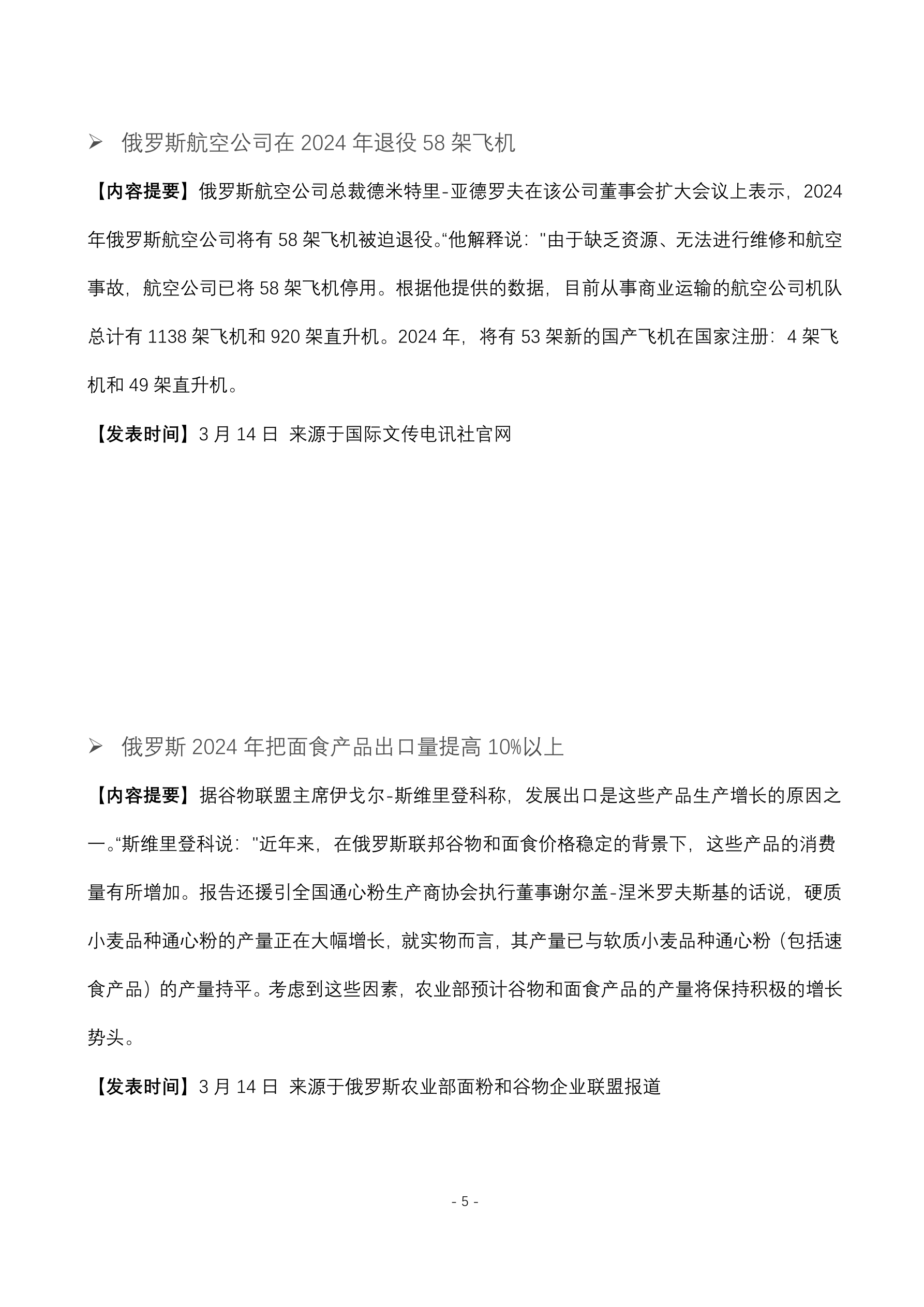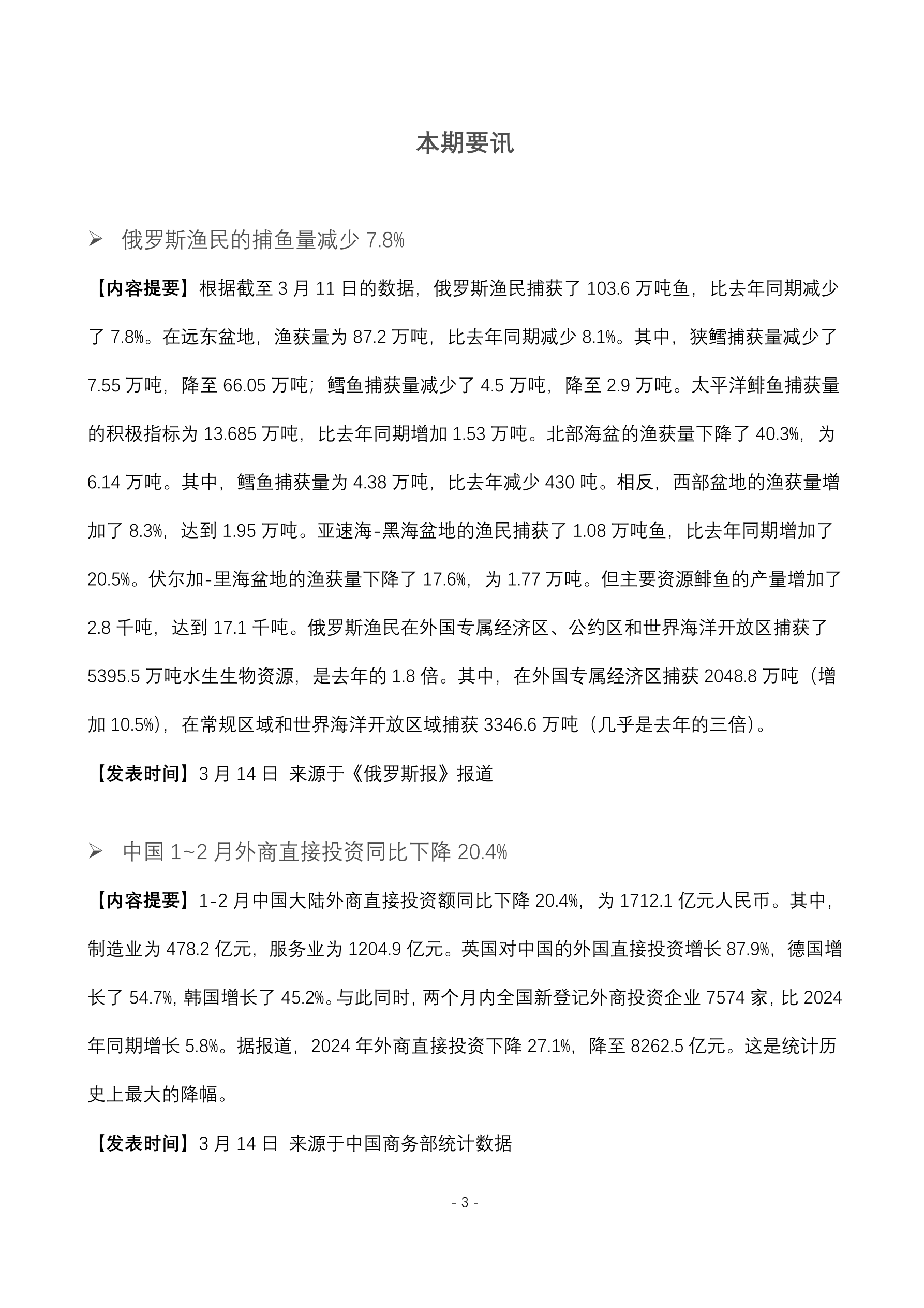 俄本周国家基金出售的粮食数量为 513 万吨 比上周几乎减少一倍。 (3 月 14 日 俄罗斯国家商品交易所) 俄中央银行将 2025 年银行利润预期上调至 2526~2947 亿人民币。 (3 月 14 日 俄罗斯联邦中央银行分析报告) 俄 1 月份面食产品产量增长 8.3% 达到 12 万吨。 (3 月 14 日 俄罗斯农业部报告) 俄 1 月份出口超过 650 万吨新鲜和冷冻螃蟹 比 2024 年 1 月增加 38%。 (3 月 14 日 俄罗斯农业出口中心报道) 中国 2024 年从俄进口活蟹鲜蟹和冻蟹的金额为 82.4 亿人民币 比 2023 年增加 16.7%。 (3 月 14 日 中国海关总署统计) 俄 2024 年对卡塔尔的农产品出口总额为 4.7 亿人民币。 (3 月 15 日 国际文传电讯社官网) 俄 2030 年粮食出口量可能超过 7500 万吨 出口额超 170 亿美元。 (3 月 17 日 俄罗斯农产品出口中心预测) 中国 2024 年从俄进口蟹和虾总价值为 94 亿人民币 比 2023 年增长 7%...